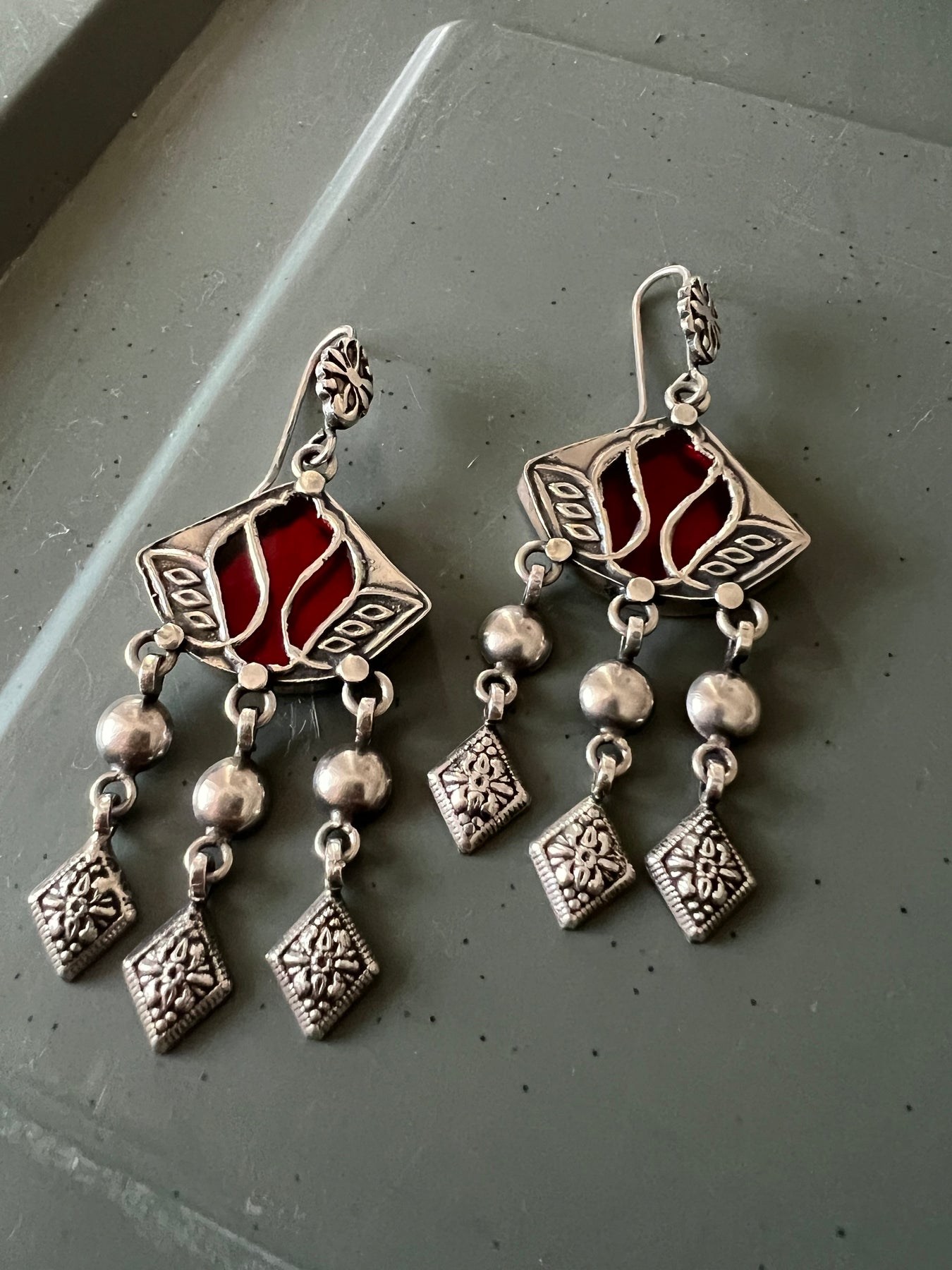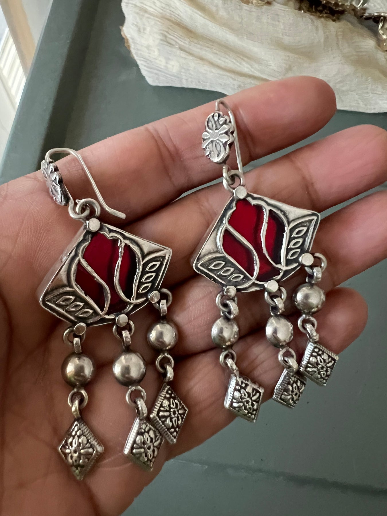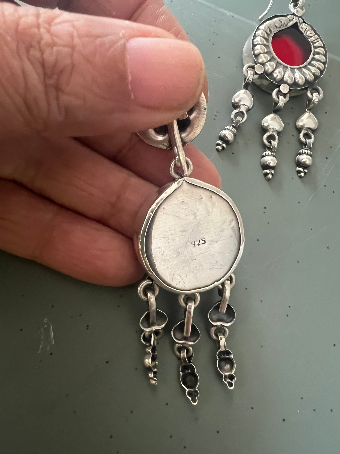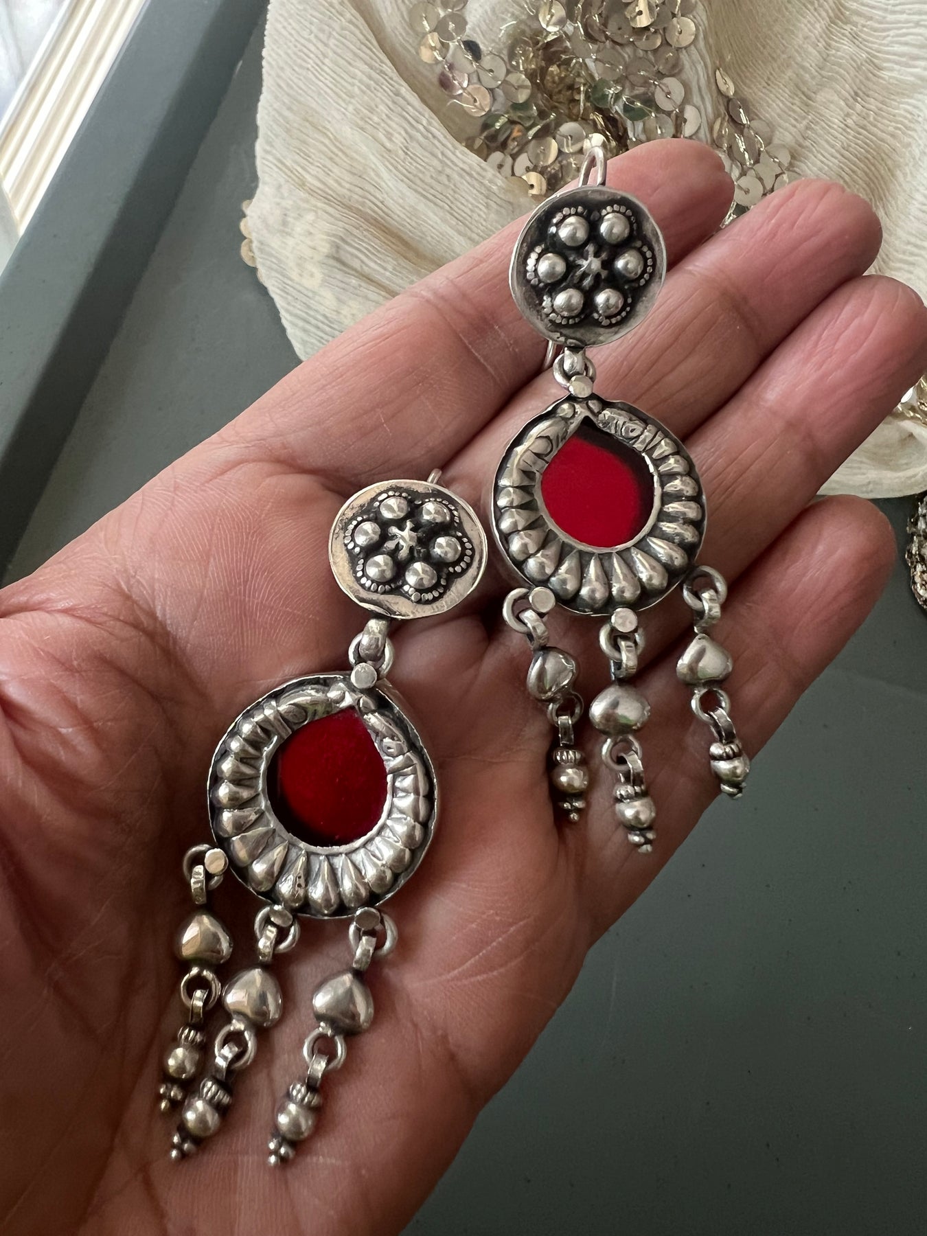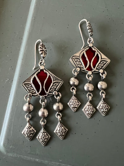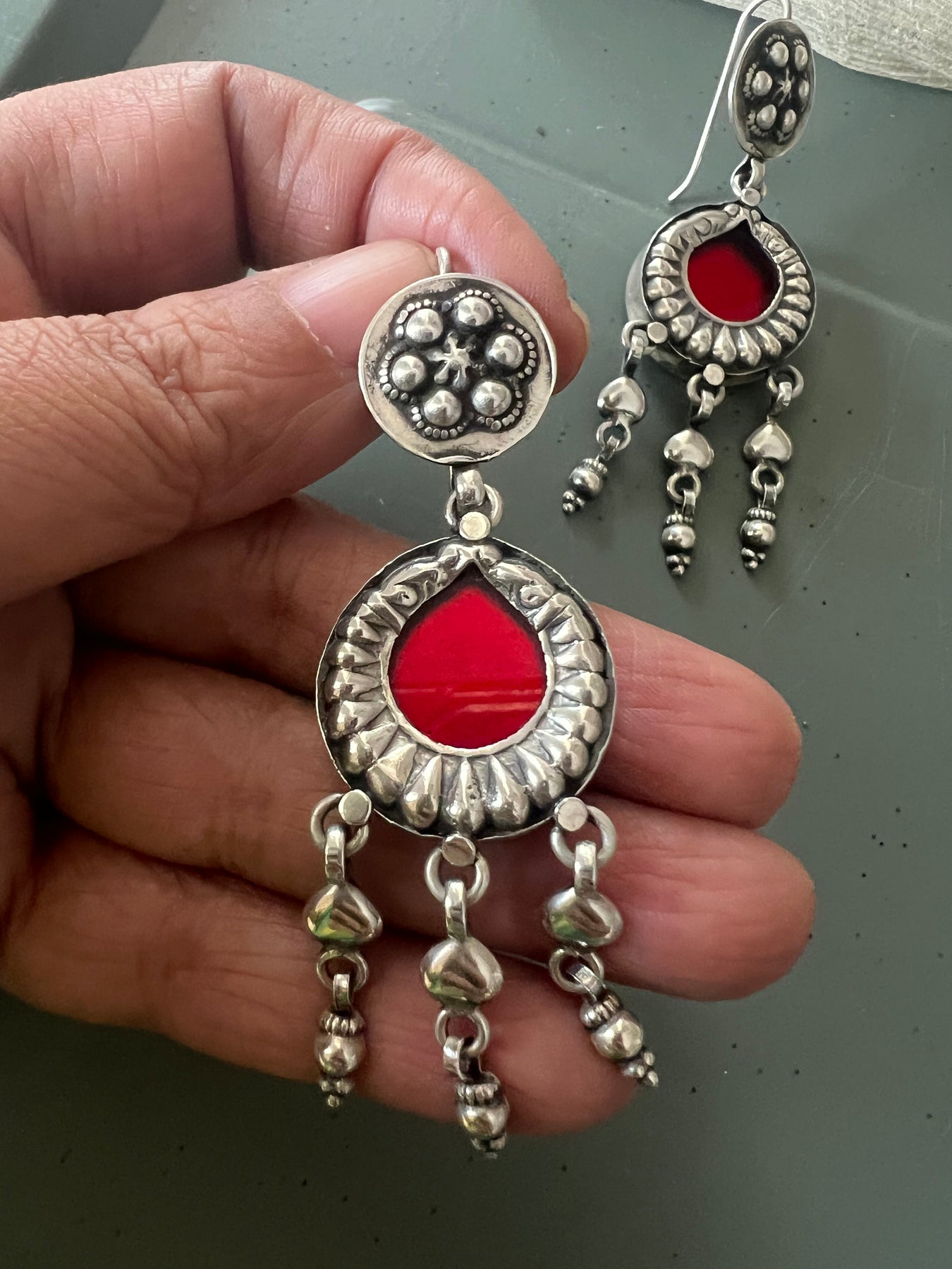 Deep Red Glass 925 Silver Earrings | SHIVKA | Hallmarked | 7.5x3 cm | 30g Pair | Push back Closure | Elegant Gift Jewelry