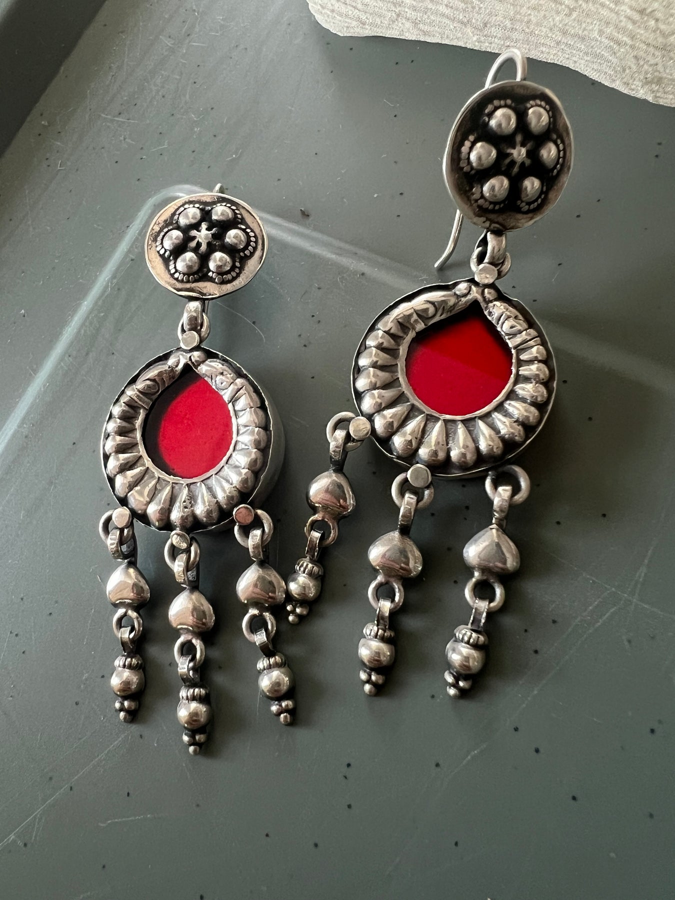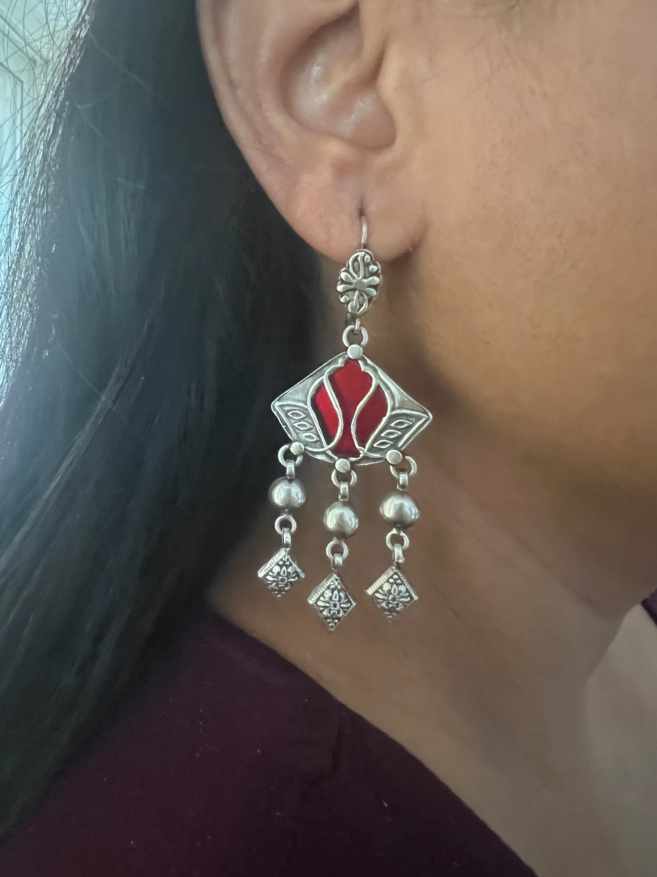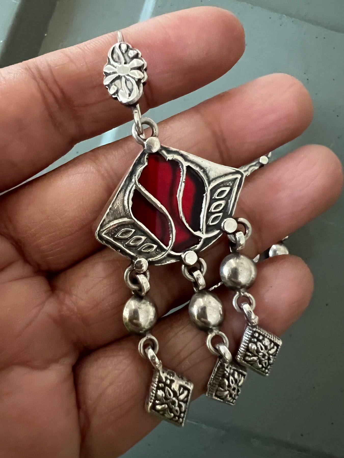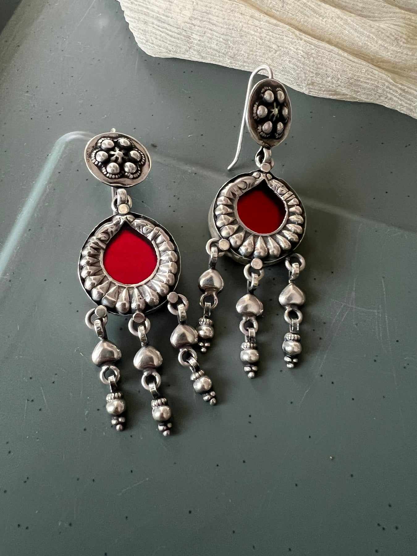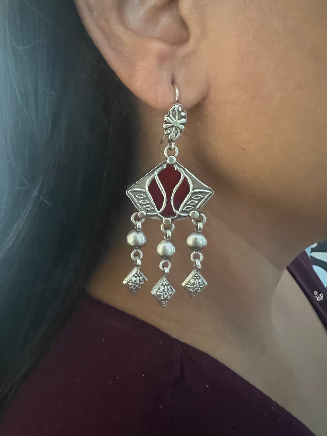Deep Red Glass 925 Silver Earrings | SHIVKA | Hallmarked | 7.5x3 cm | 30g Pair | Push back Closure | Elegant Gift Jewelry