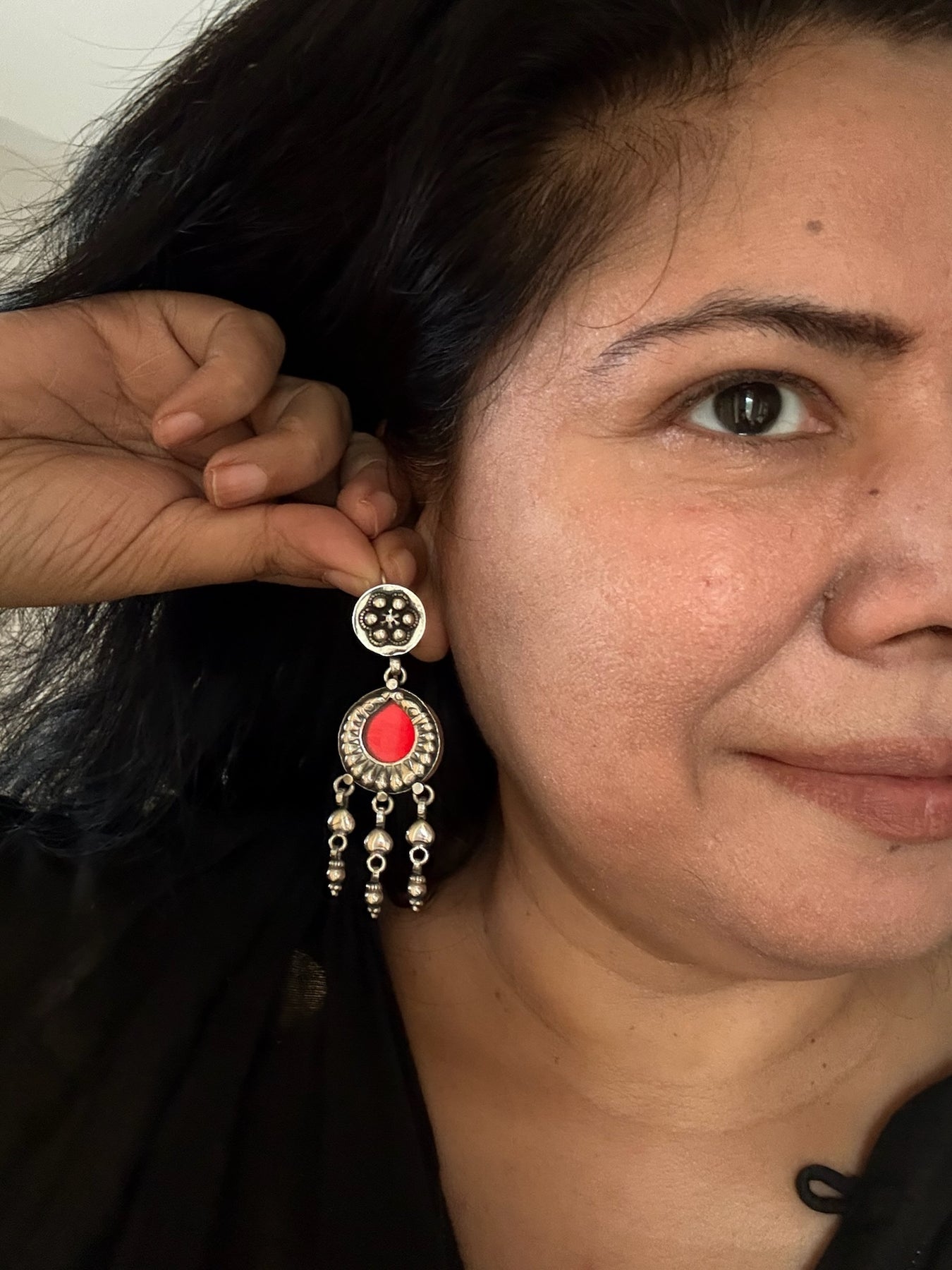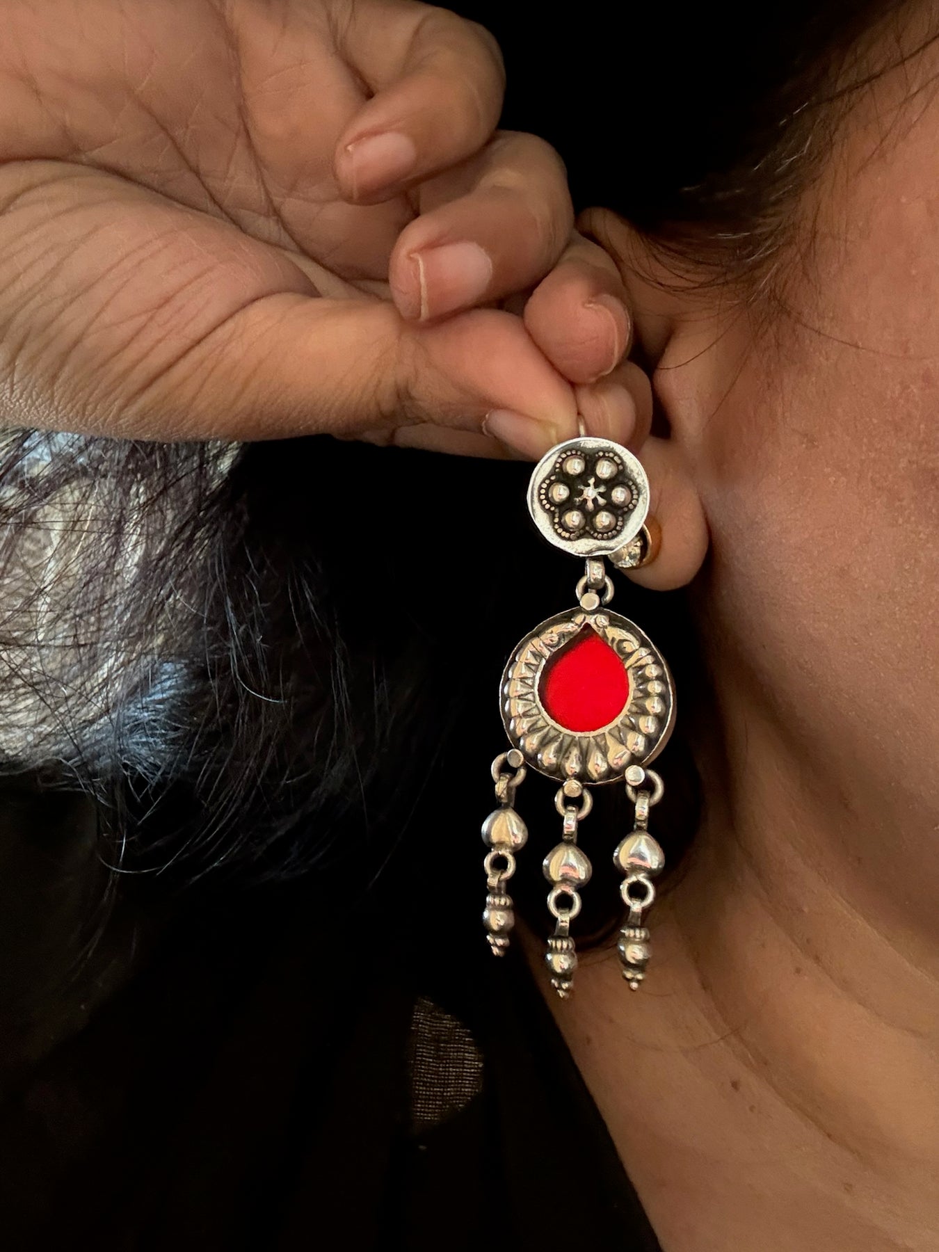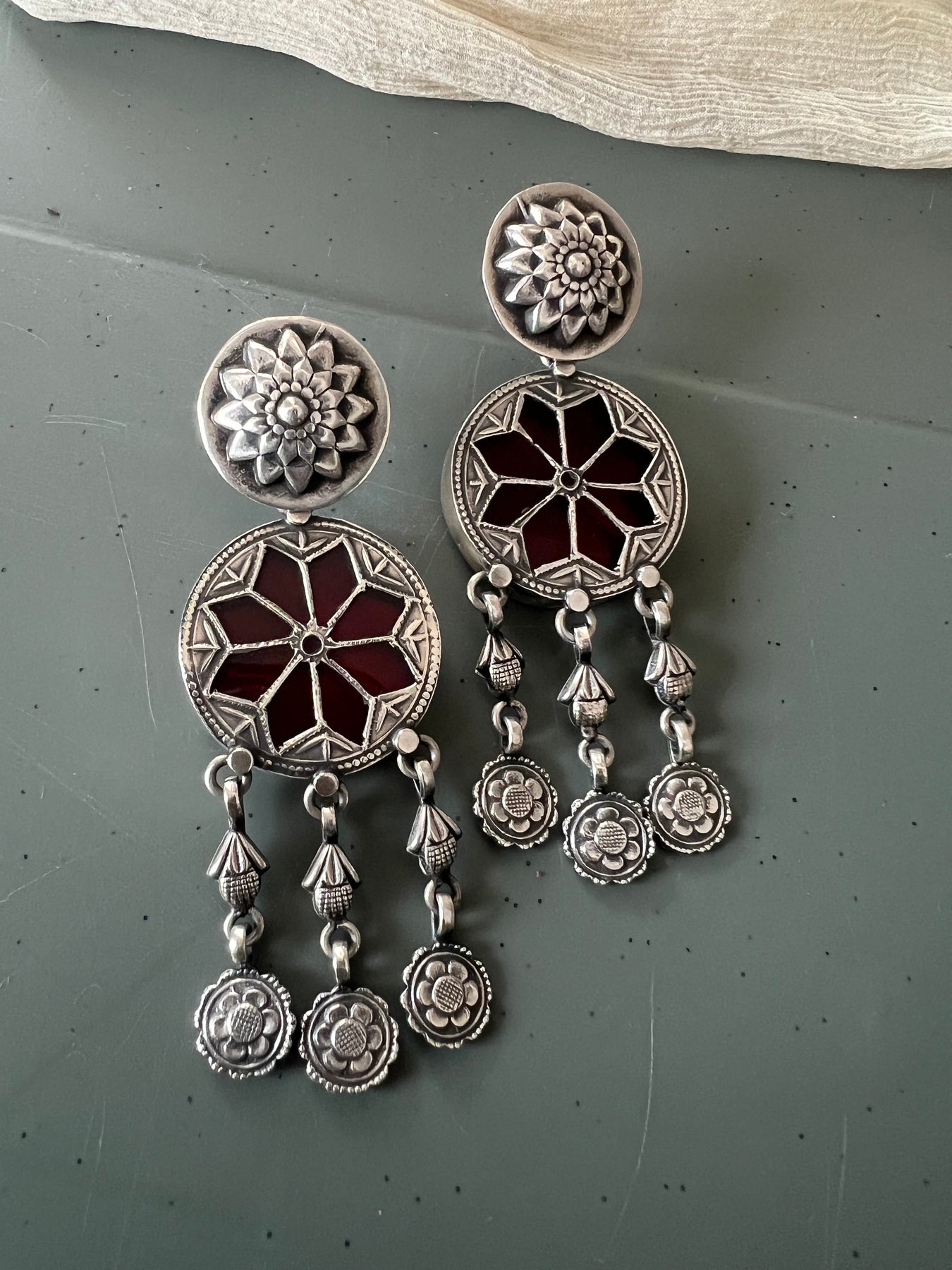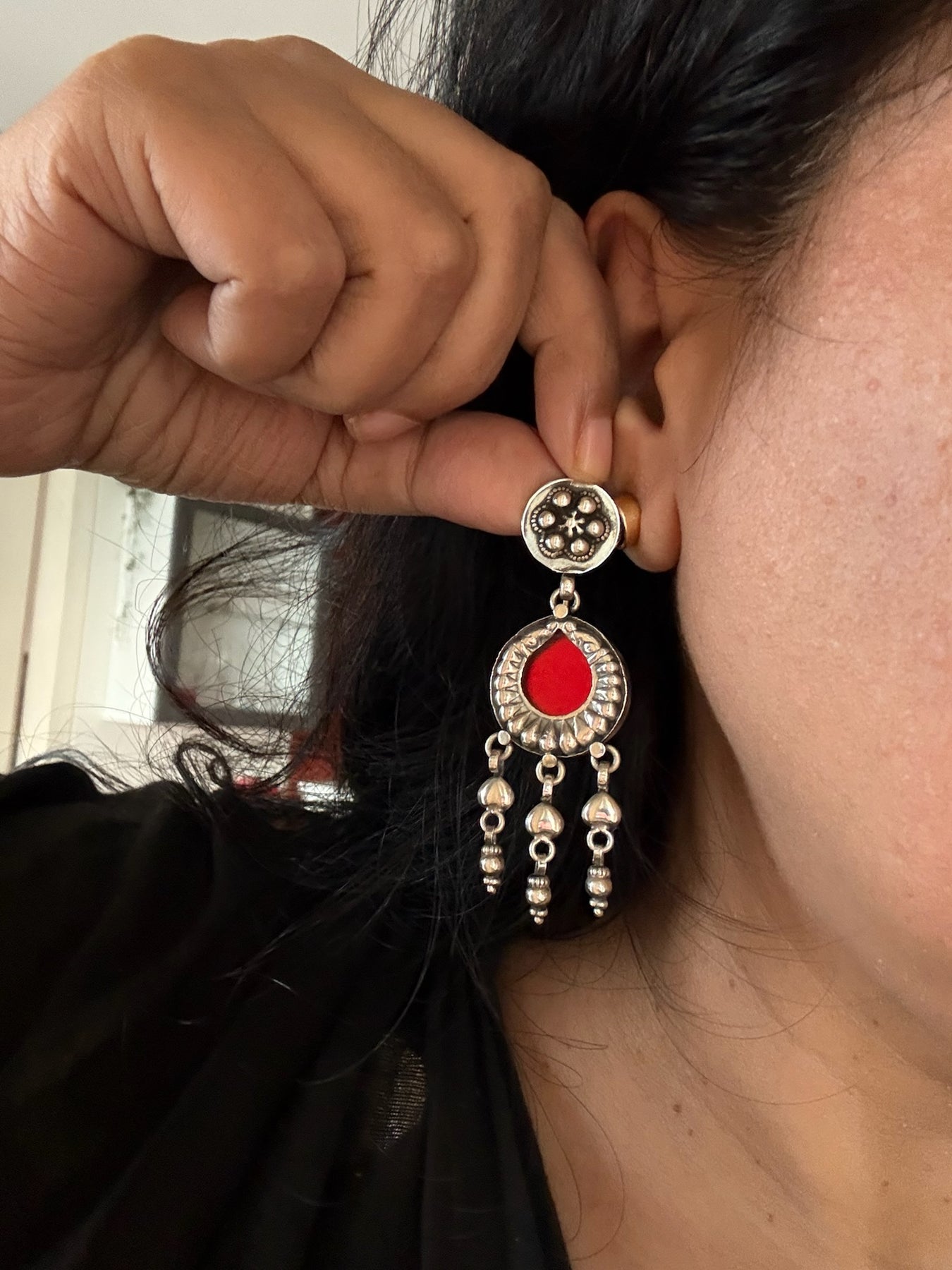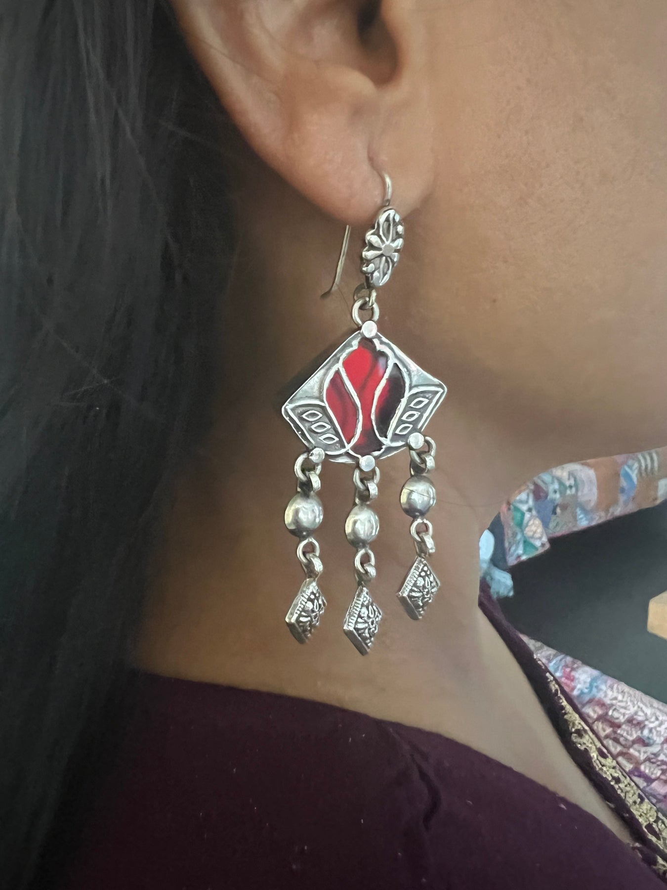 Deep Red Glass 925 Silver Earrings | SHIVKA | Hallmarked | 7.5x3 cm | 30g Pair | Push back Closure | Elegant Gift Jewelry