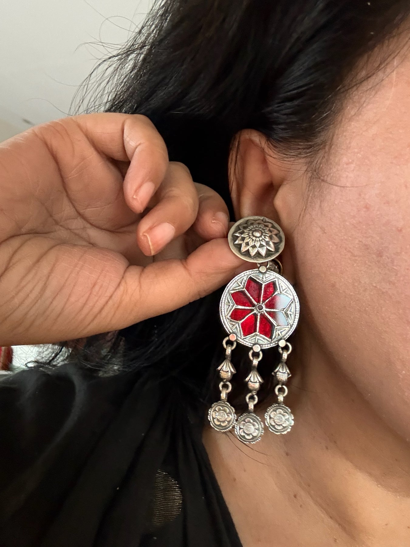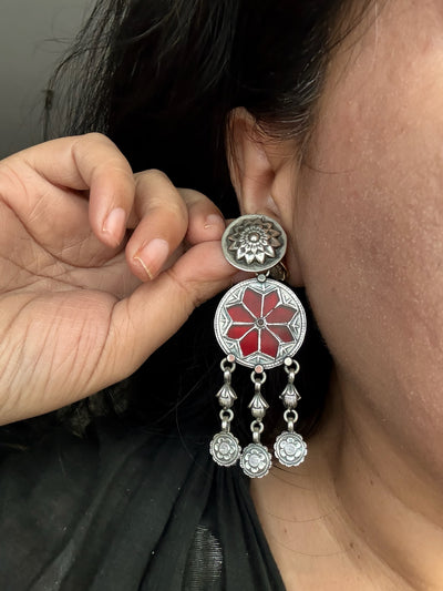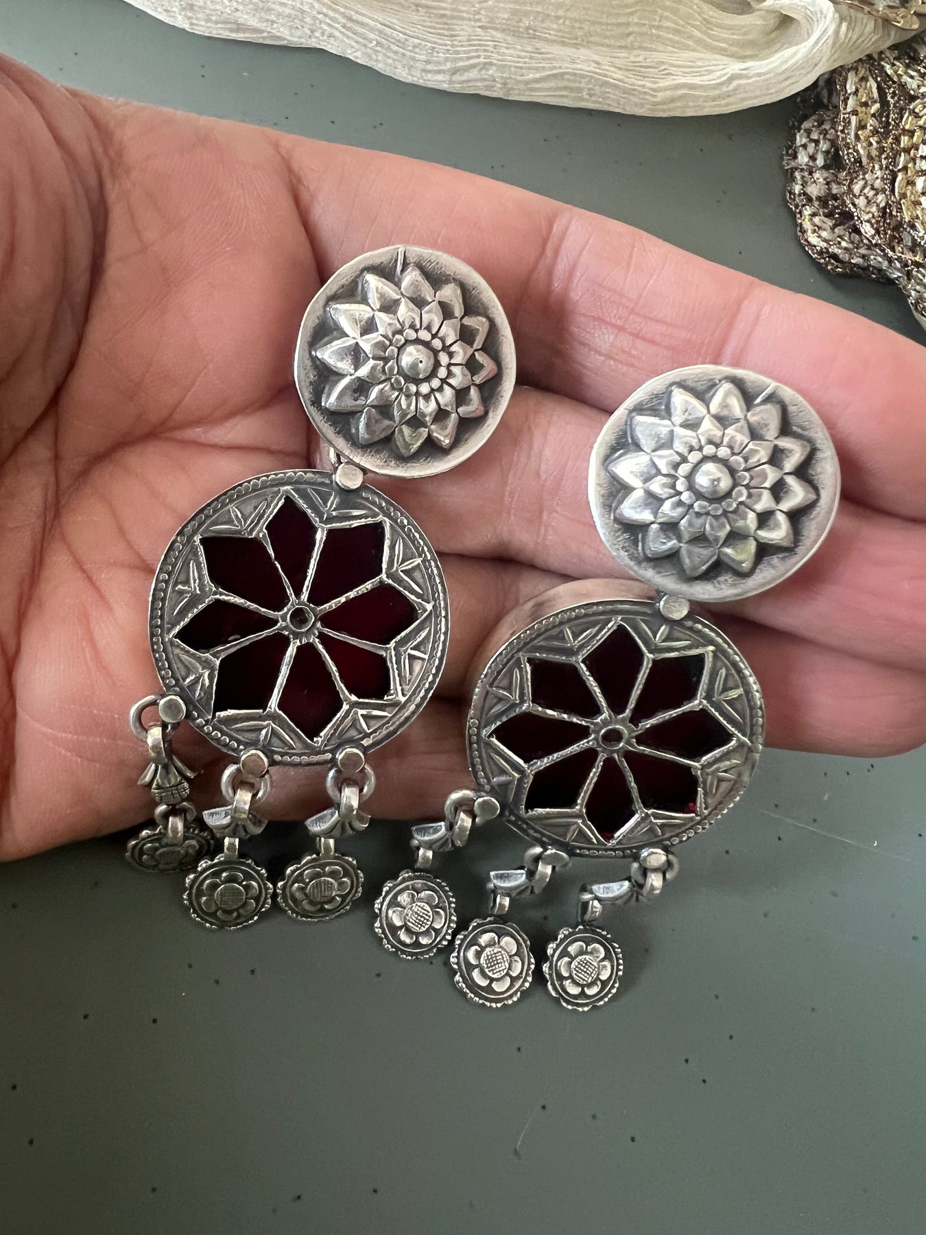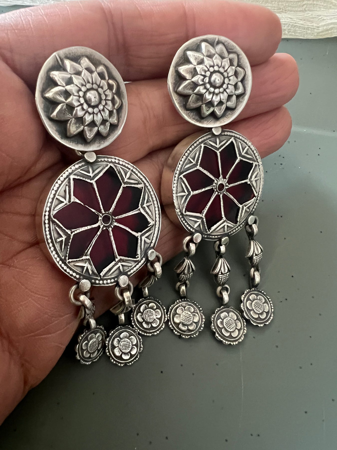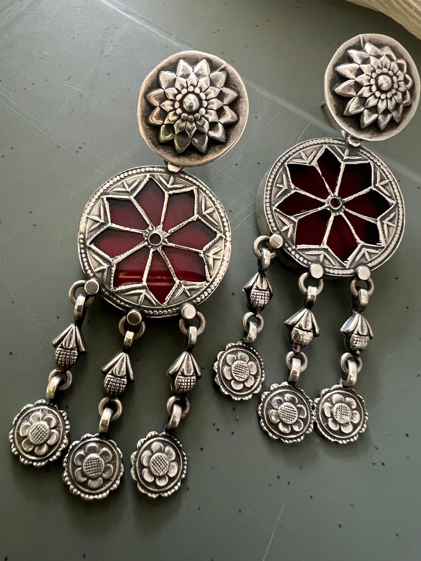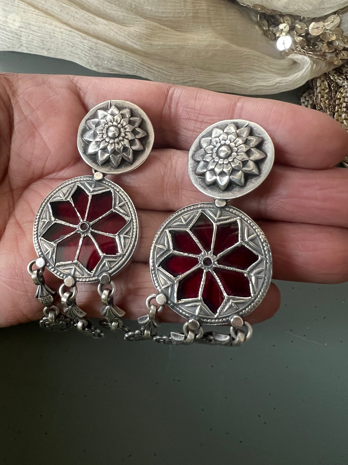 Deep Red Glass 925 Silver Earrings | SHIVKA | Hallmarked | 7.5x3 cm | 30g Pair | Push back Closure | Elegant Gift Jewelry
