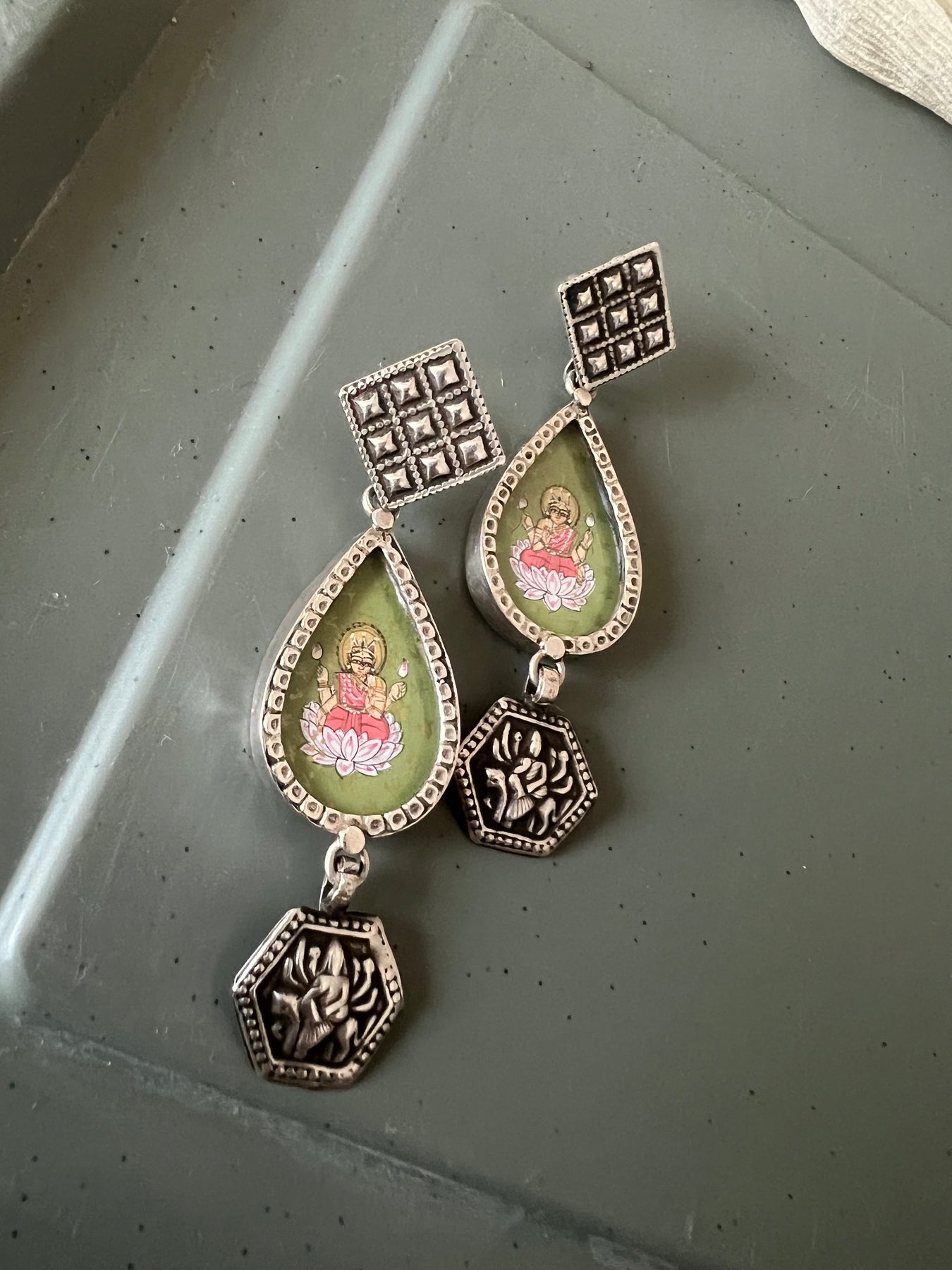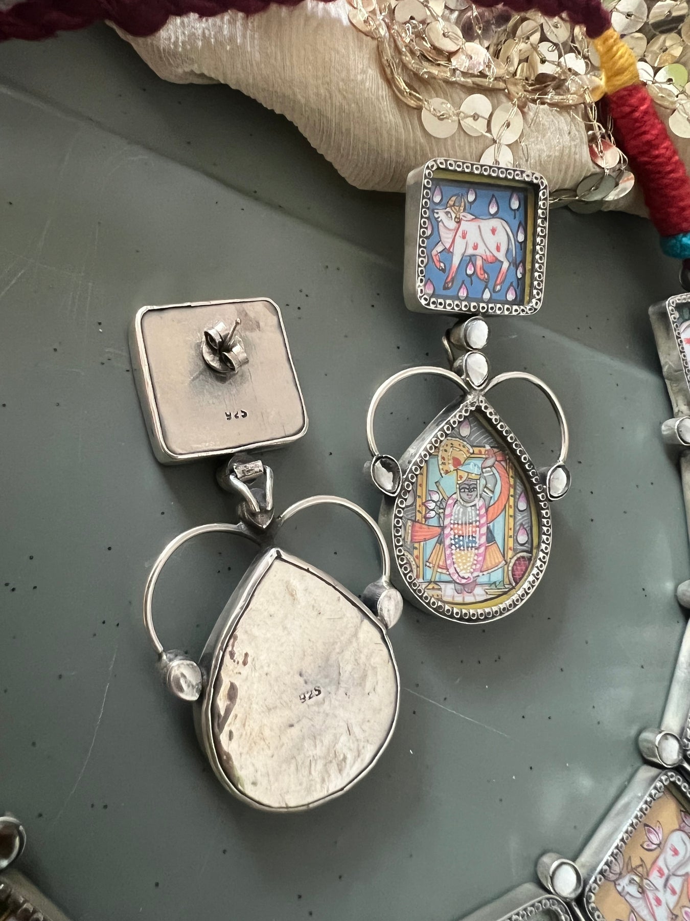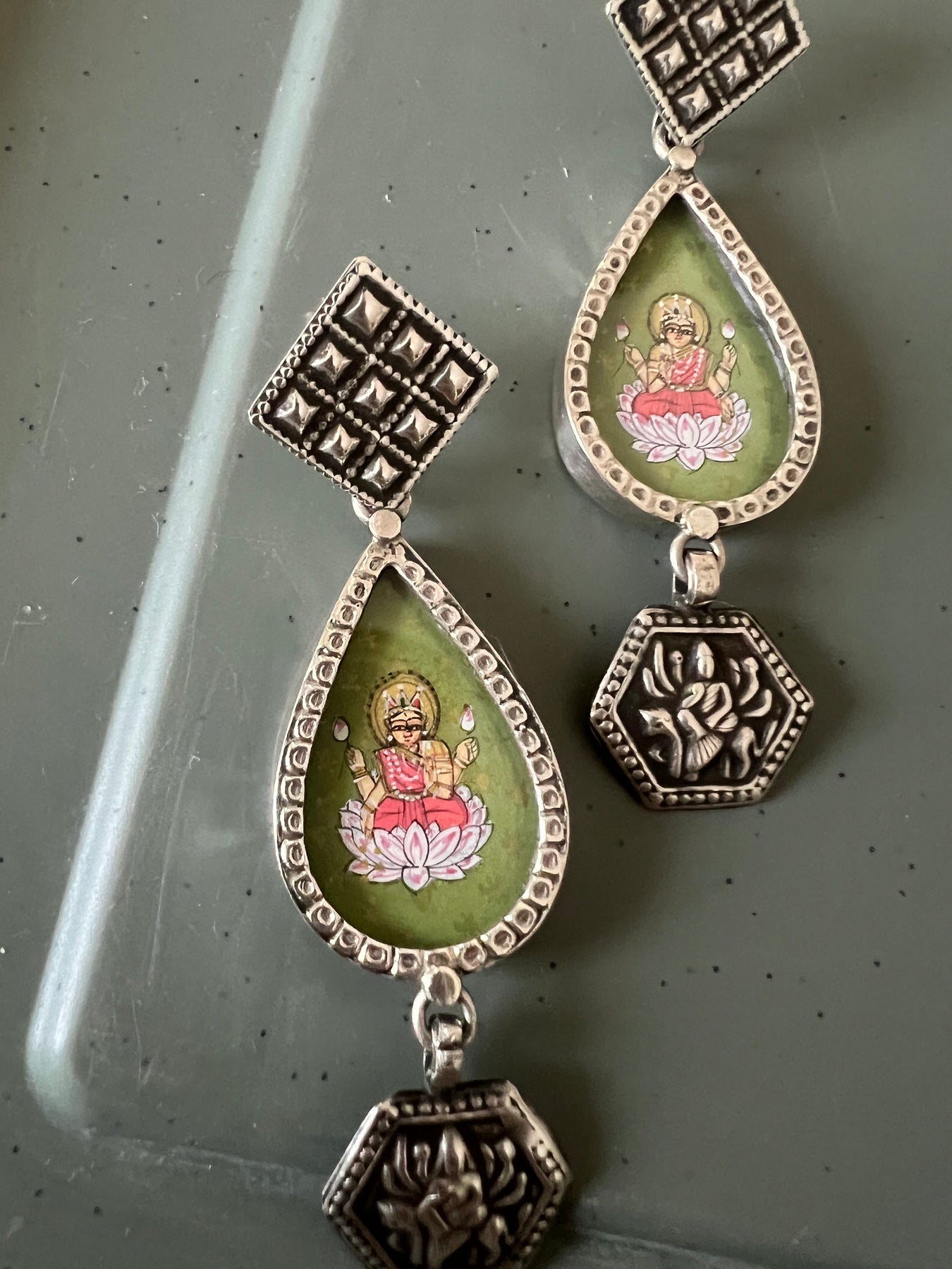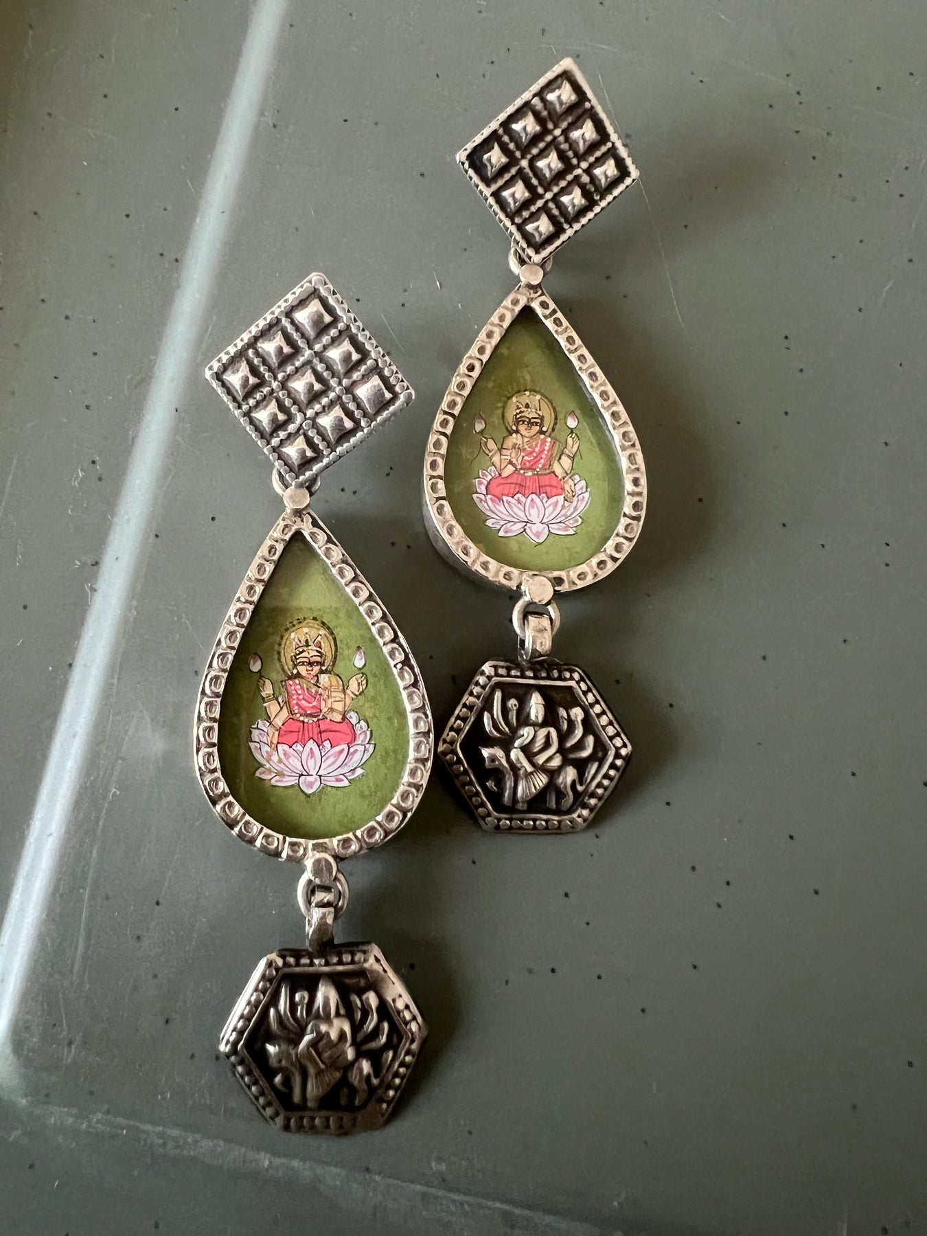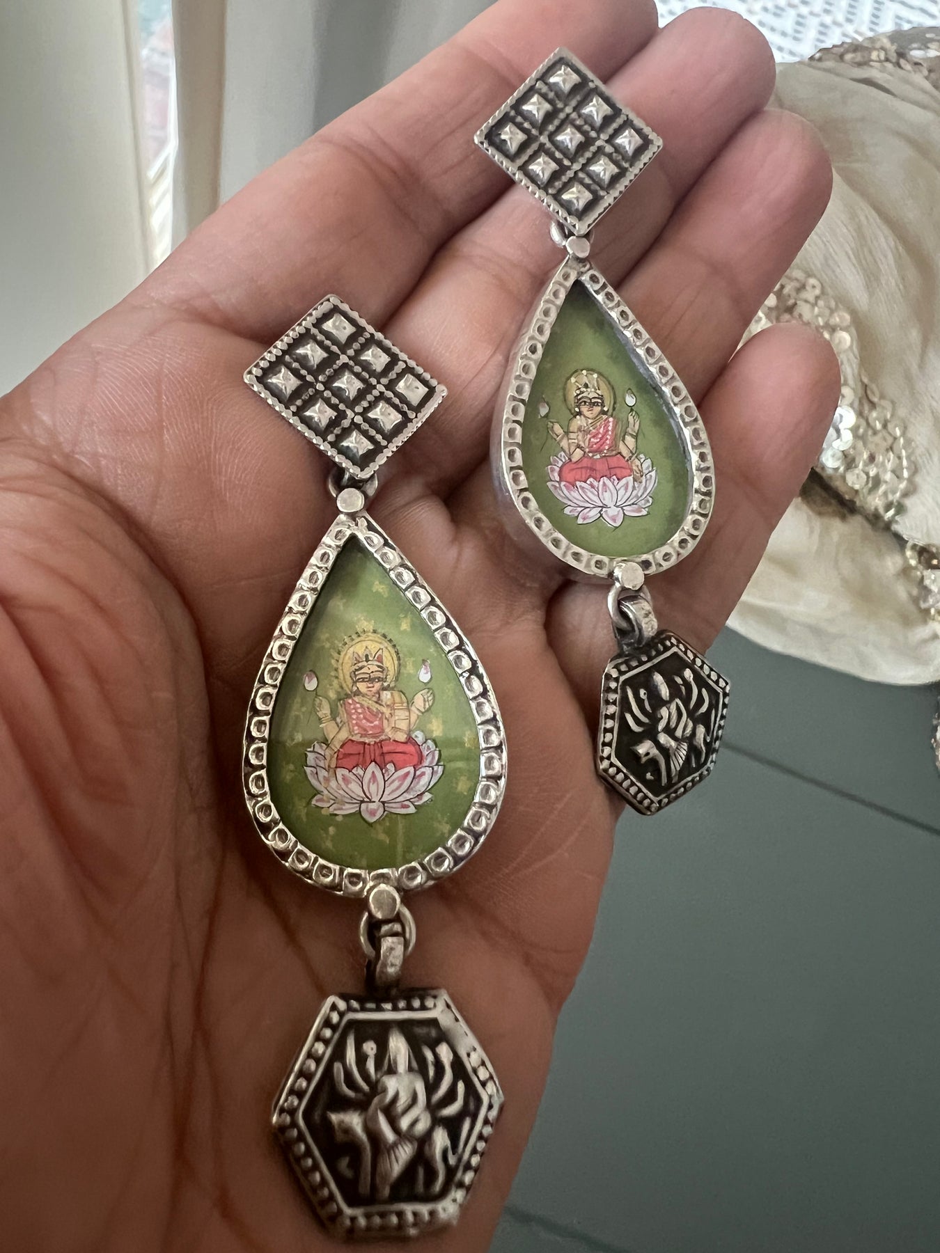 Each earring features a delicate, hand-painted image of Goddess Laxmi and fine glass, framed in pure 925 sterling silver. These earrings are a stunning fusion of traditional Indian artistry and contemporary elegance, handcrafted by expert local artisans.