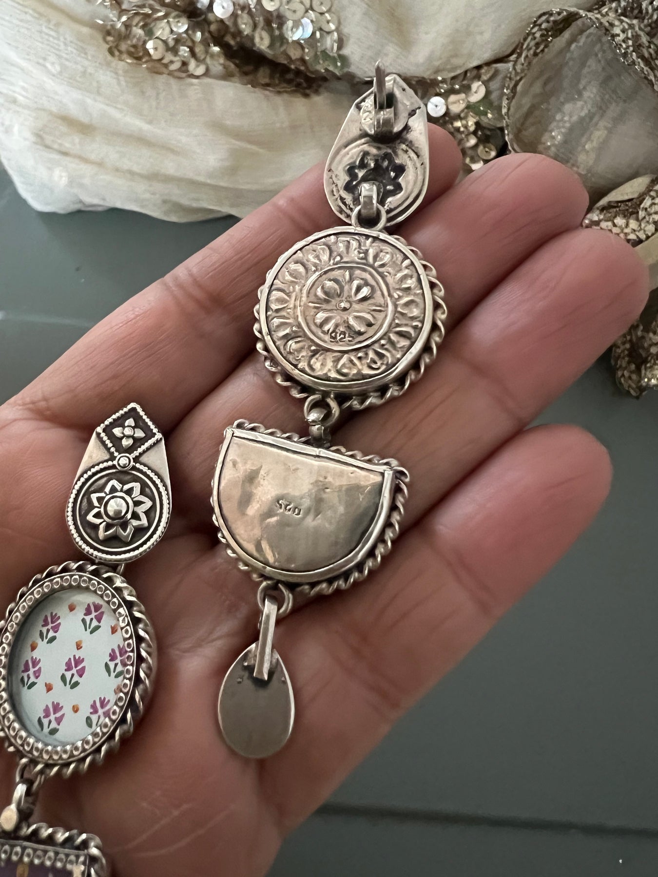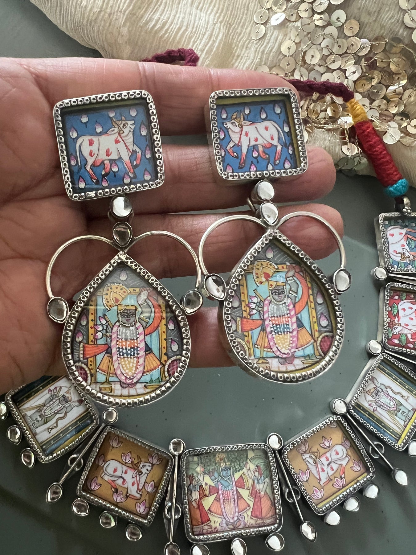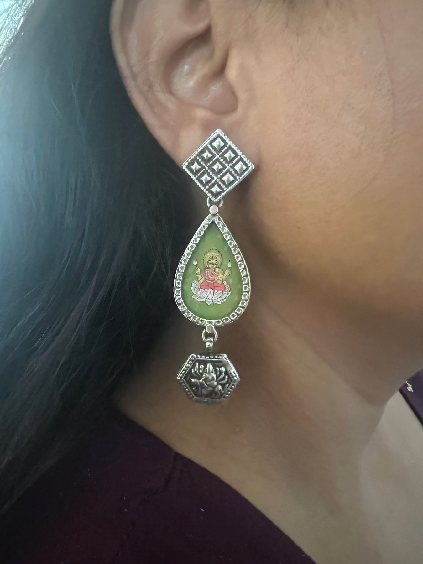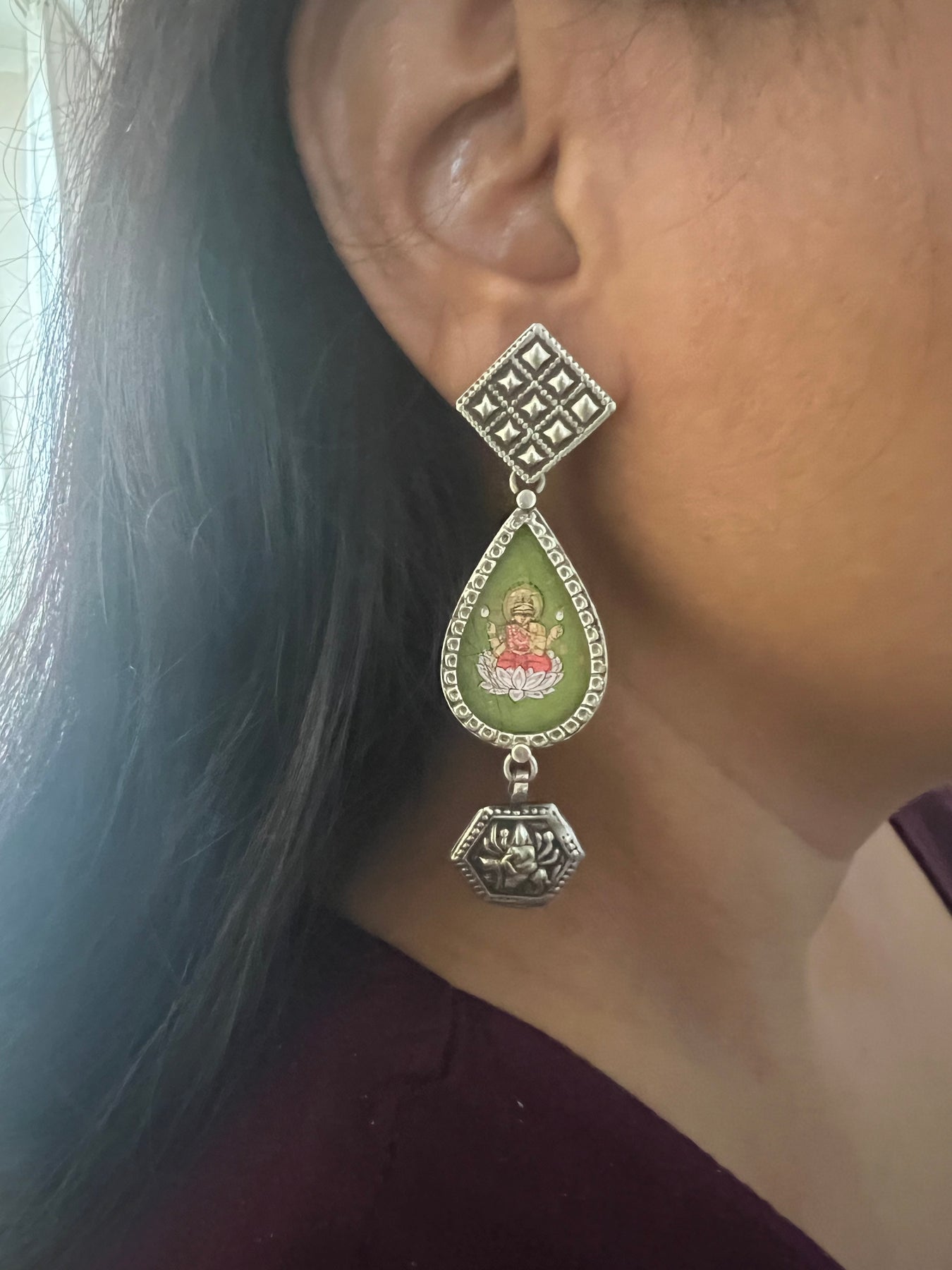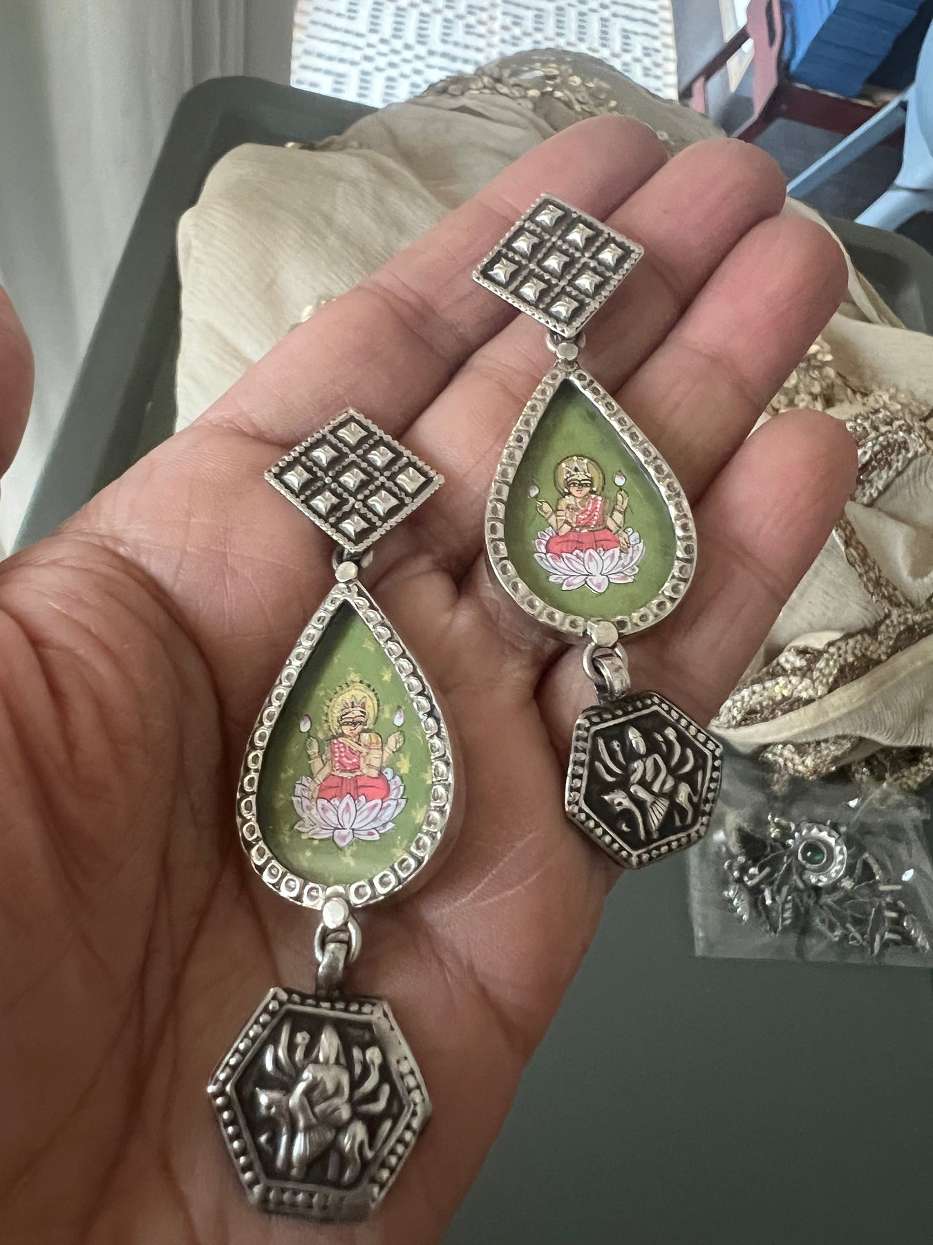 Each earring features a delicate, hand-painted image of Goddess Laxmi and fine glass, framed in pure 925 sterling silver. These earrings are a stunning fusion of traditional Indian artistry and contemporary elegance, handcrafted by expert local artisans.