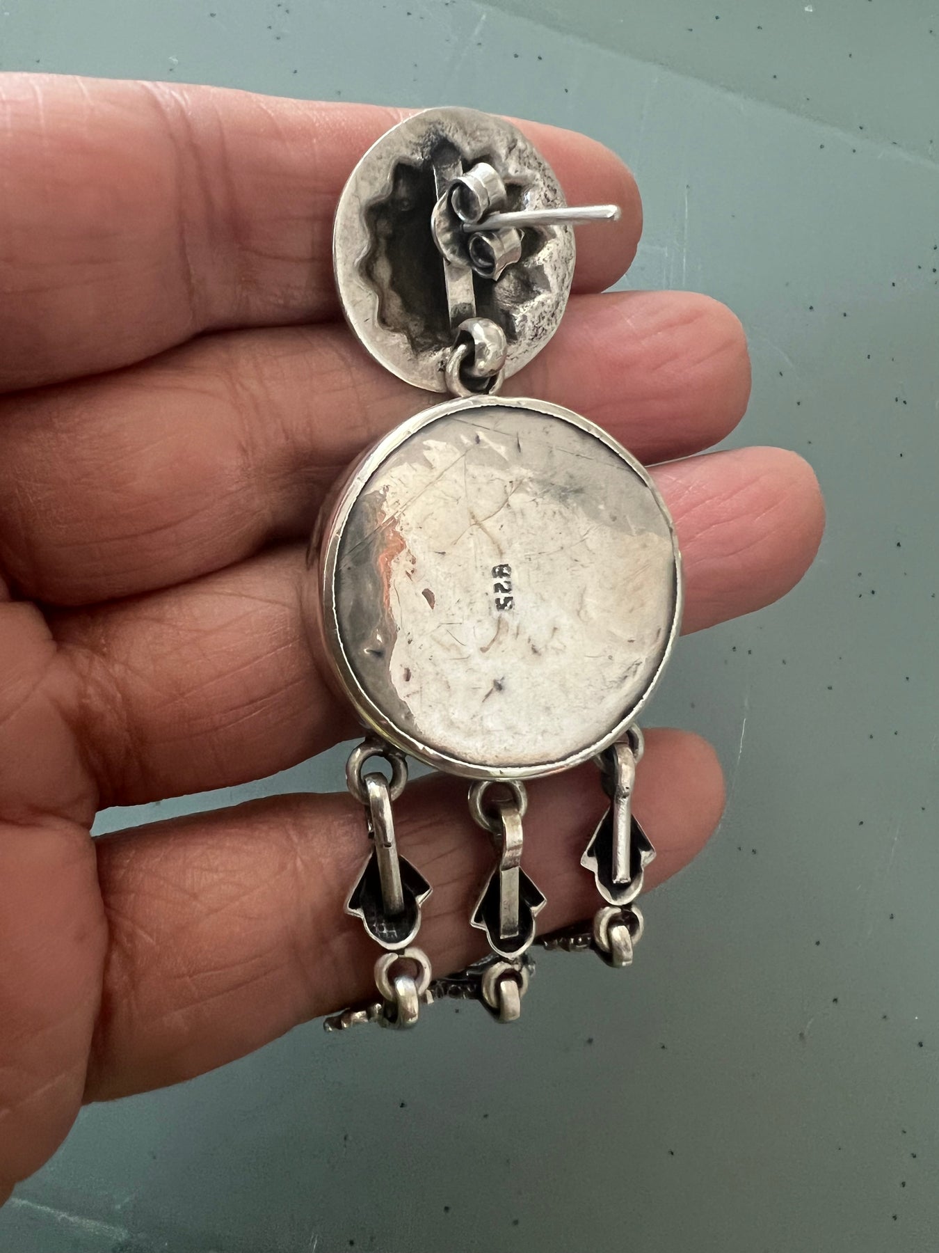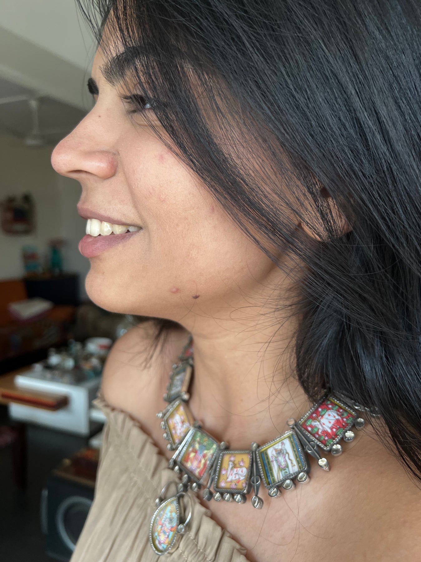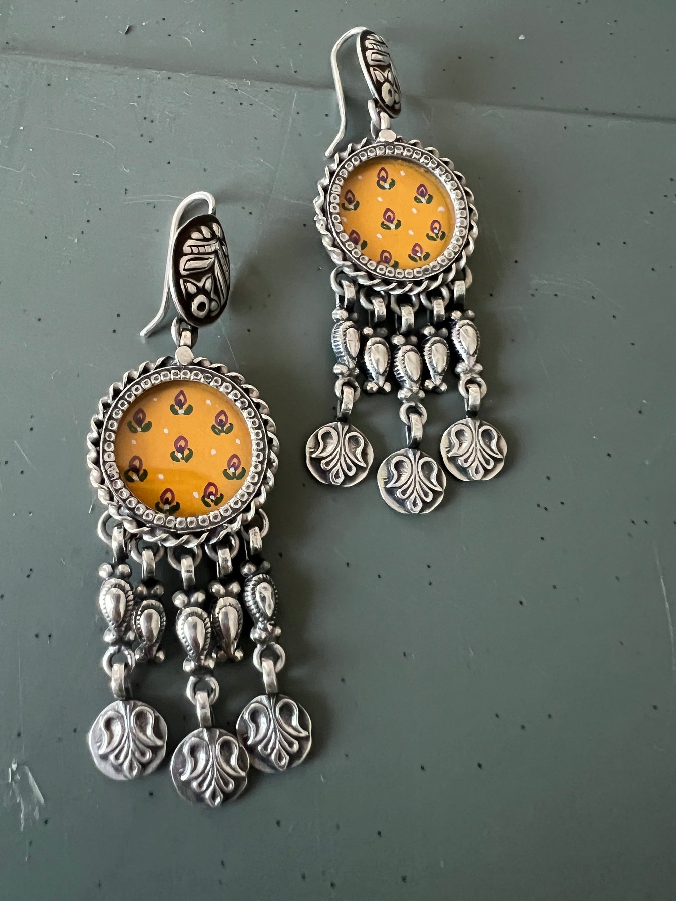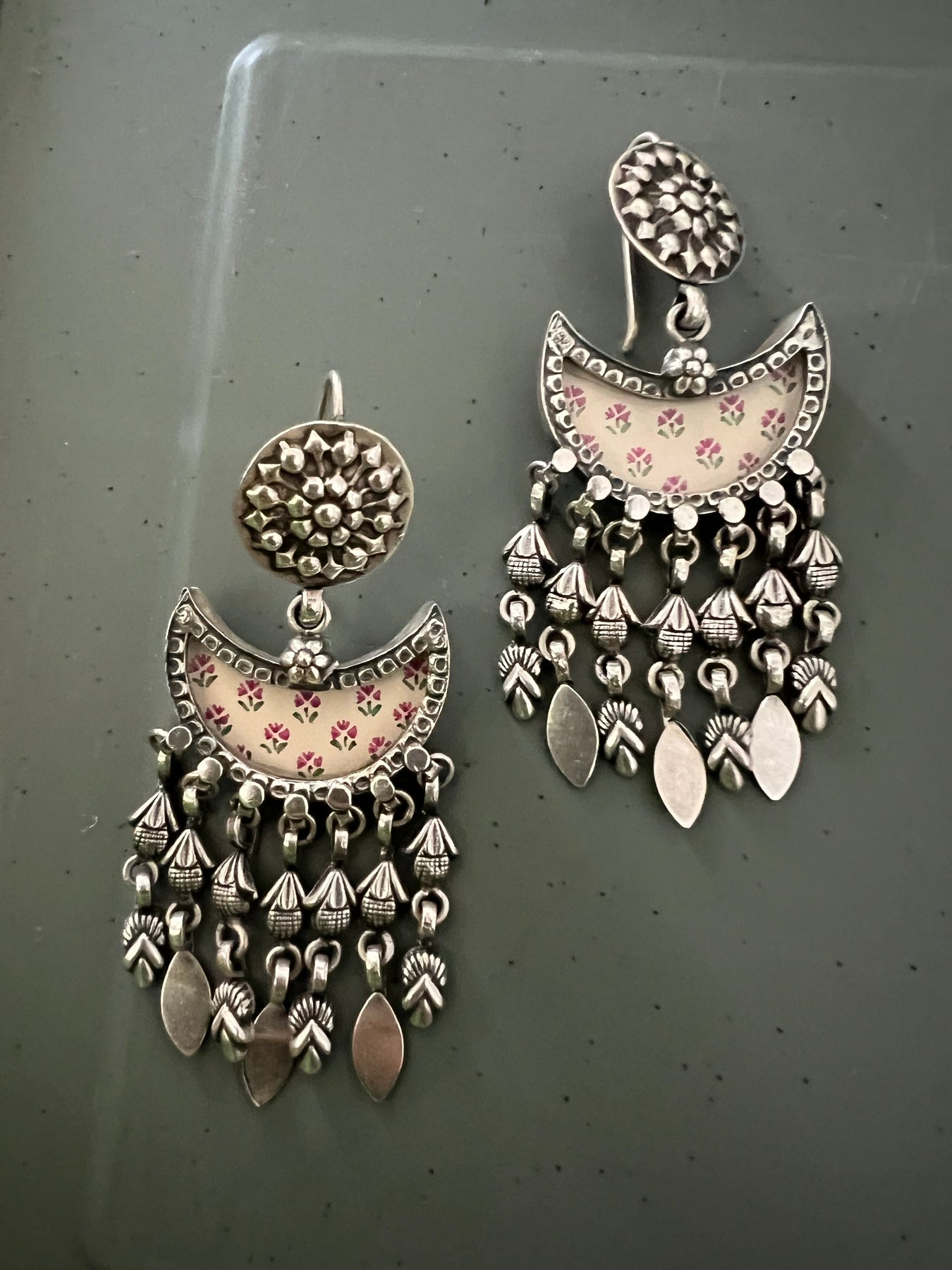 Each earring features a delicate, hand-painted image of Goddess Laxmi and fine glass, framed in pure 925 sterling silver. These earrings are a stunning fusion of traditional Indian artistry and contemporary elegance, handcrafted by expert local artisans.
