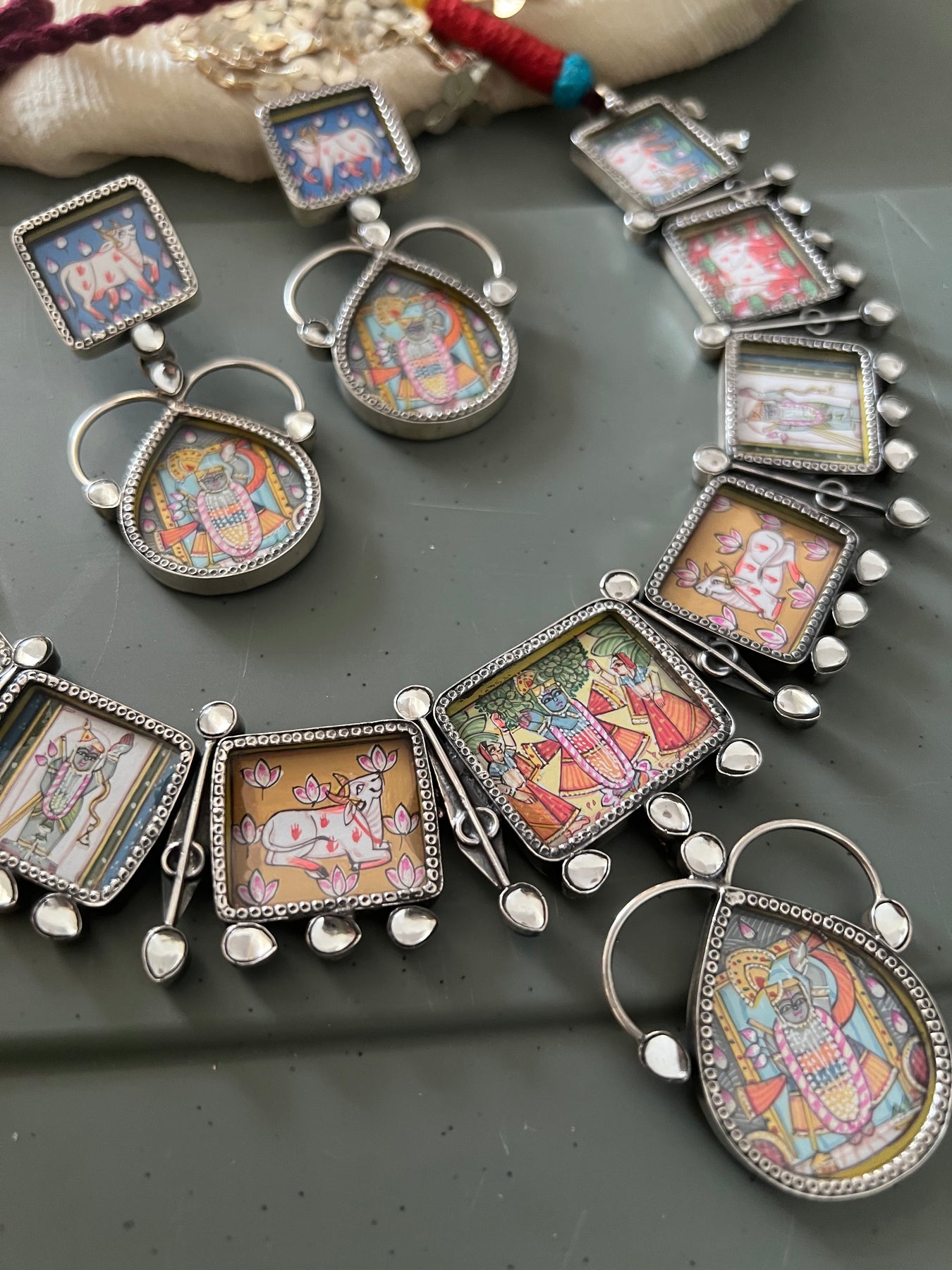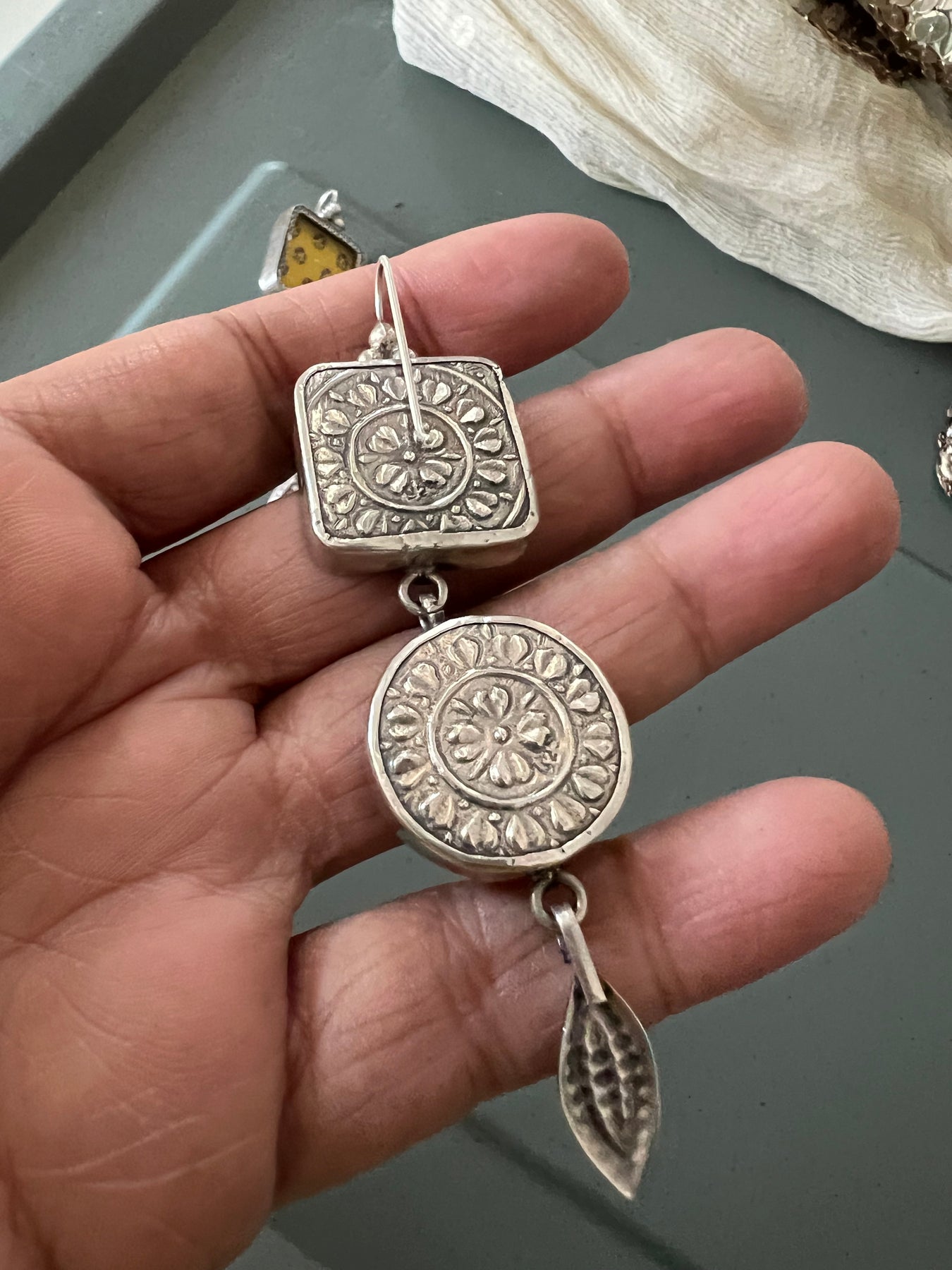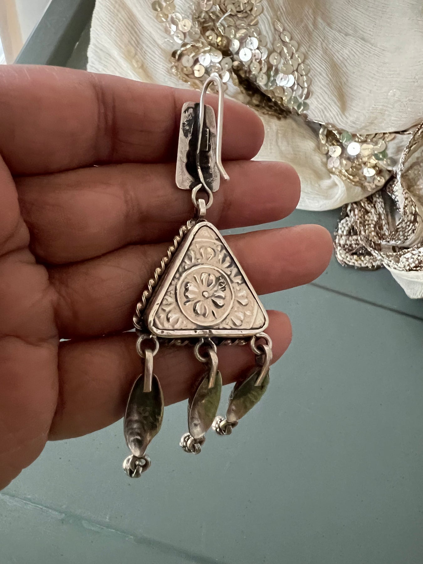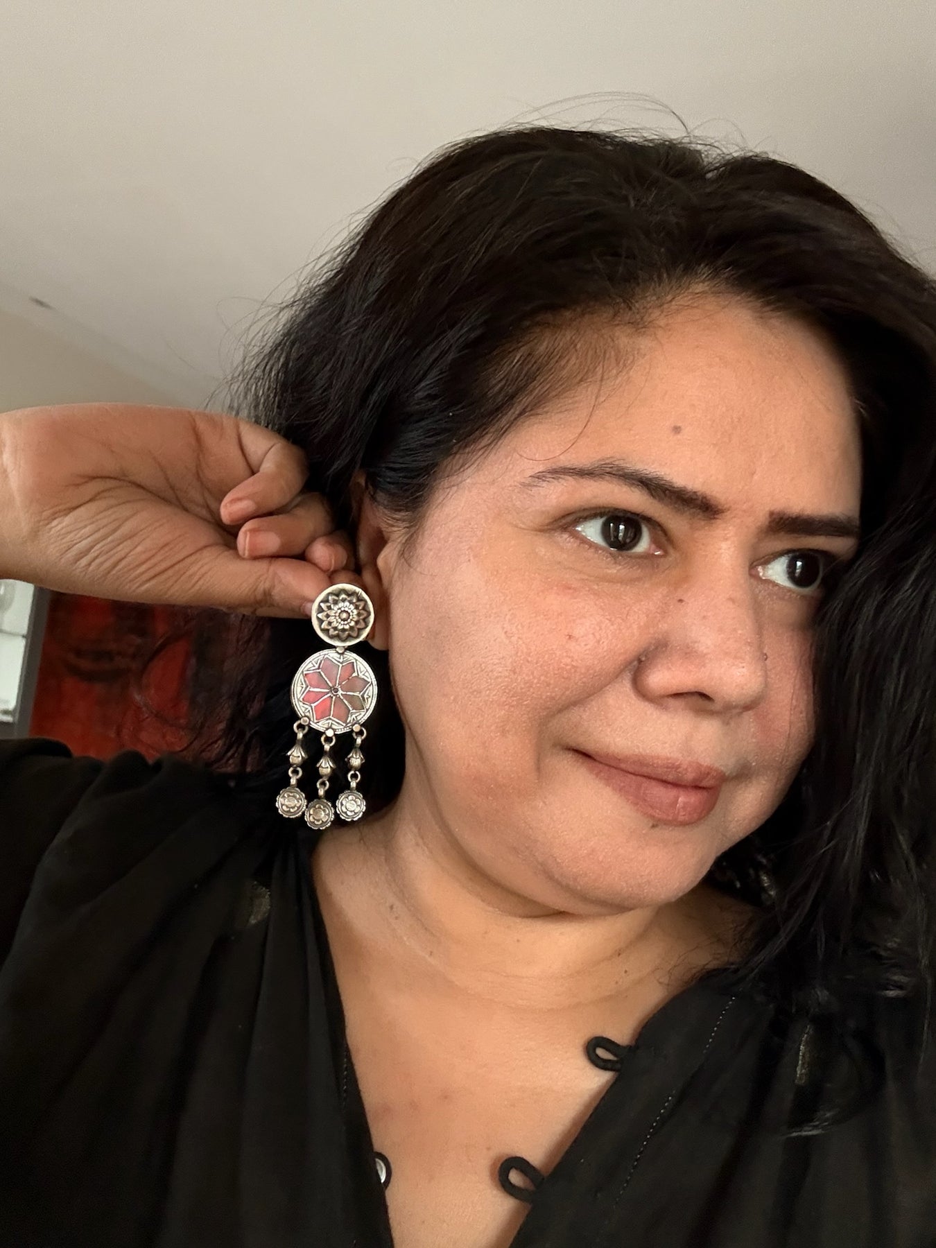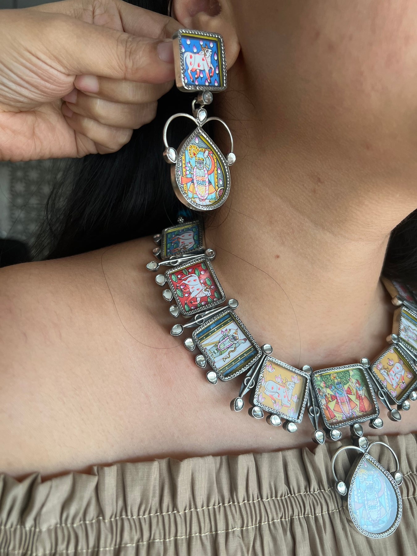Each earring features a delicate, hand-painted image of Goddess Laxmi and fine glass, framed in pure 925 sterling silver. These earrings are a stunning fusion of traditional Indian artistry and contemporary elegance, handcrafted by expert local artisans.