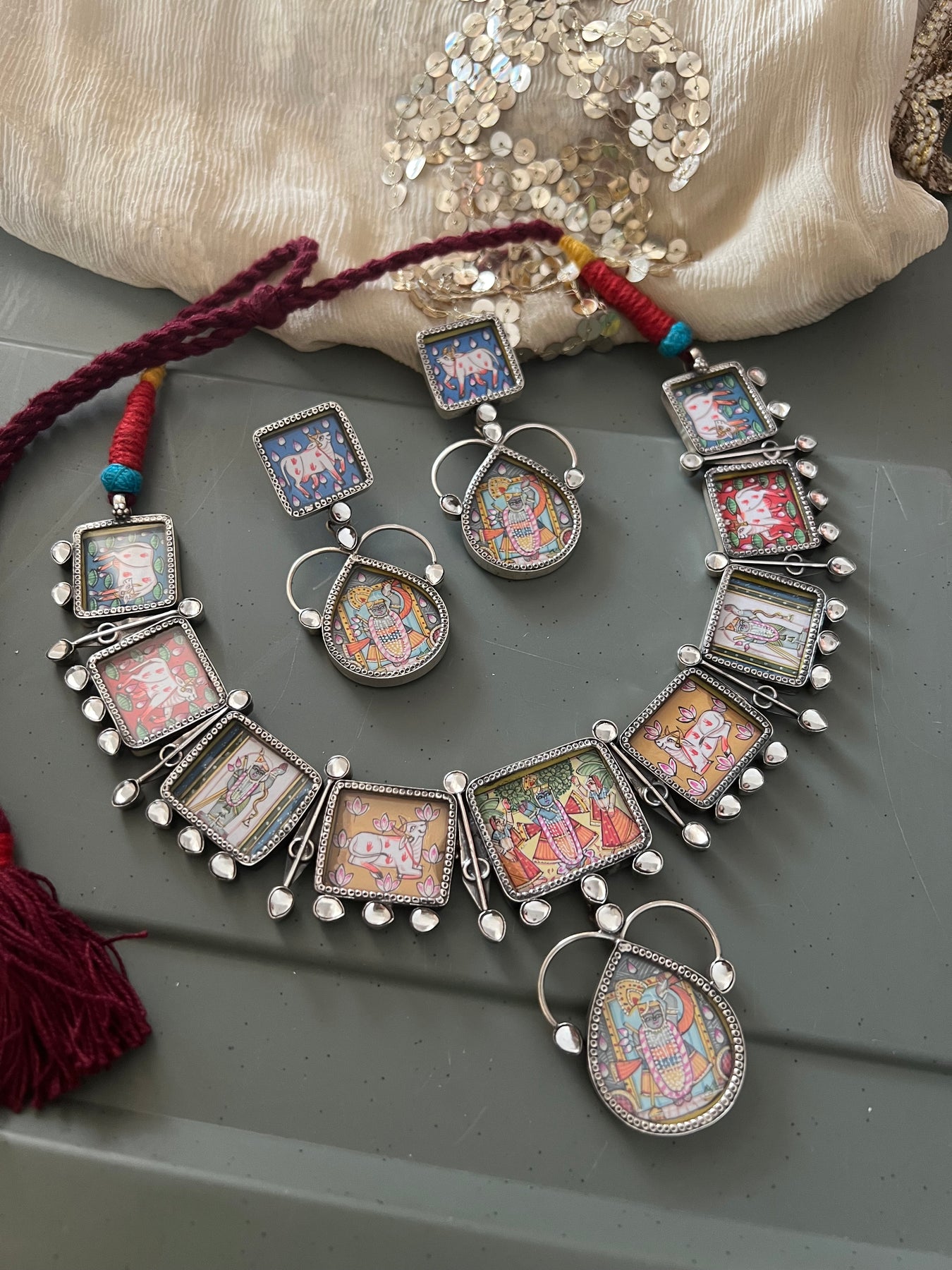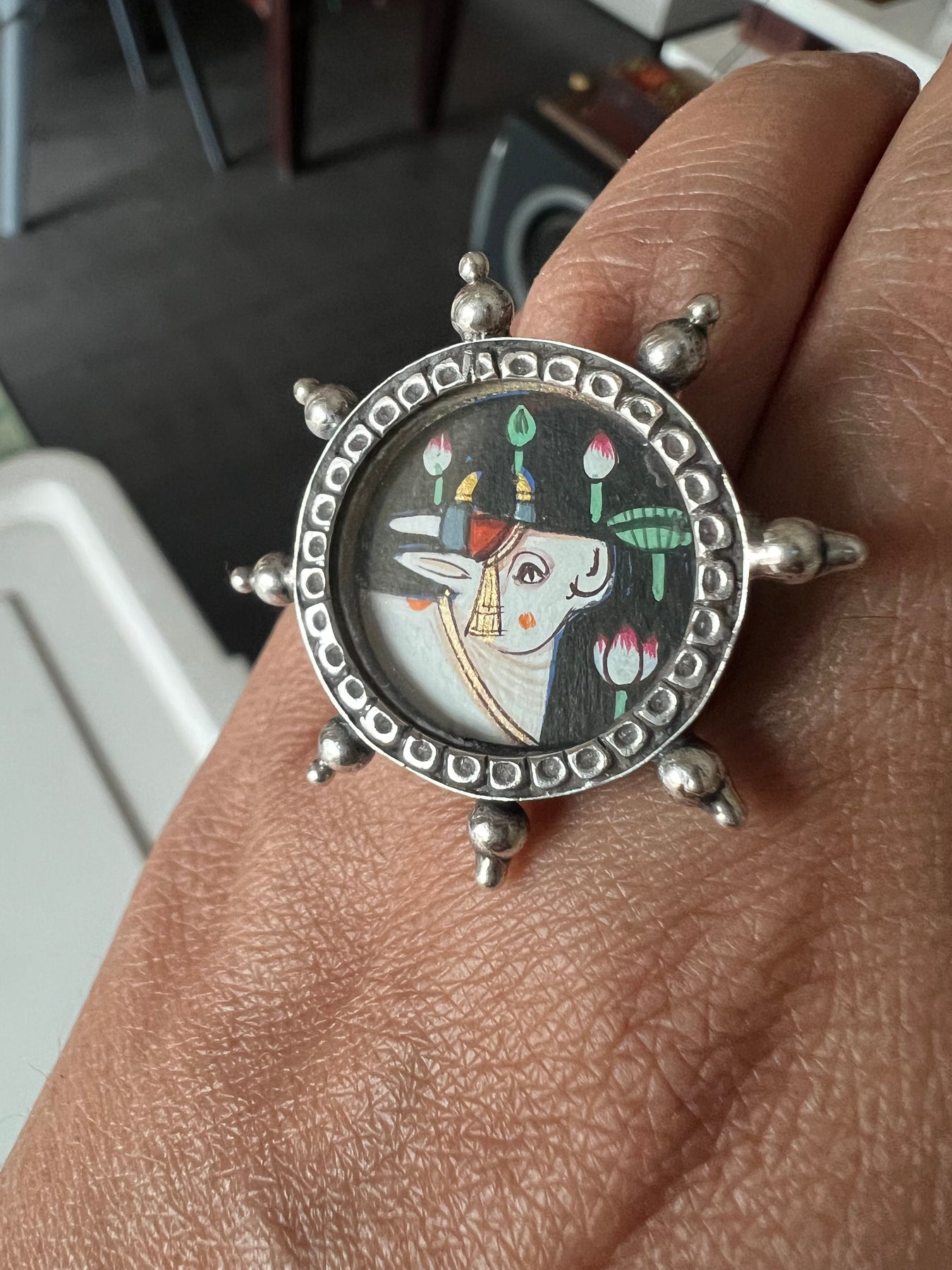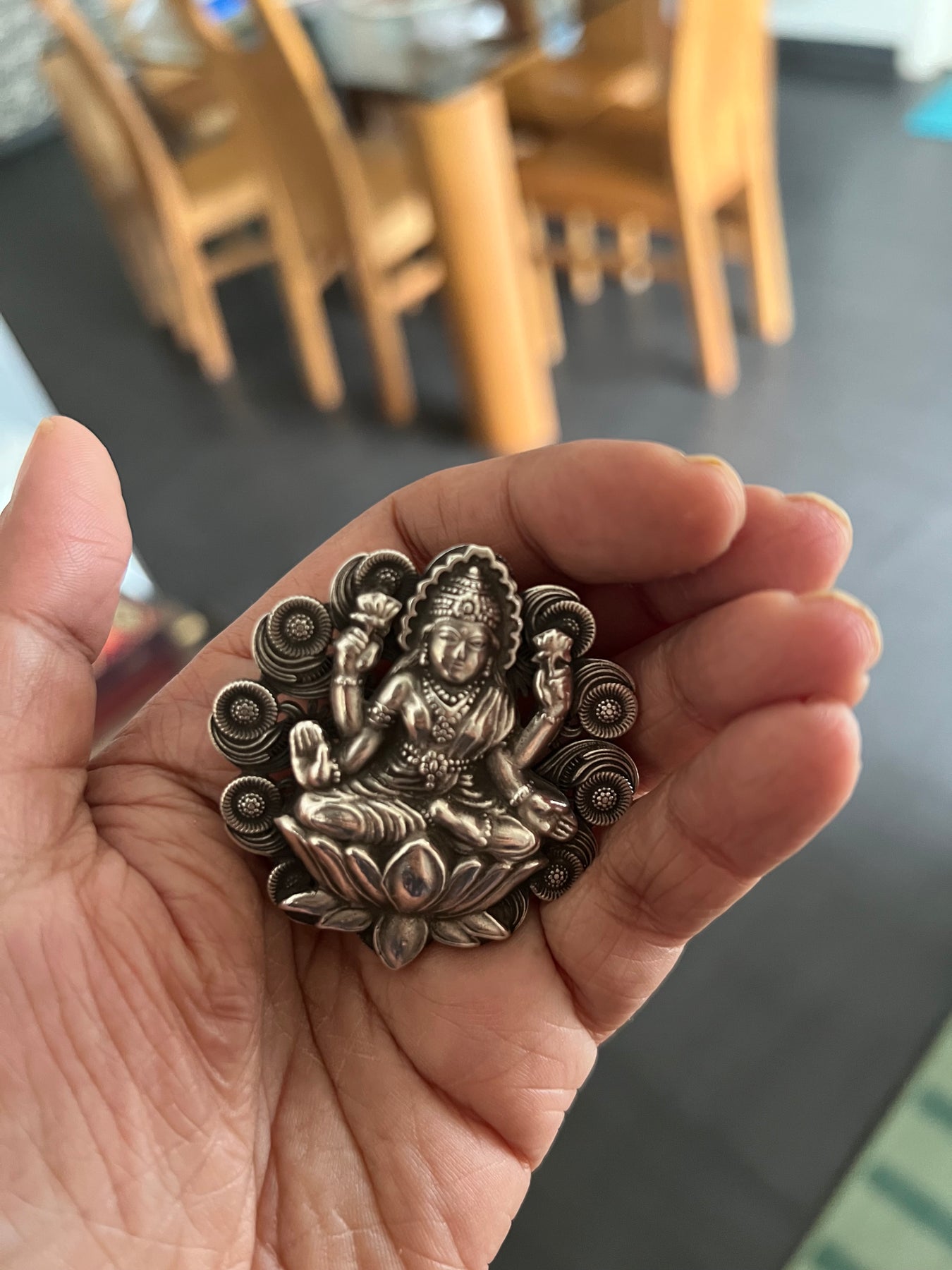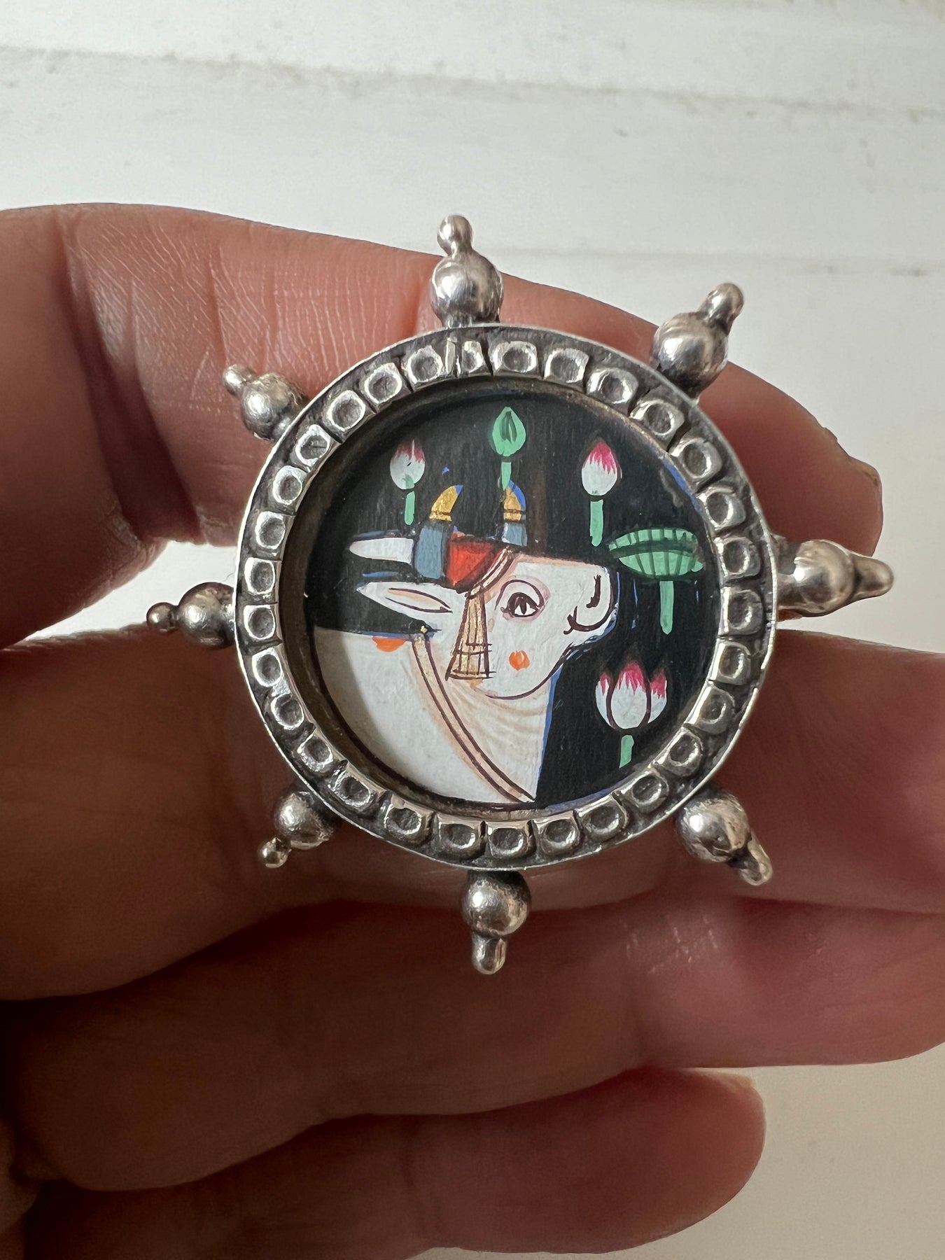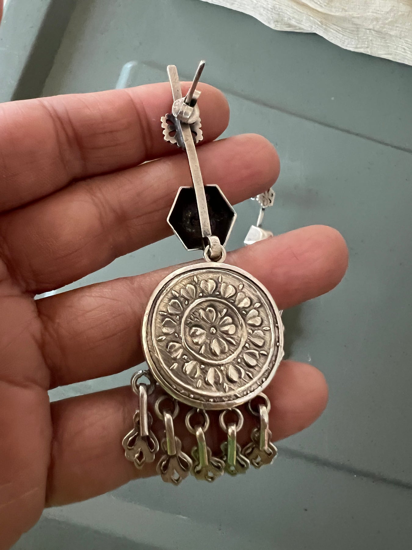 Each earring features a delicate, hand-painted image of Goddess Laxmi and fine glass, framed in pure 925 sterling silver. These earrings are a stunning fusion of traditional Indian artistry and contemporary elegance, handcrafted by expert local artisans.