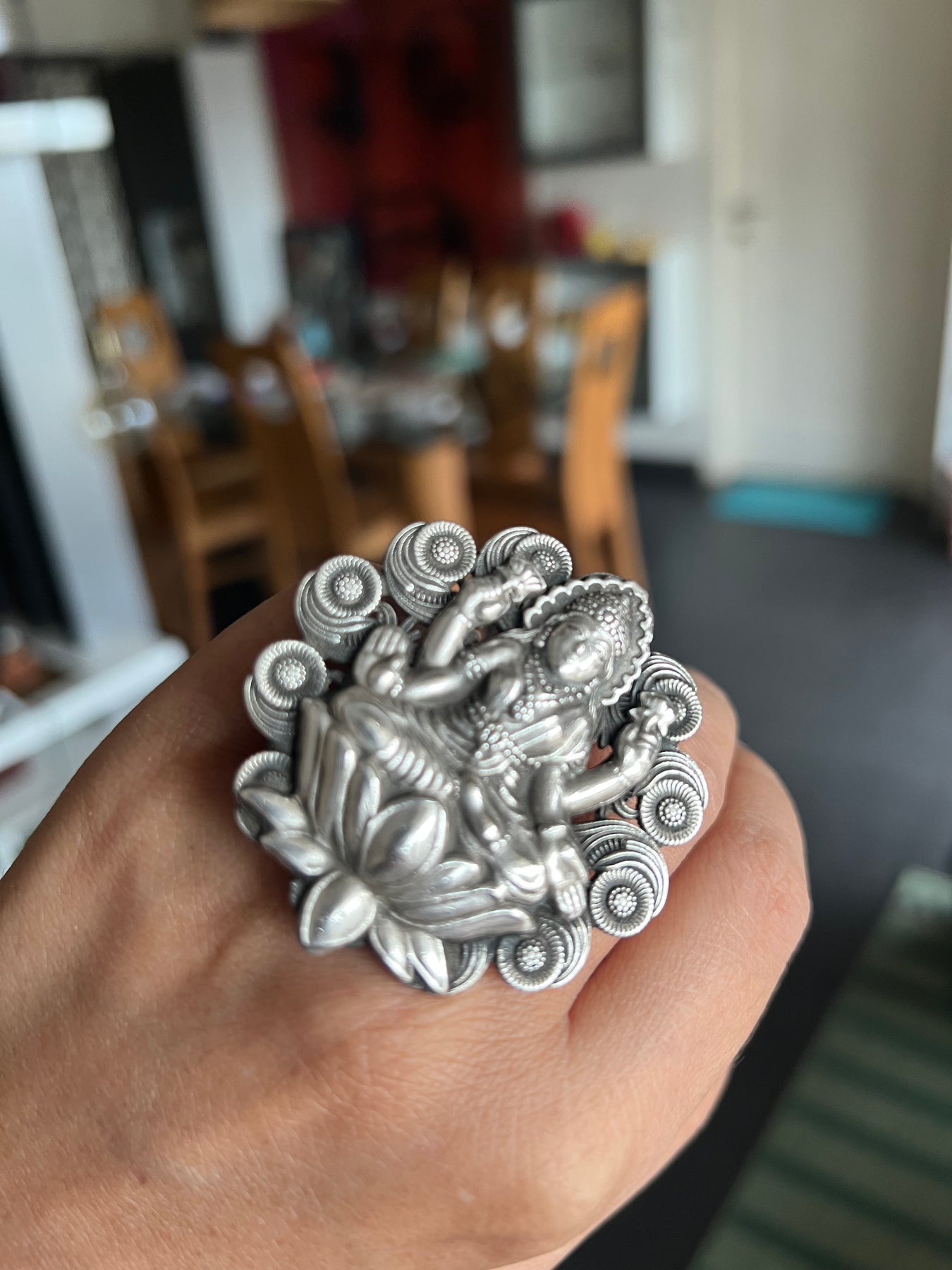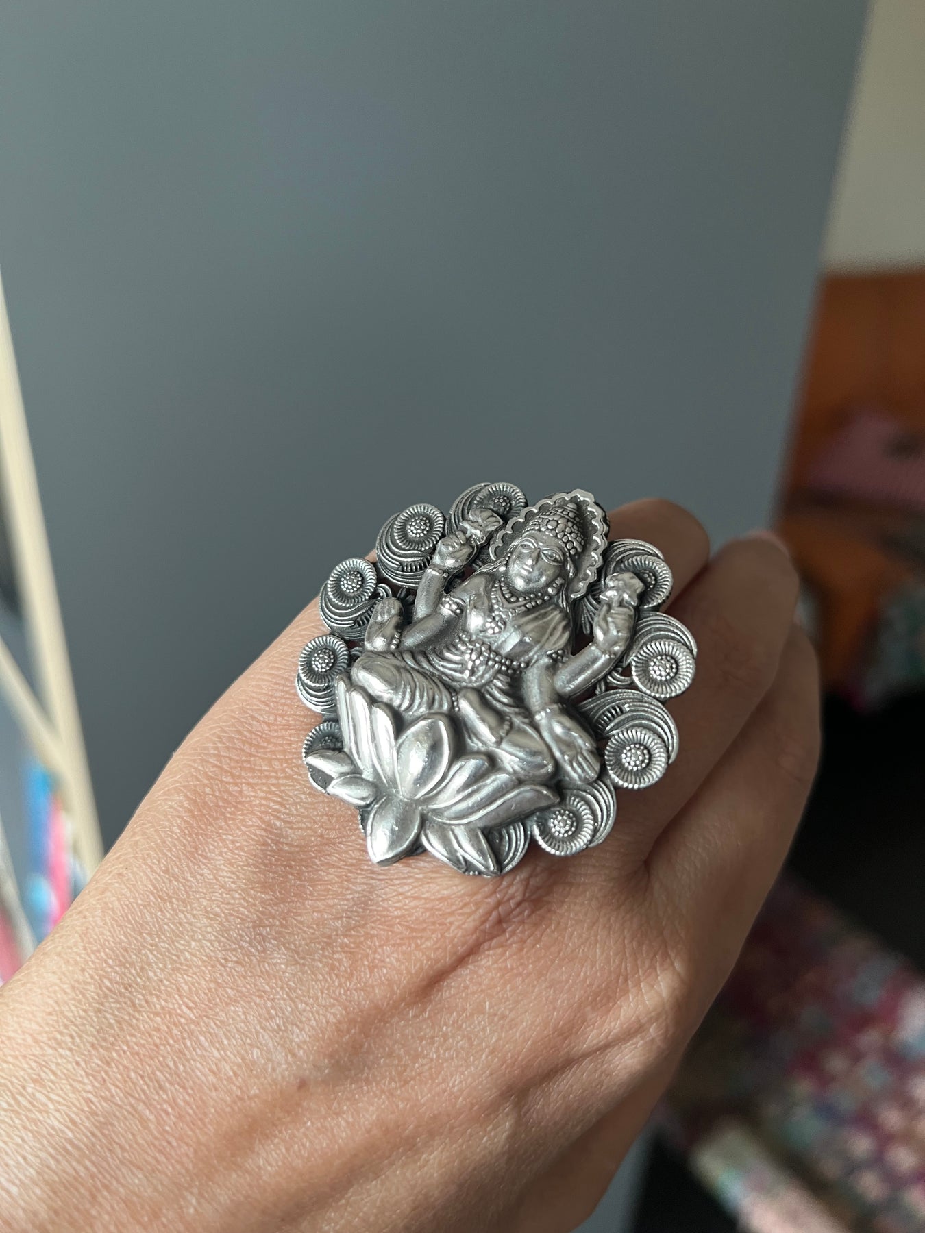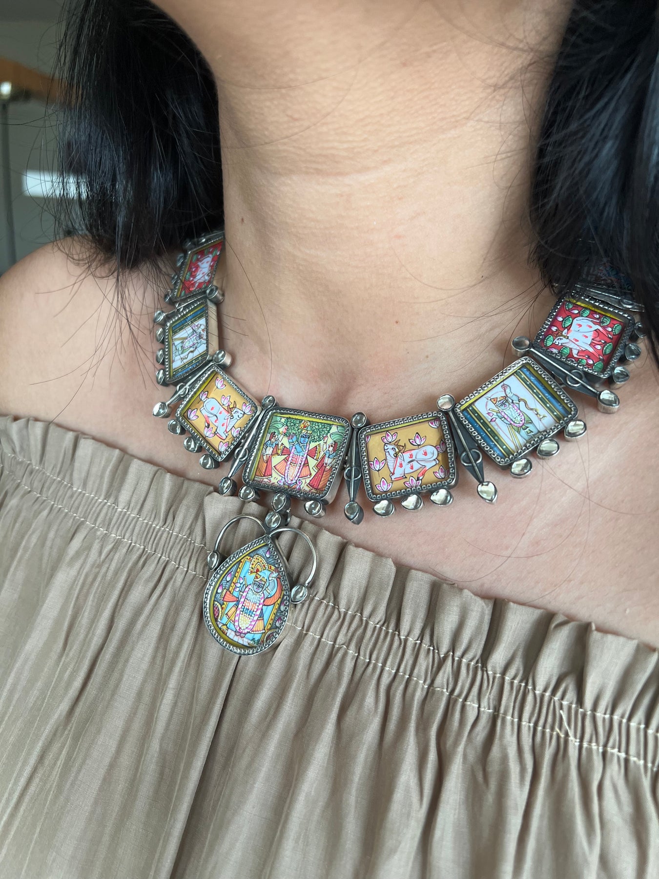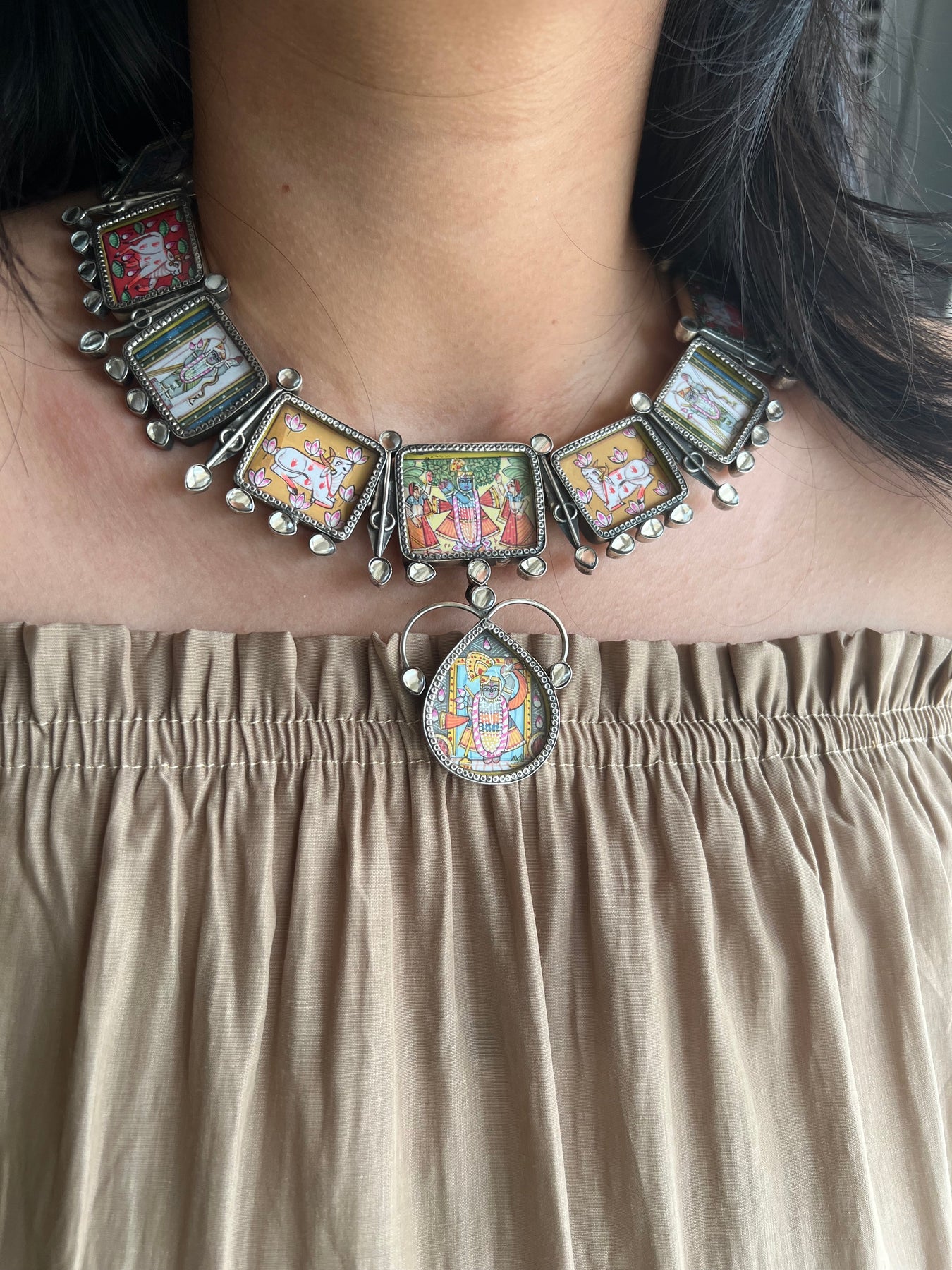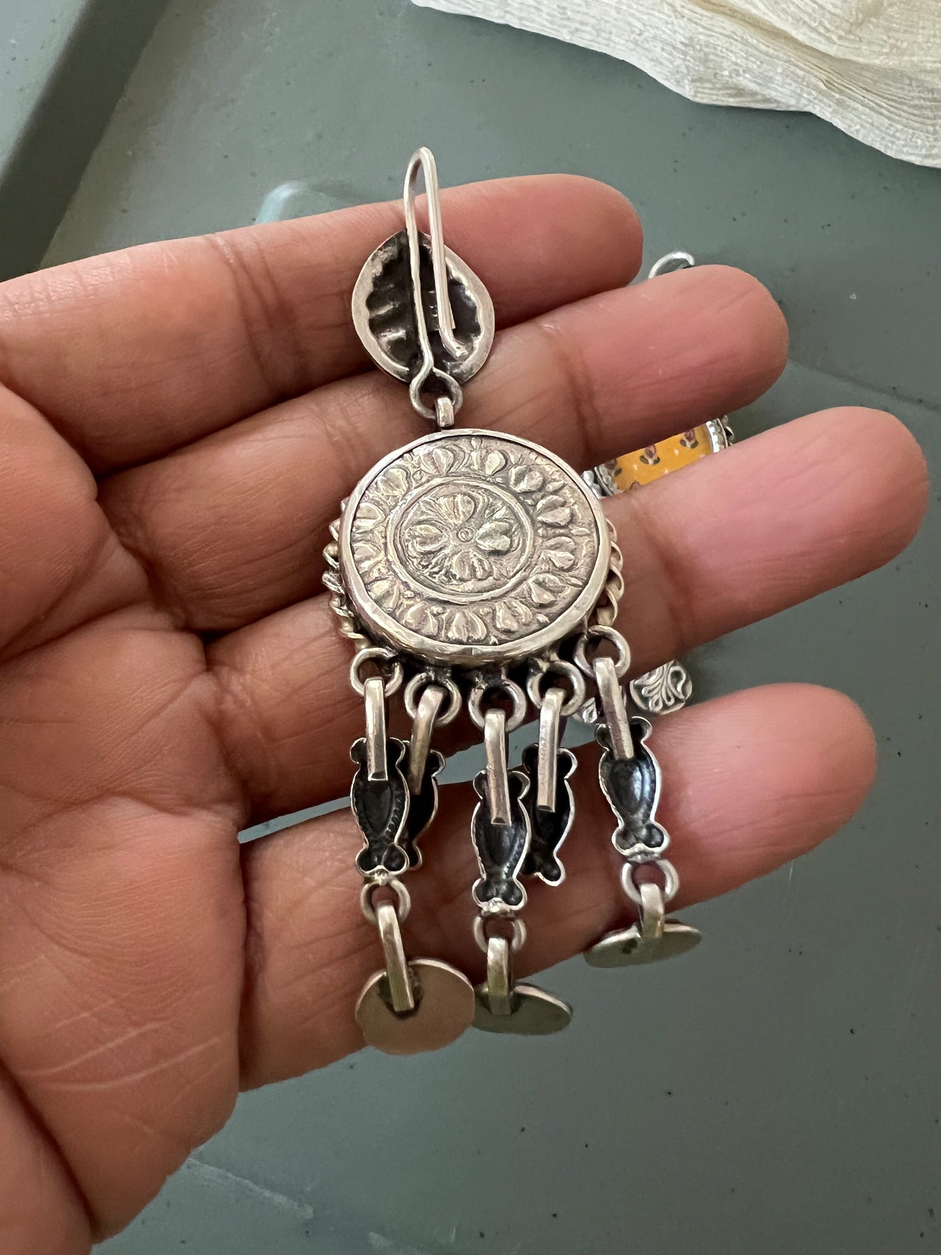Each earring features a delicate, hand-painted image of Goddess Laxmi and fine glass, framed in pure 925 sterling silver. These earrings are a stunning fusion of traditional Indian artistry and contemporary elegance, handcrafted by expert local artisans.