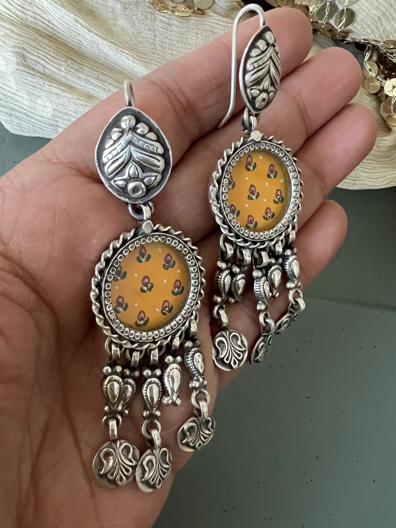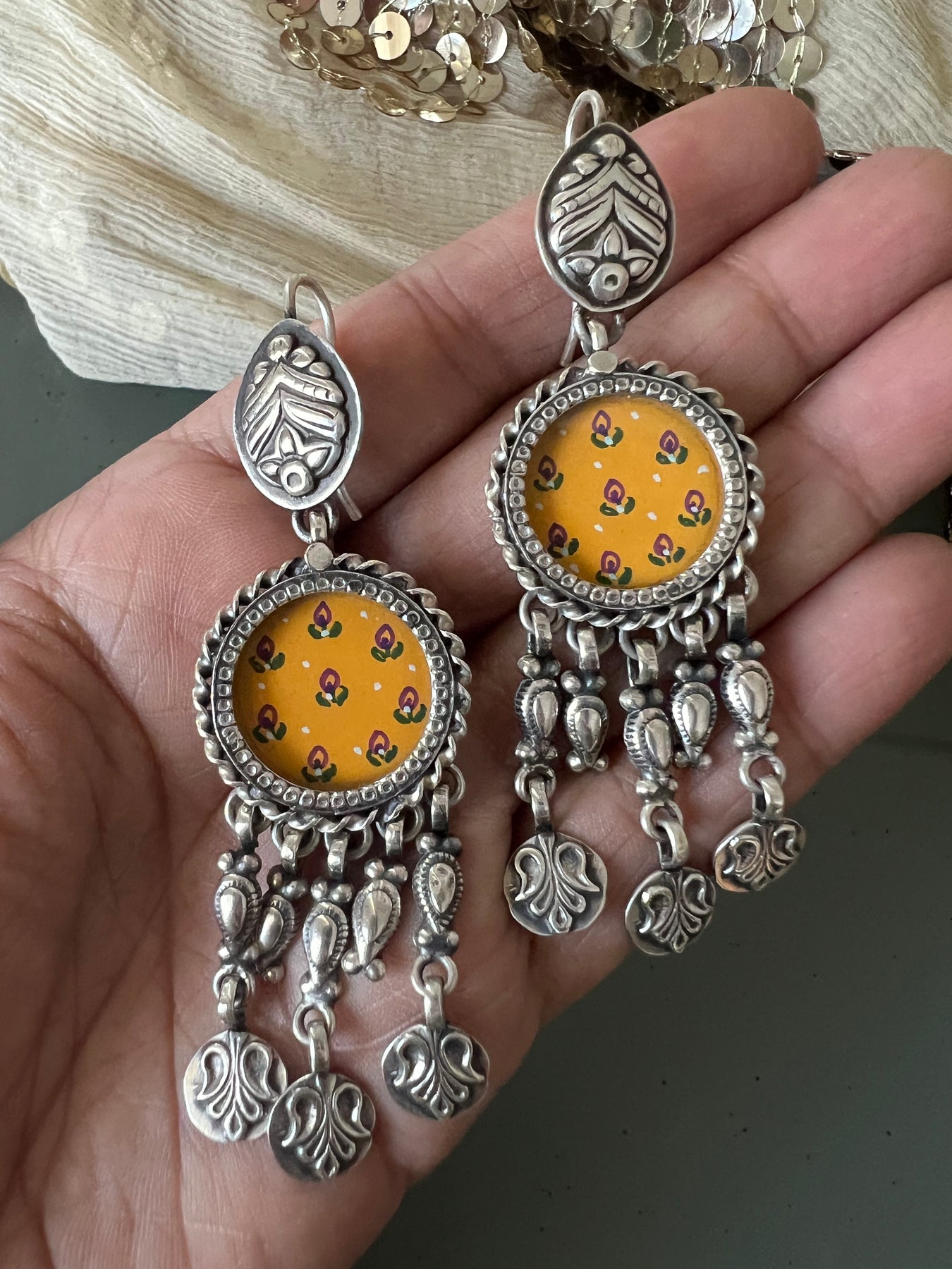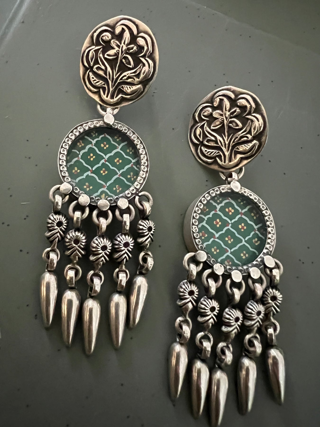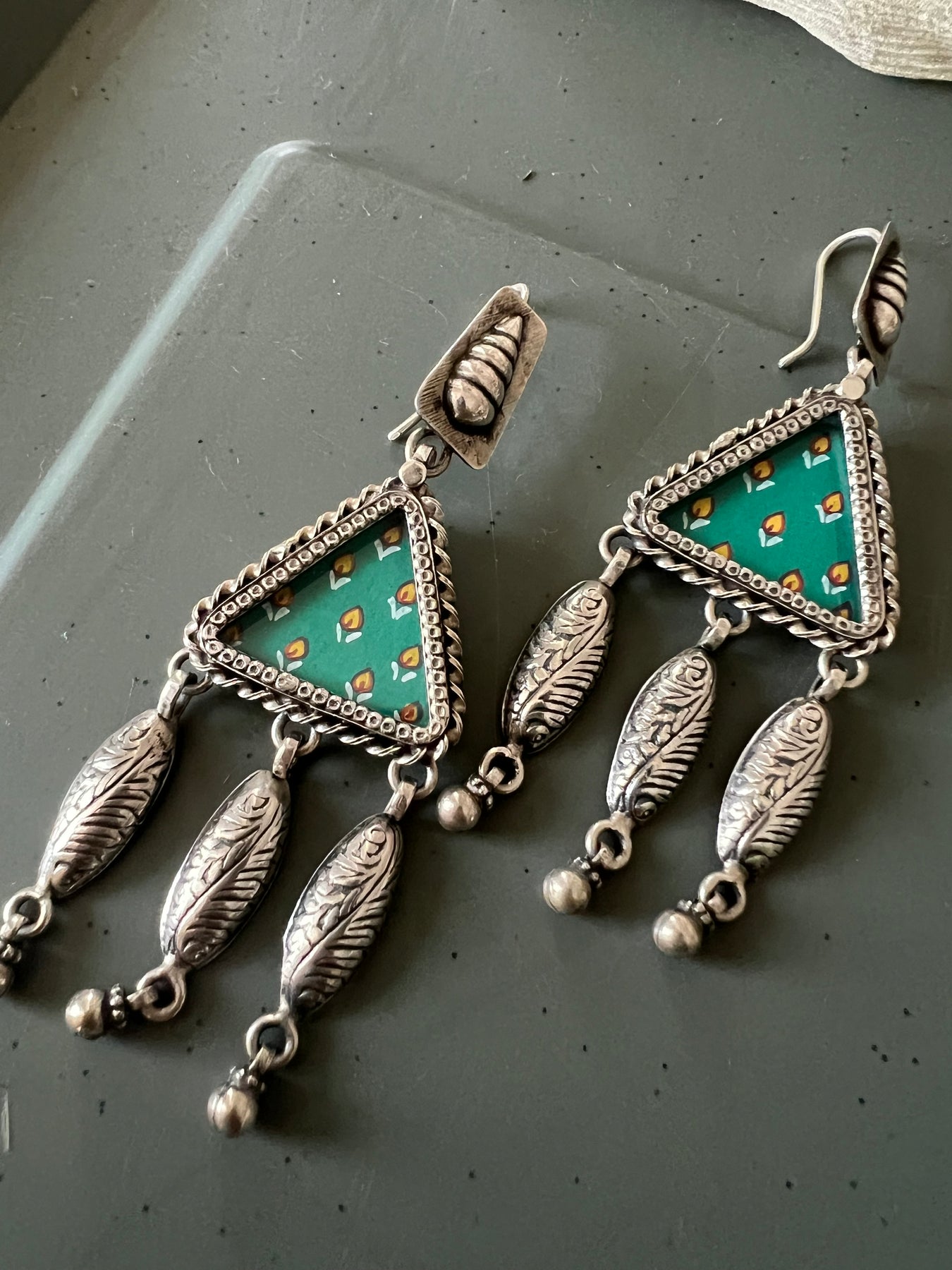 Laxmi Hand Painted Glass 925 Silver Earrings | SHIVKA | 7.5x2 cm | 16g Pair | Push Back | Hallmarked | Artistic Gift Jewelry