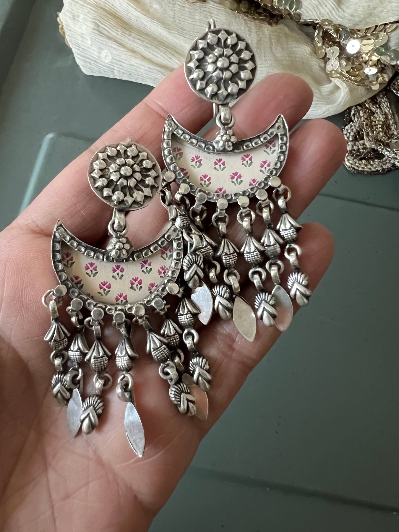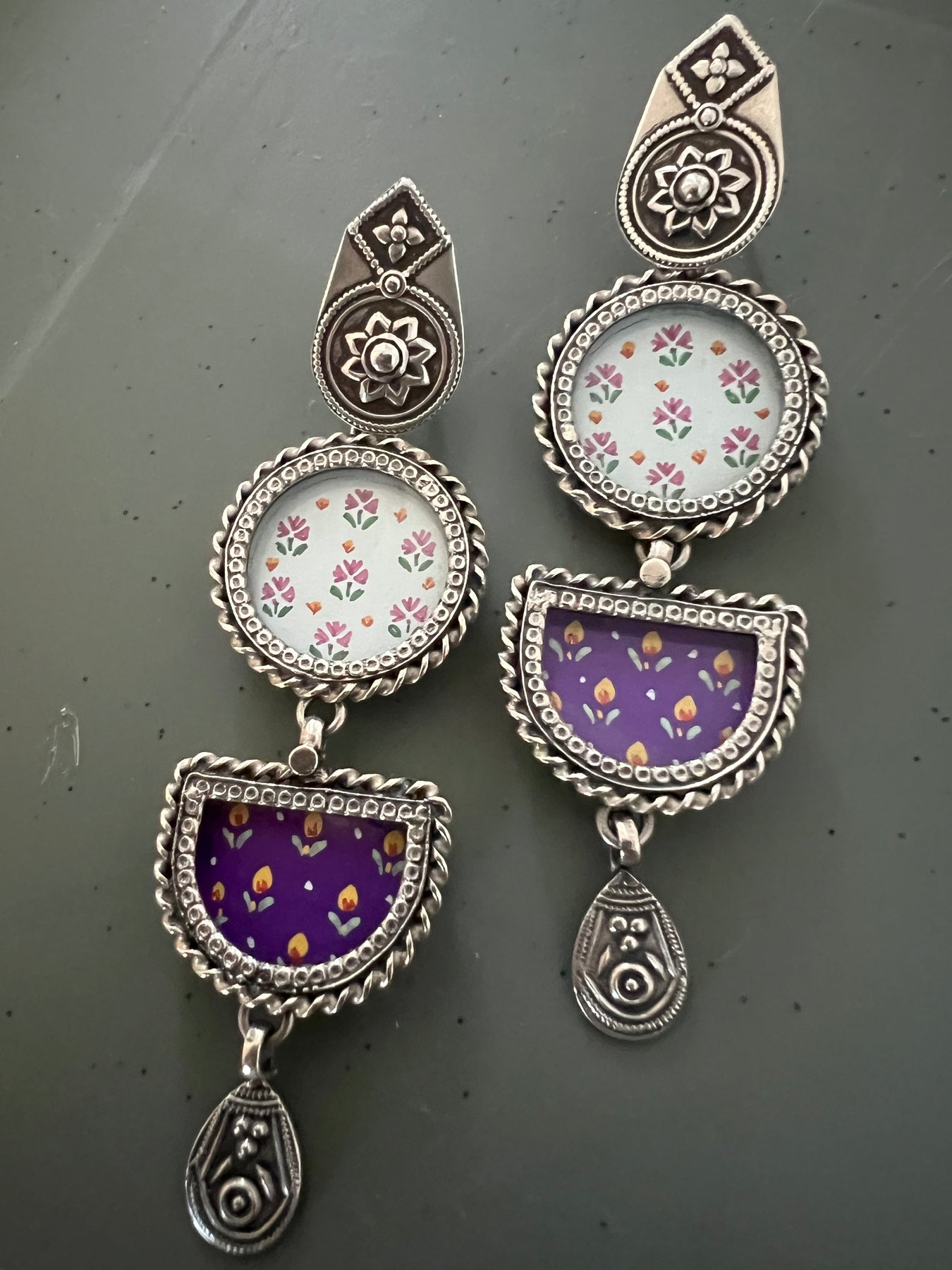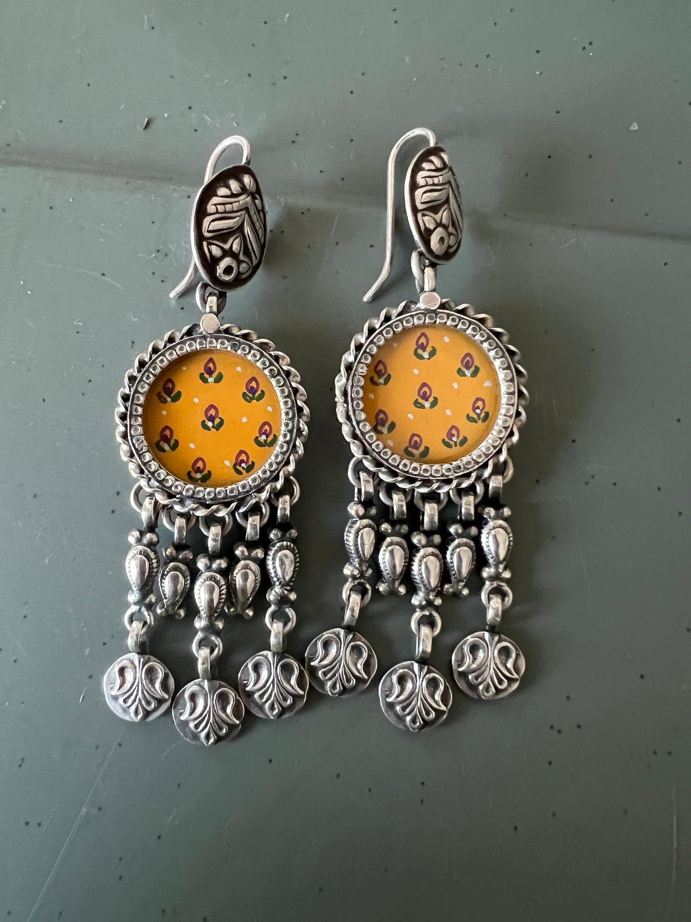 Laxmi Hand Painted Glass 925 Silver Earrings | SHIVKA | 7.5x2 cm | 16g Pair | Push Back | Hallmarked | Artistic Gift Jewelry