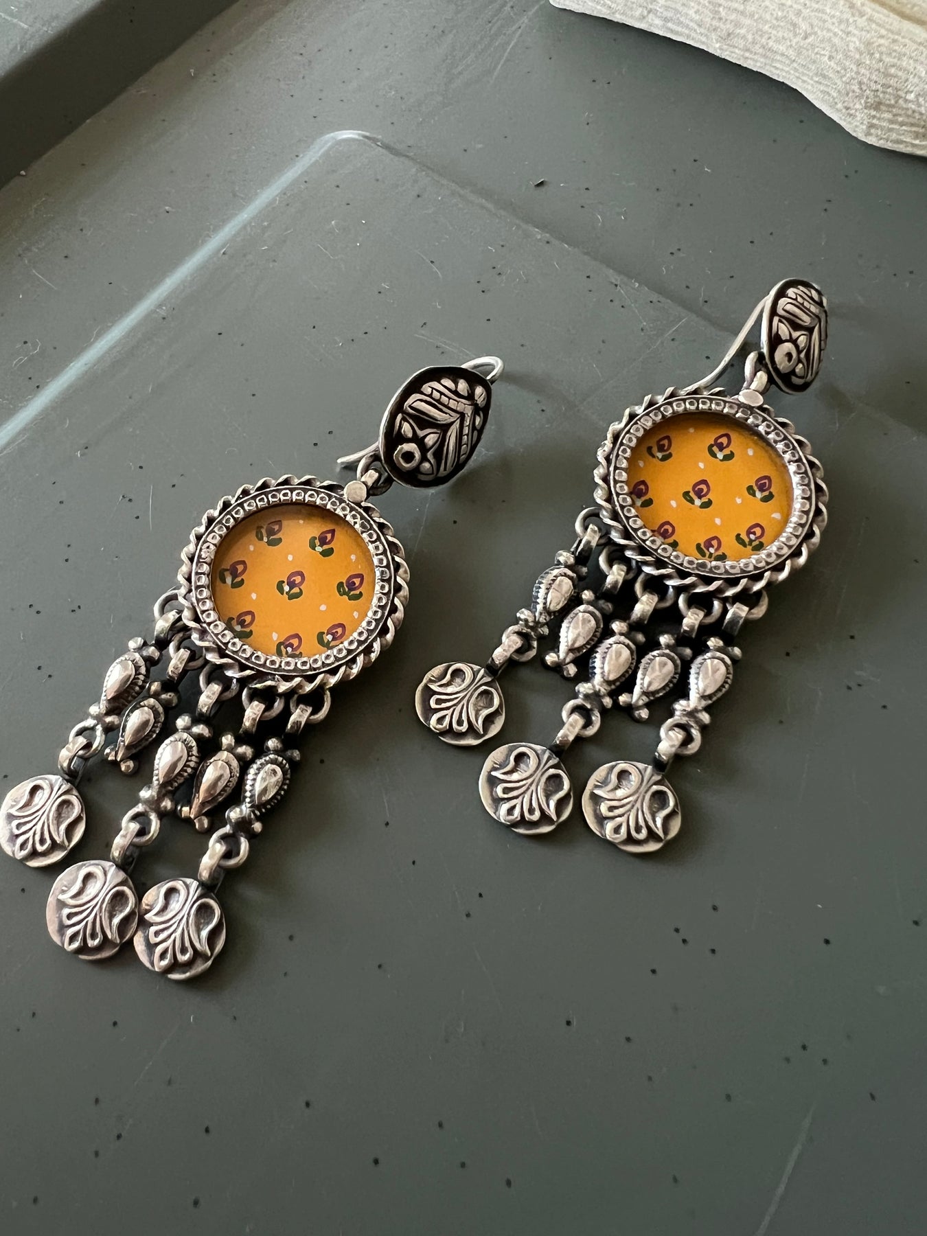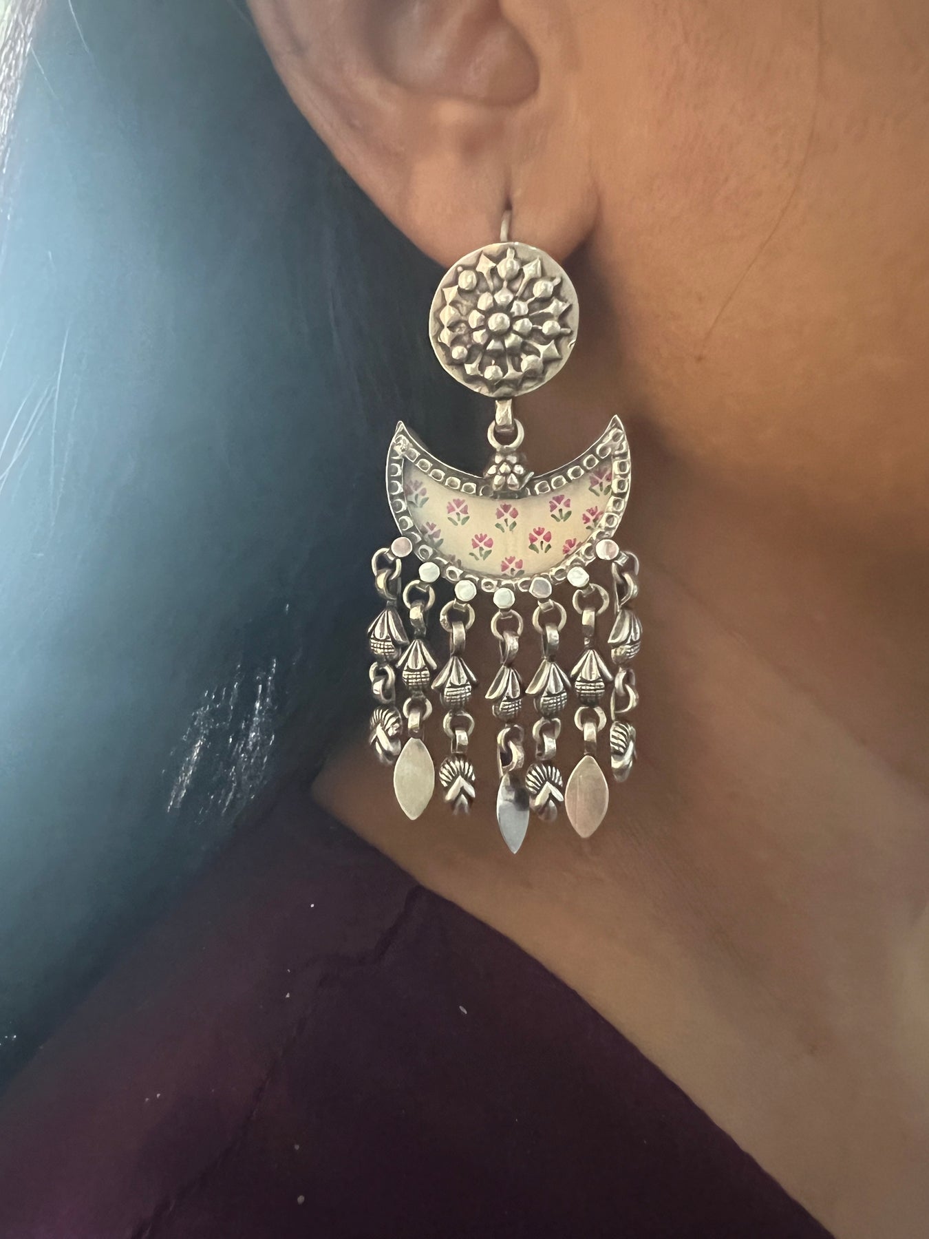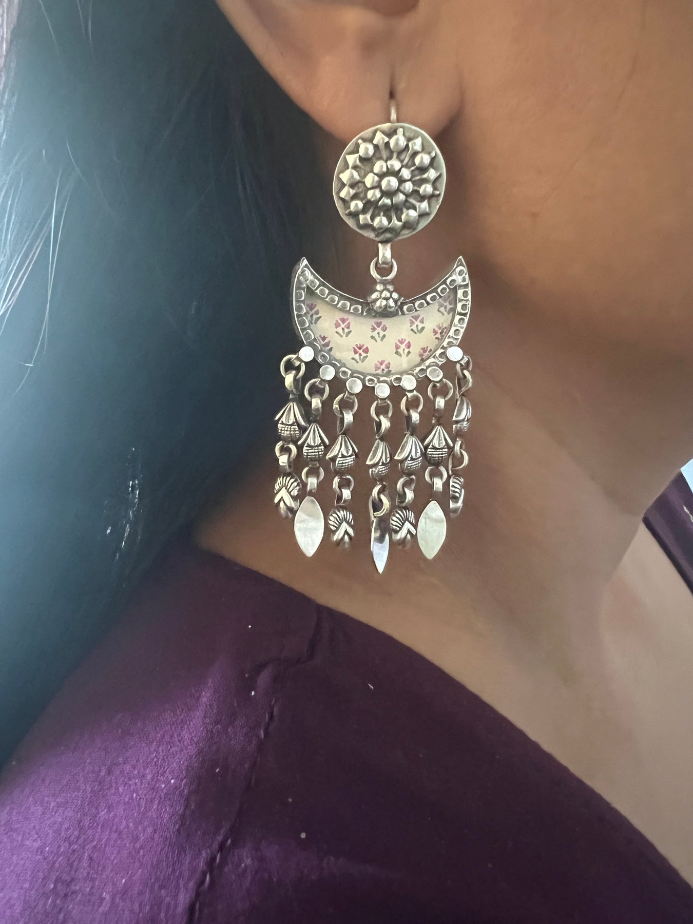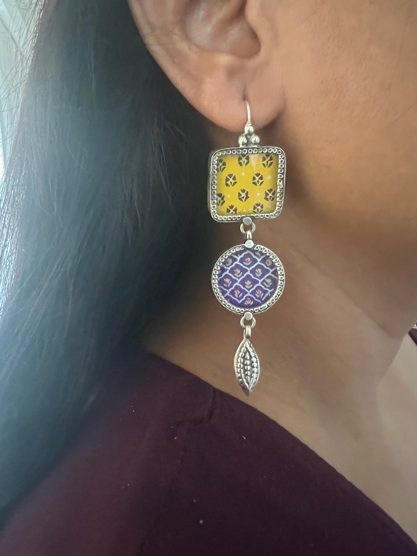 Laxmi Hand Painted Glass 925 Silver Earrings | SHIVKA | 7.5x2 cm | 16g Pair | Push Back | Hallmarked | Artistic Gift Jewelry