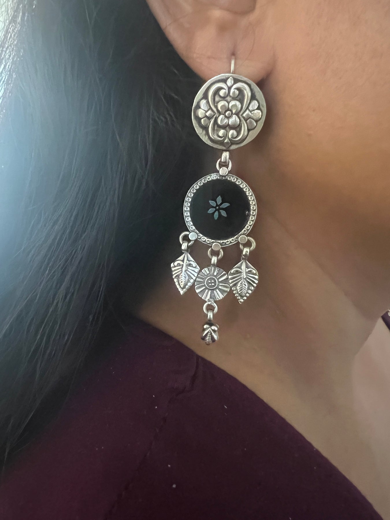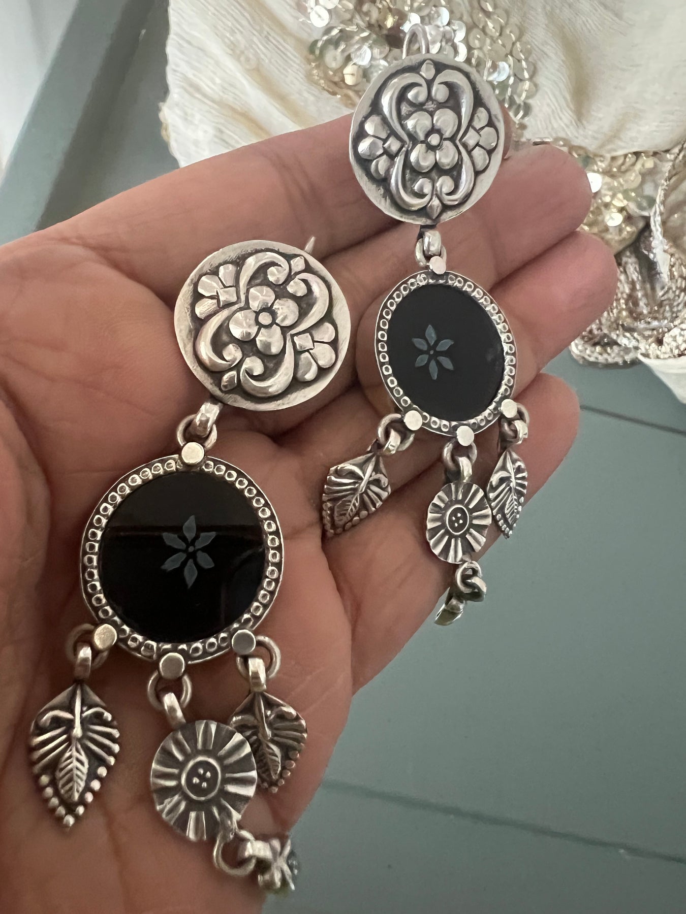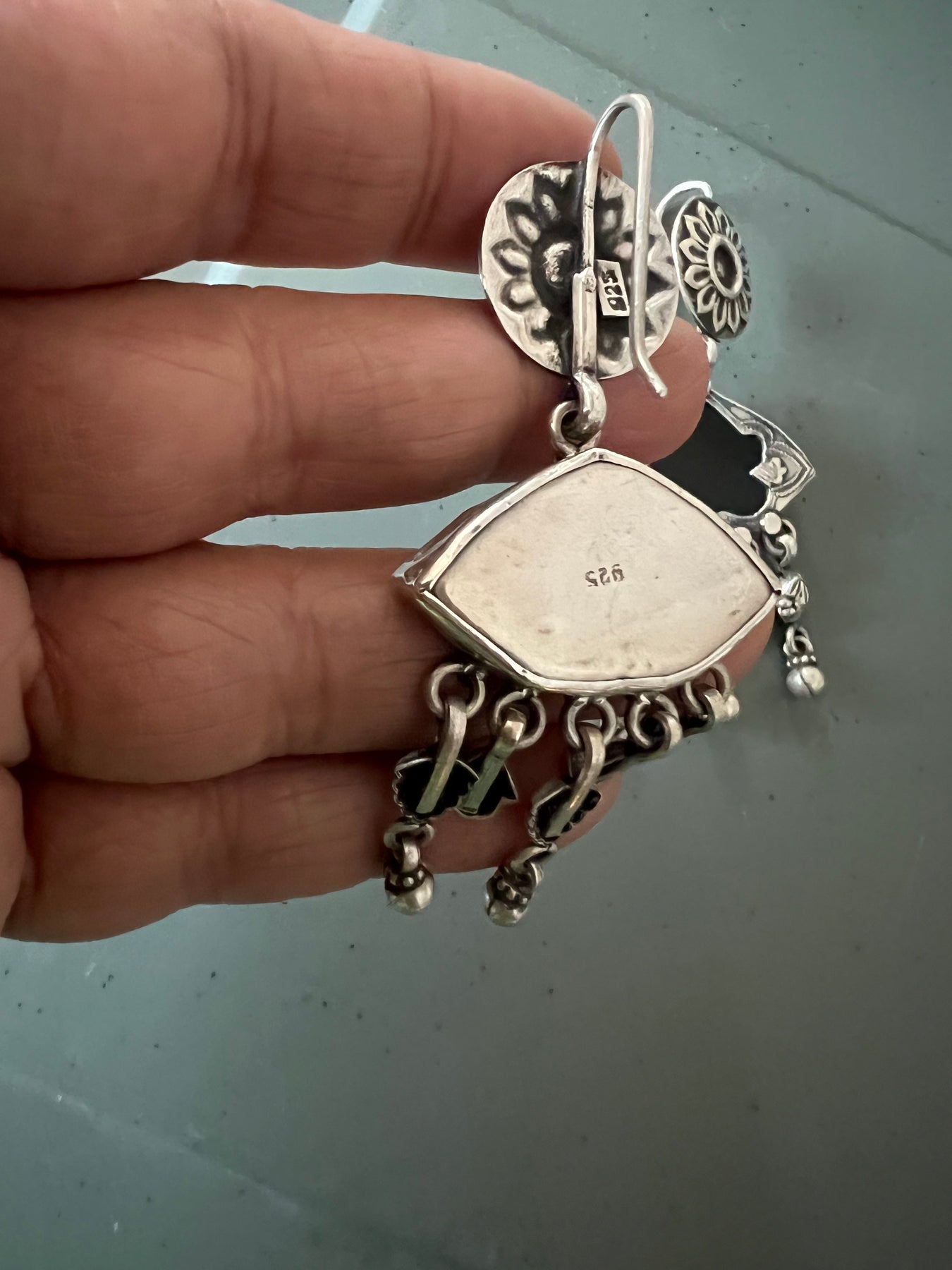 Black Glass 925 Silver Earrings | SHIVKA | Hallmarked | 6.5x3 cm | 16g Pair | Ear Wire Closure | Elegant Gift Jewelry