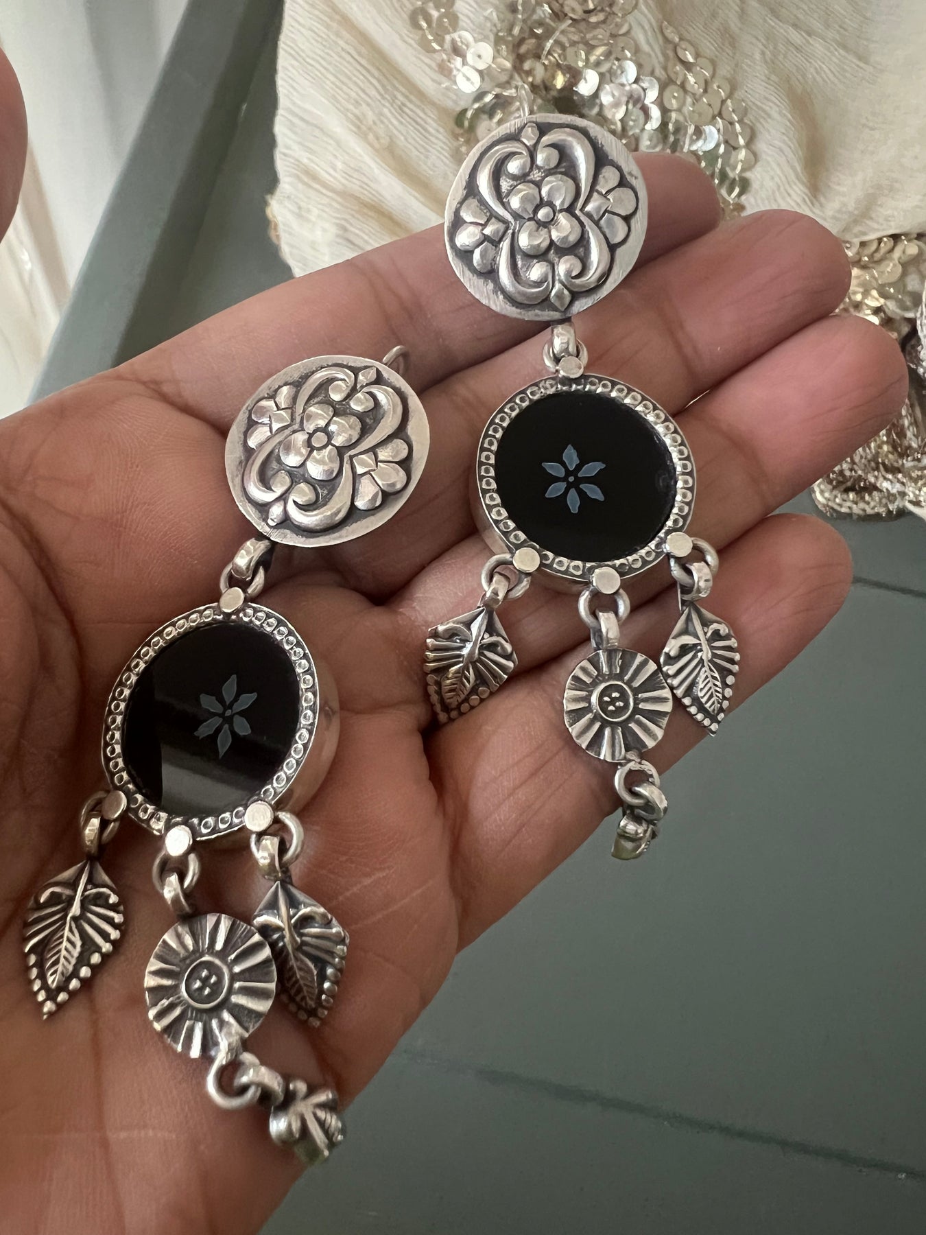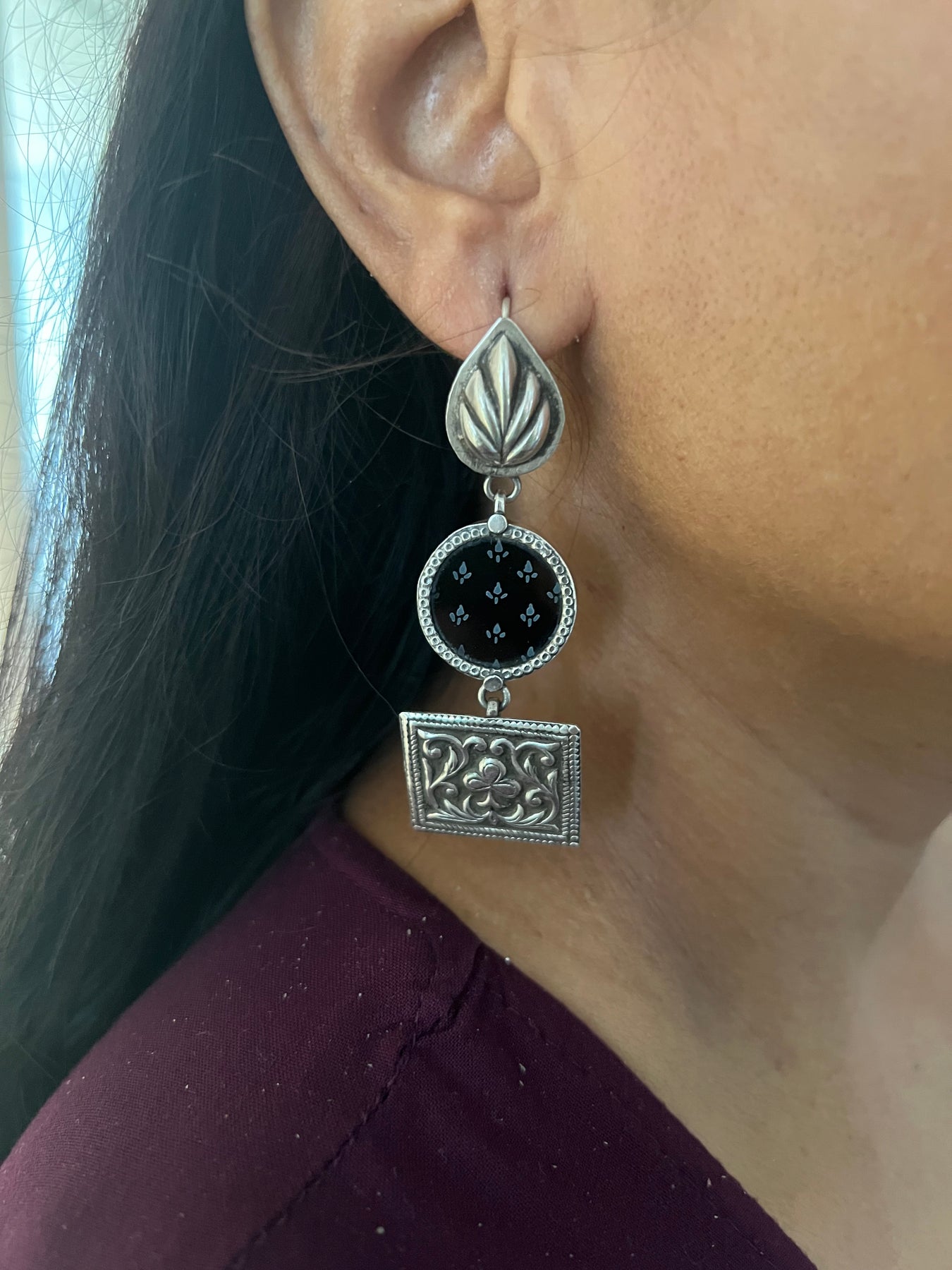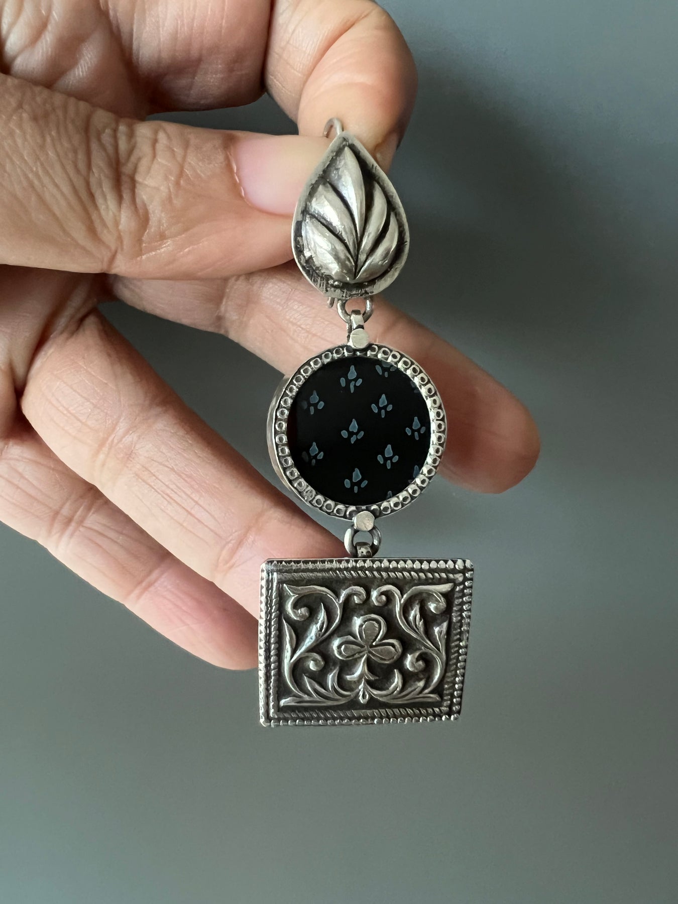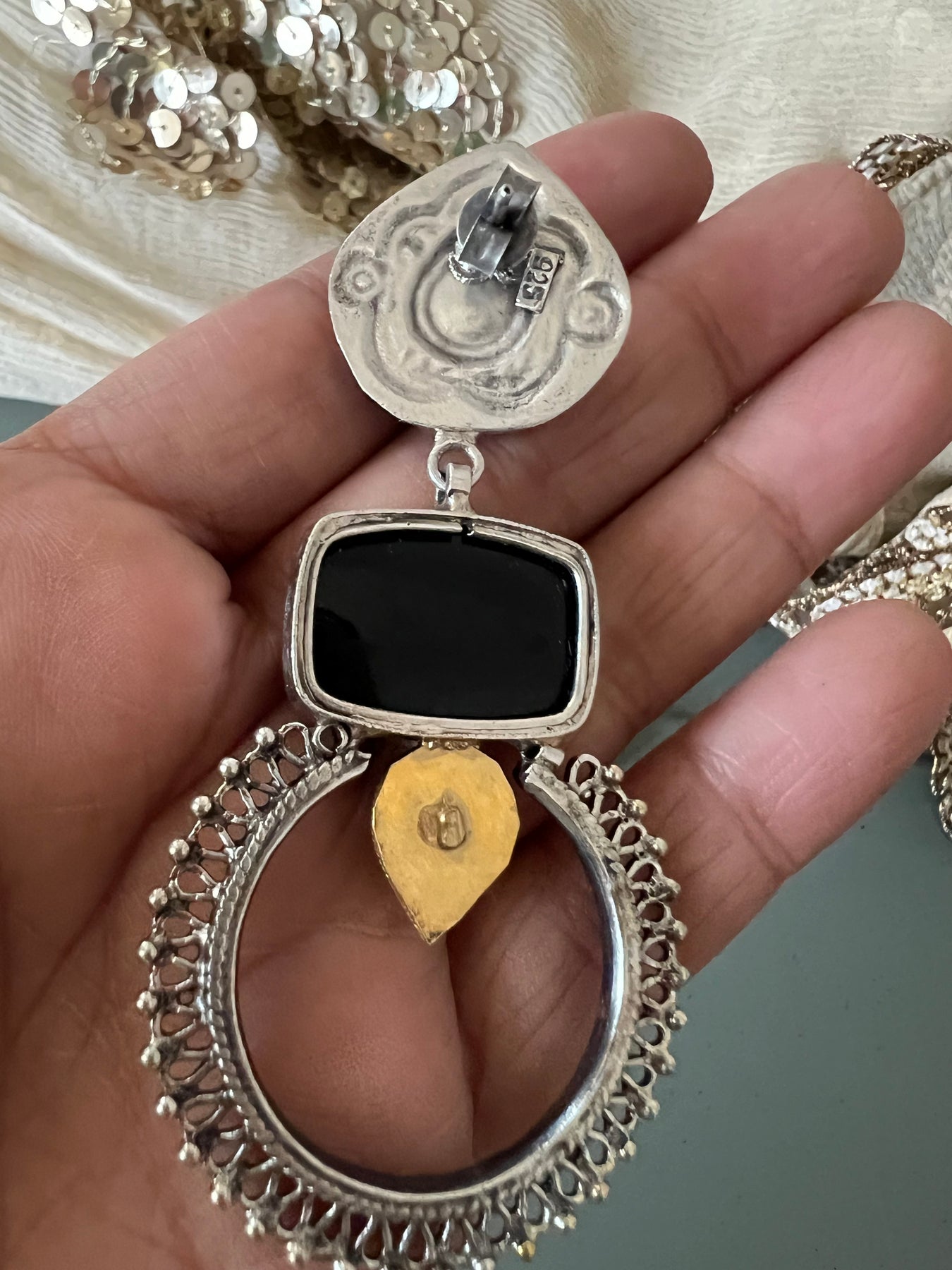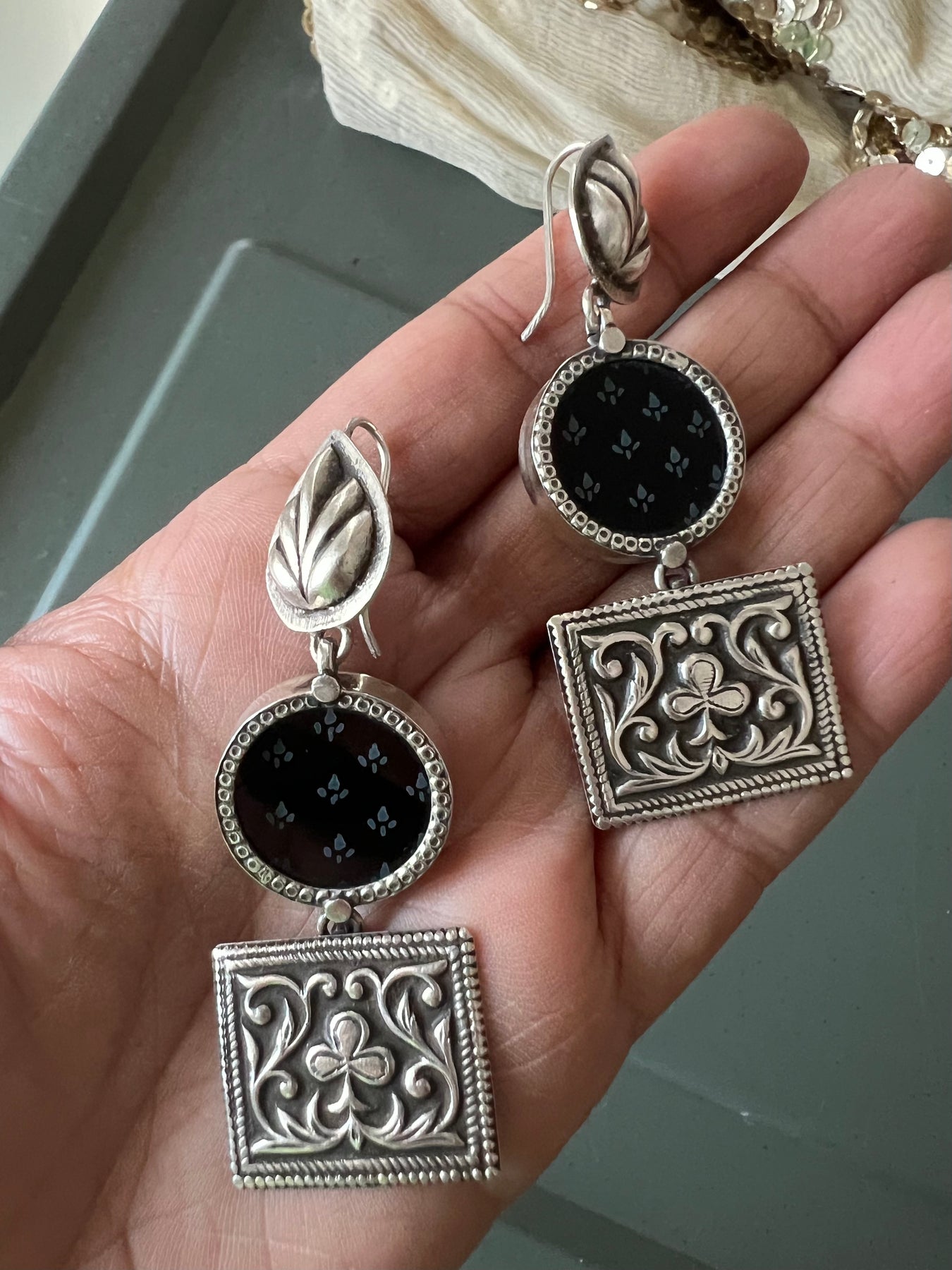 Each earring features sleek black art glass framed in pure 925 sterling silver, showcasing timeless elegance with a modern twist. Meticulously handmade by skilled Indian artisans for SHIVKA.