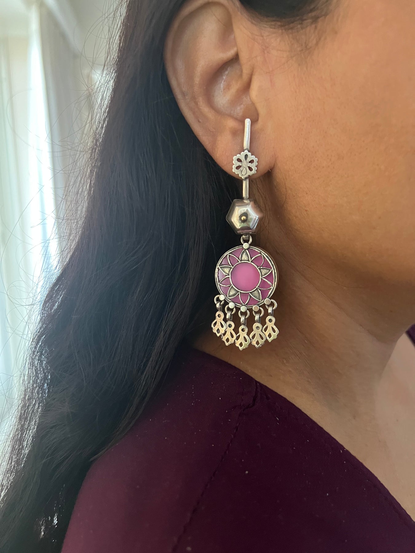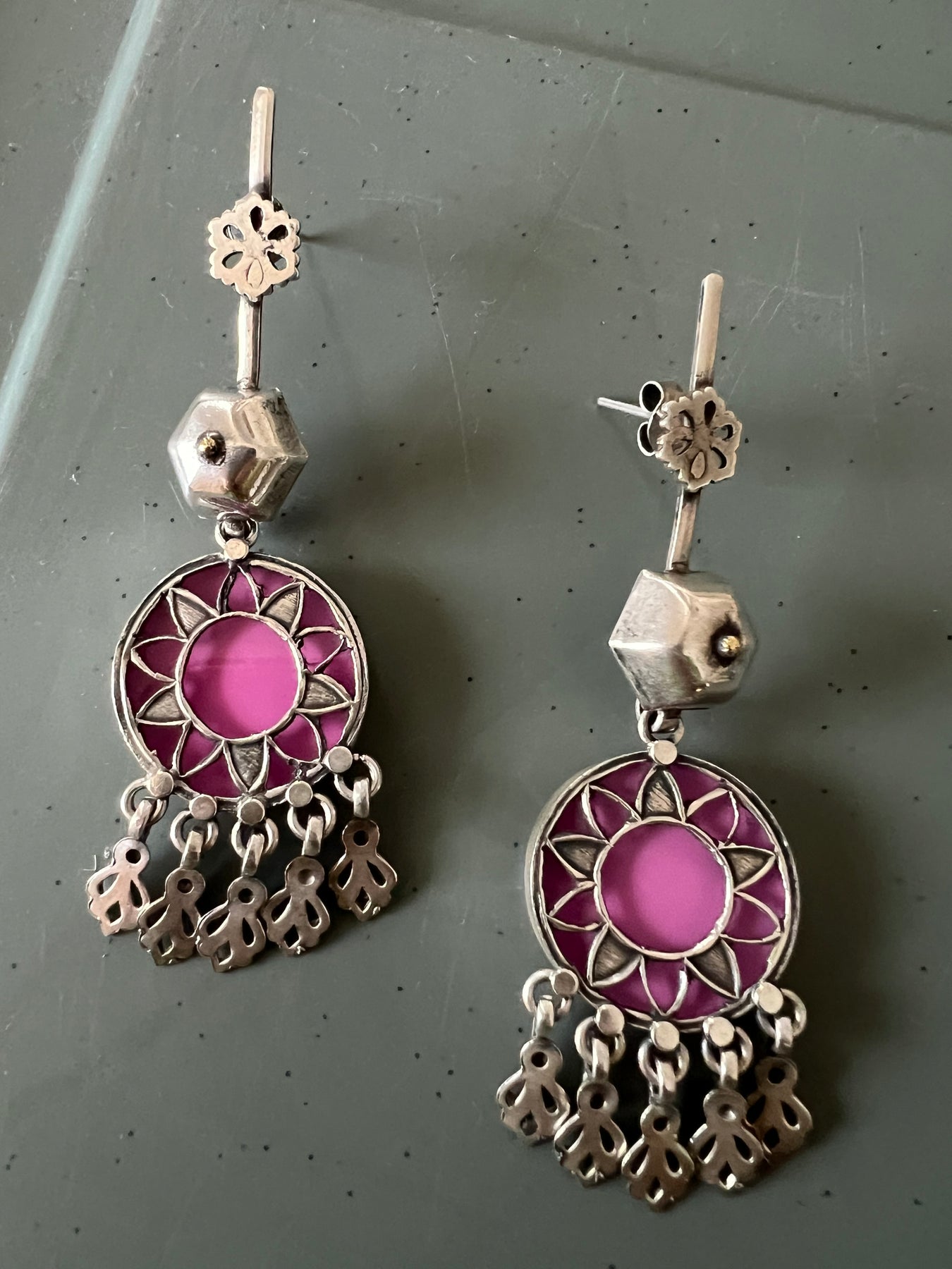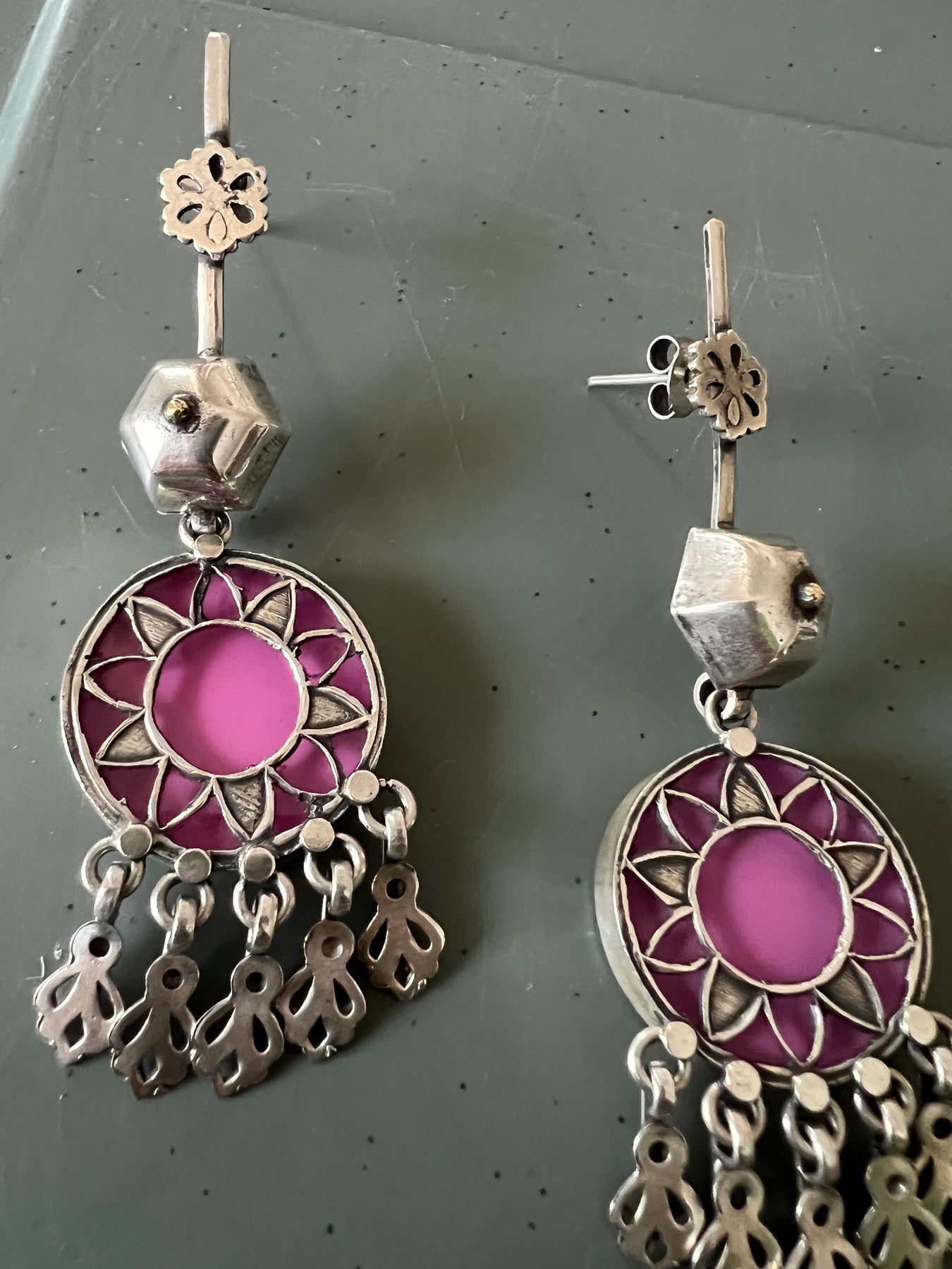 Pink Glass 925 Silver Earrings | SHIVKA | Hallmarked | 9x2.5 cm | 26g Pair | Push back Closure | Elegant Gift Jewelry