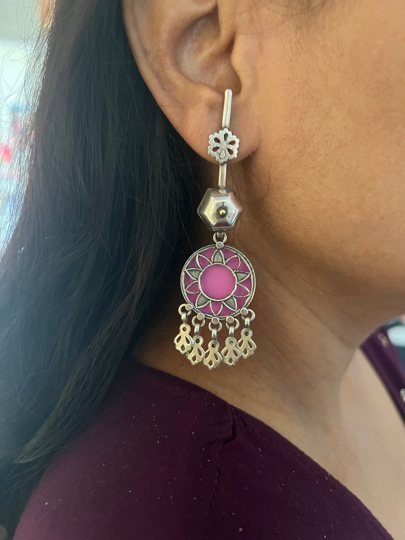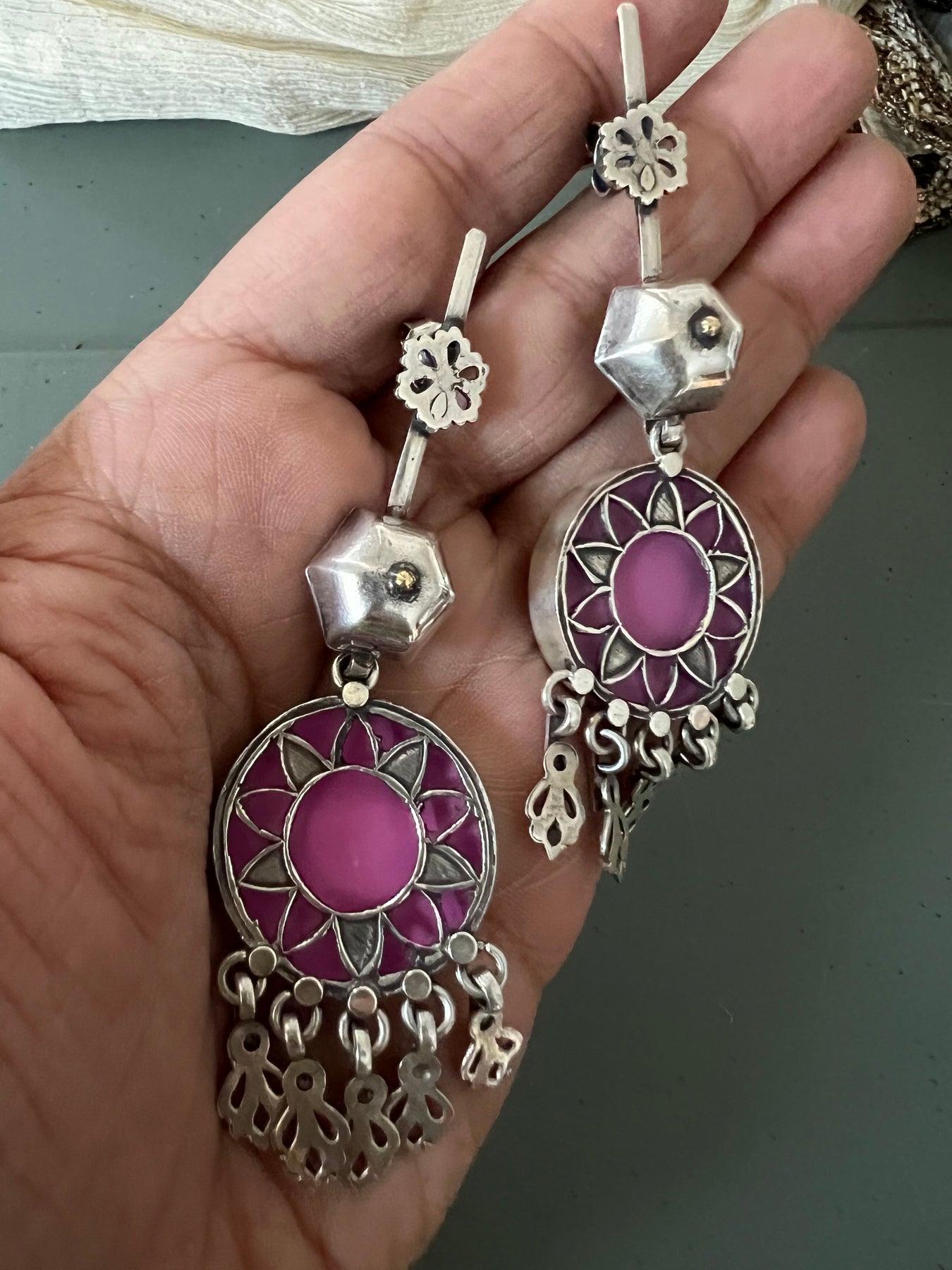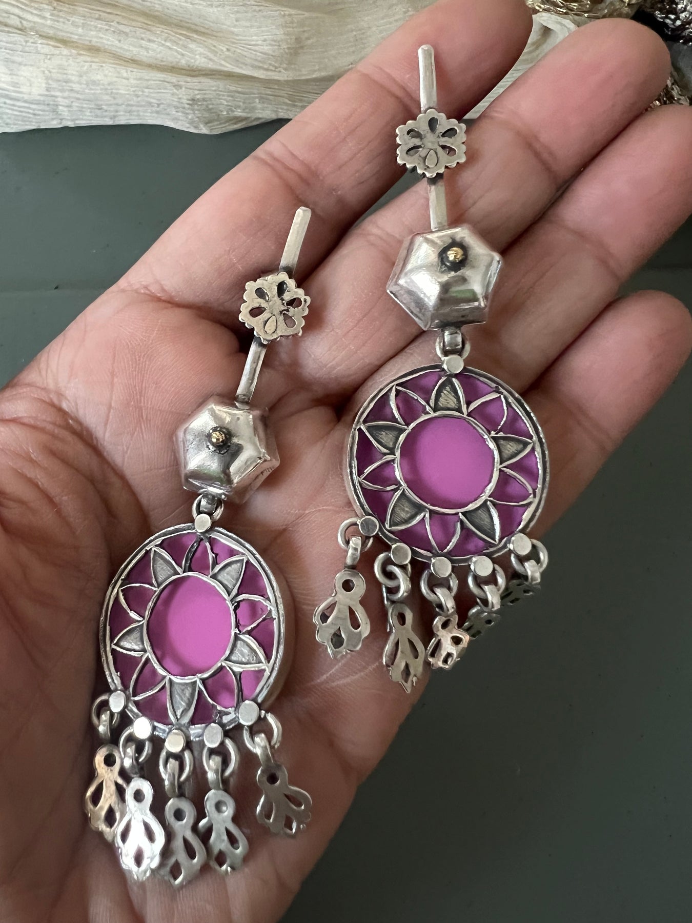 Pink Glass 925 Silver Earrings | SHIVKA | Hallmarked | 9x2.5 cm | 26g Pair | Push back Closure | Elegant Gift Jewelry