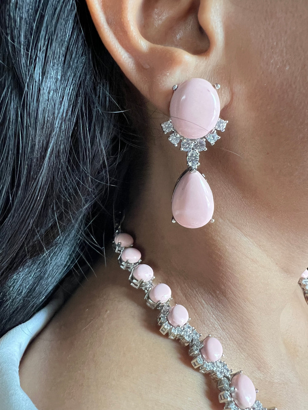 This handcrafted Peach Coral Necklace Set features premium-quality materials, blending brass, copper, silver, and silver plating with luxurious stones and faux diamonds. The necklace, designed for a striking look, is perfect for cocktail evenings and special gatherings. Necklace weight: 100 grams with a secure Hook Closure and is adjustable. Each earring measures 4.5cm* 2cm and weighs 18 grams per Pair, adding the perfect touch of elegance. A show-stopping accessory that’s sure to draw compliments, this unique set makes an unforgettable statement for any occasion. Push Back Closure with Extra Support Clip at the Back.