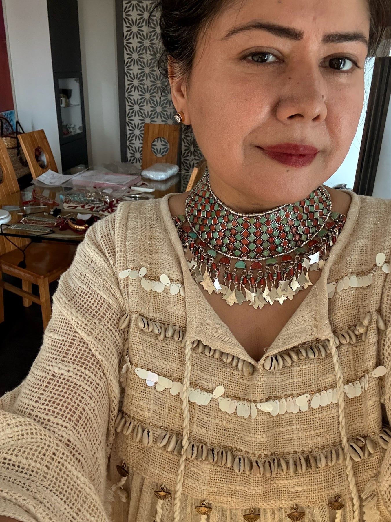 Regular price $1,705.00 Sale price $1,210.00 Save $495.00Make a royal statement with this Tasseled Vintage Handmade Choker Set by SHIVKA, crafted by Jaipur’s finest artisans using 925 Hallmarked Silver, Natural Coral, and turquoise stones.