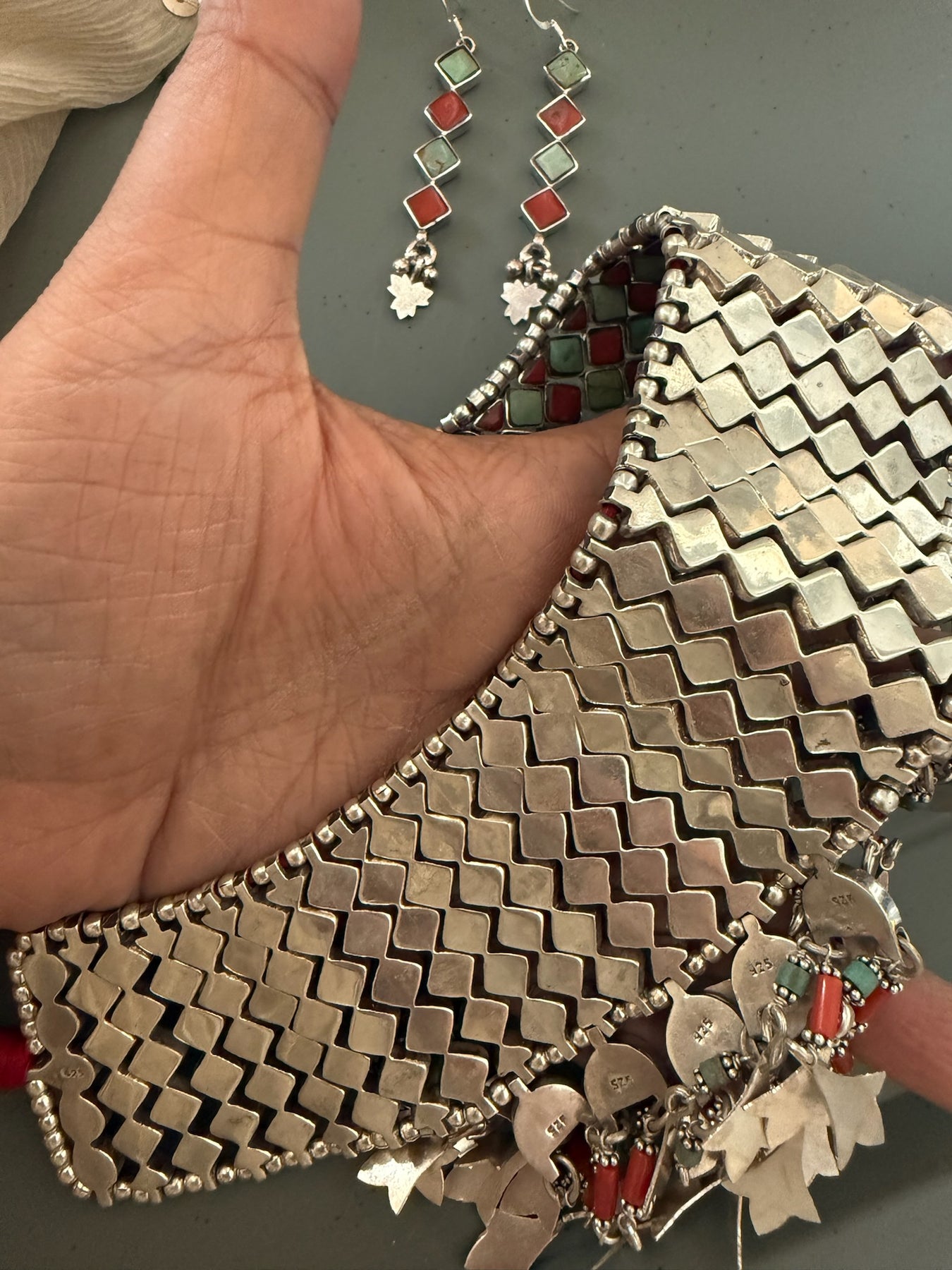 Tasseled 925 Silver Coral & Turquoise Choker Set– SHIVKA