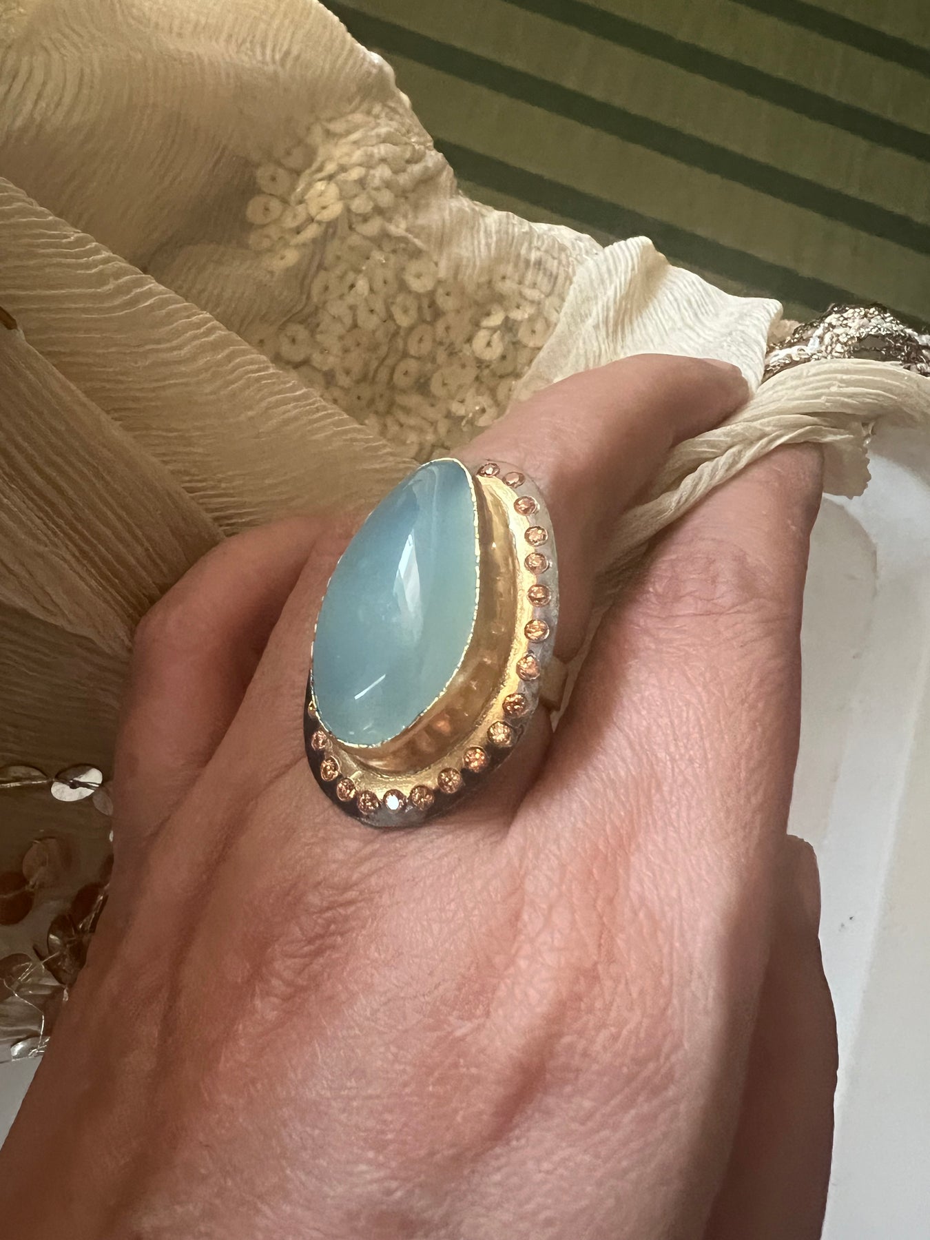 The bold Chalcedony centerpiece paired with a shimmering CZ border creates a dramatic, glamorous look — perfect for special occasions, cocktail parties, or simply standing out in style.