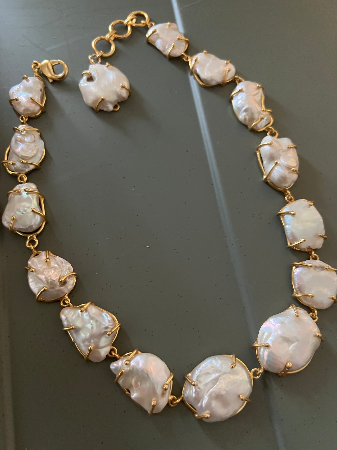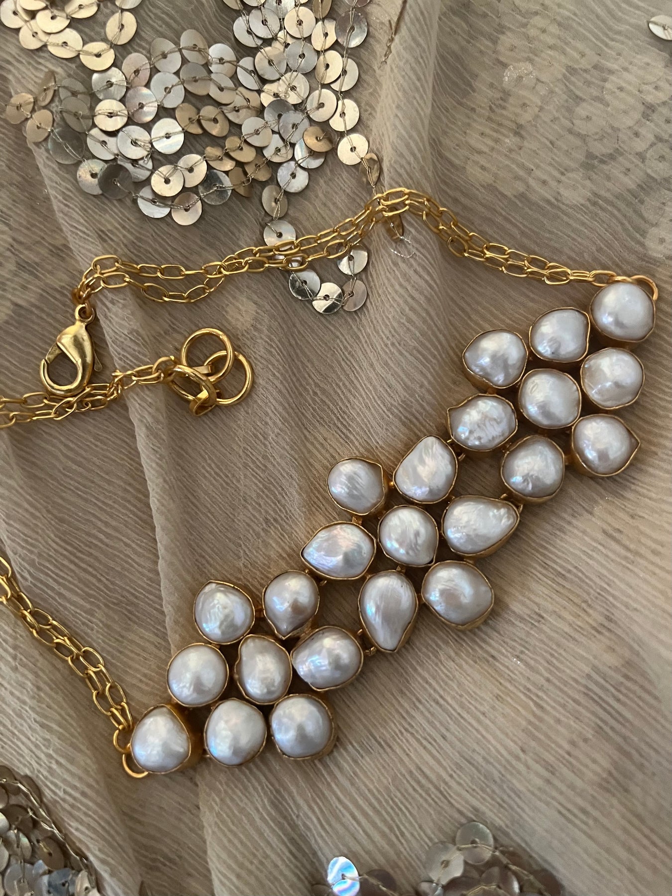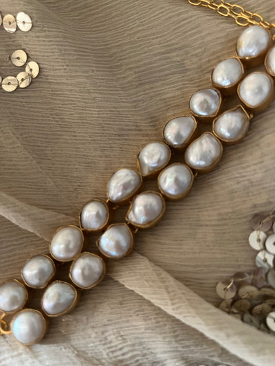 Regular price $176.00 Sale price $126.50 Save $49.50Handmade with care by our expert artisans, this elegant short necklace features natural baroque pearls set in premium brass. The adjustable design with a secure lobster claw closure ensures a perfect fit. Finished with high-quality gold polish for a sleek, long-lasting shine, it weighs 42 grams. Modern and sophisticated, this necklace is perfect for evening dinners and always draws compliments.
