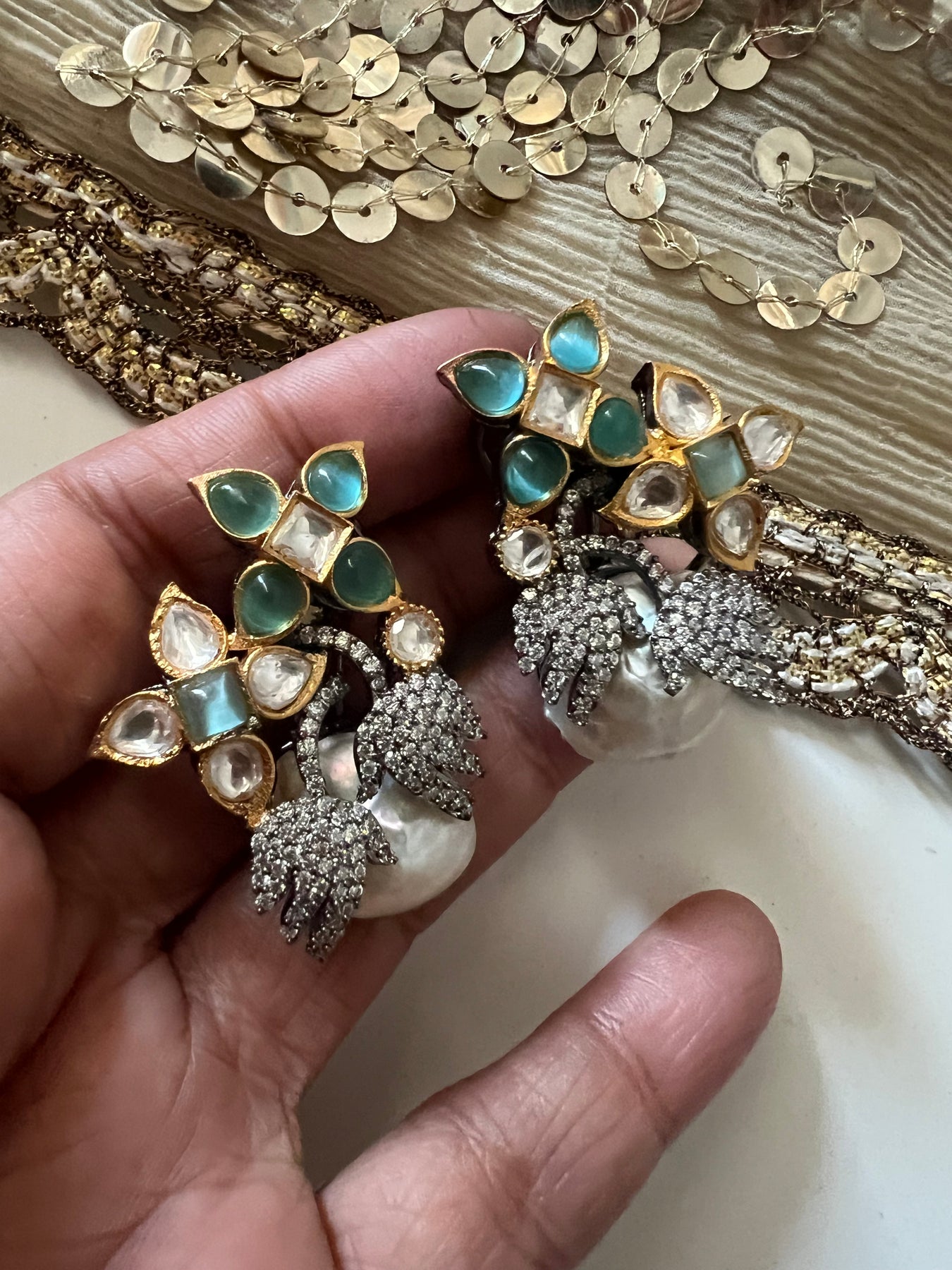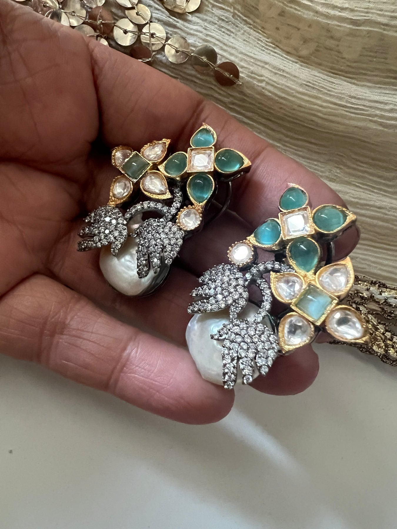 Regular price $77.00 Sale price $55.00 Save $22.00Handmade by our skilled artisans, these one-of-a-kind earrings feature natural pearls and gemstones set in high-quality brass with a long-lasting gold polish. Designed with a secure push back closure, they measure 6.5cm x 2.5cm and weigh 34 grams per pair. Elegant and modern, these statement earrings are perfect for evening dinners and sure to attract endless compliments.