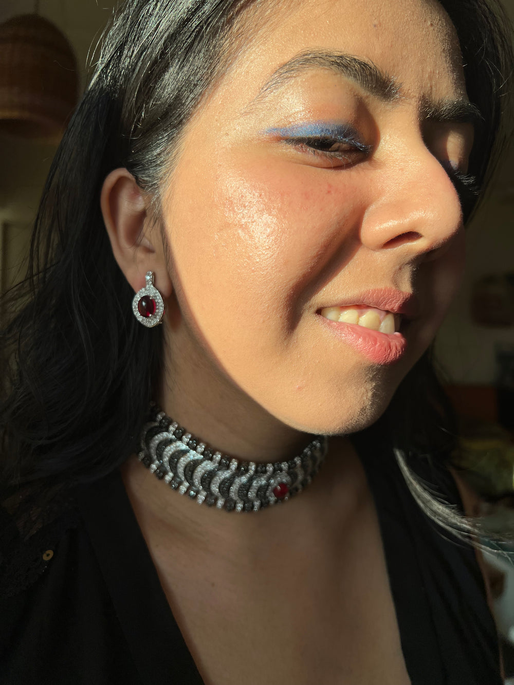 Introducing our exquisite Designer Choker Necklace Set by SHIVKA, a masterpiece crafted with premium brass, copper, and silver, adorned with intricate stone embellishments. This unique set is designed to make a statement at destination weddings and special occasions.