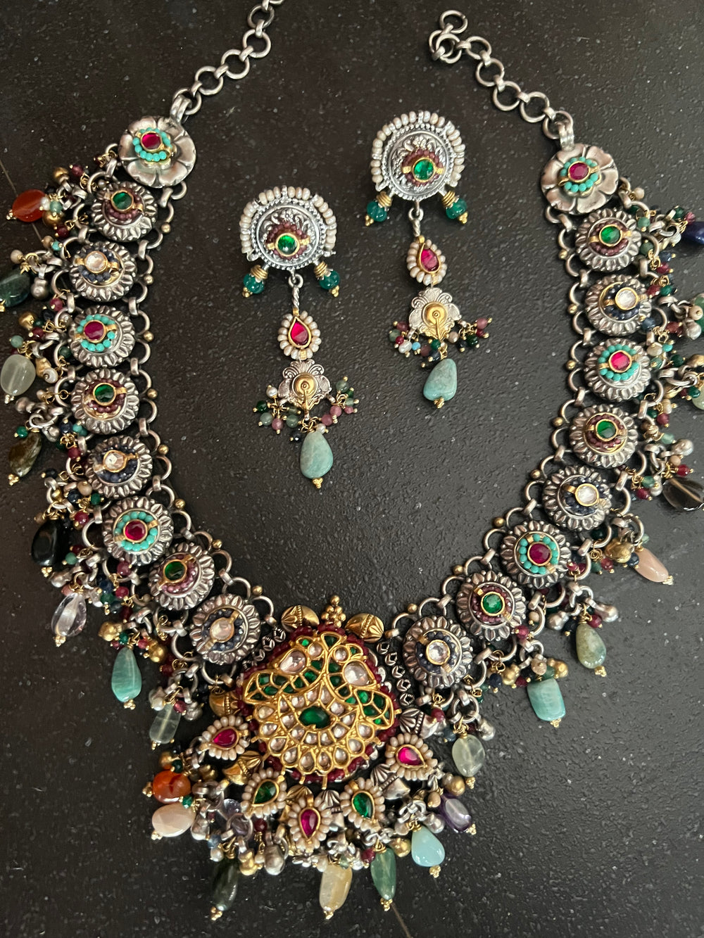 A stunning handmade 925 Silver Fusion Gemstones Kundan Necklace Set crafted by professional fine jewelry local Indian artisans. Made using 925 Hallmarked Silver, premium natural gemstones, and exquisite Kundan embellishments, this masterpiece features a luxurious dual-tone polish that enhances its vintage elegance.