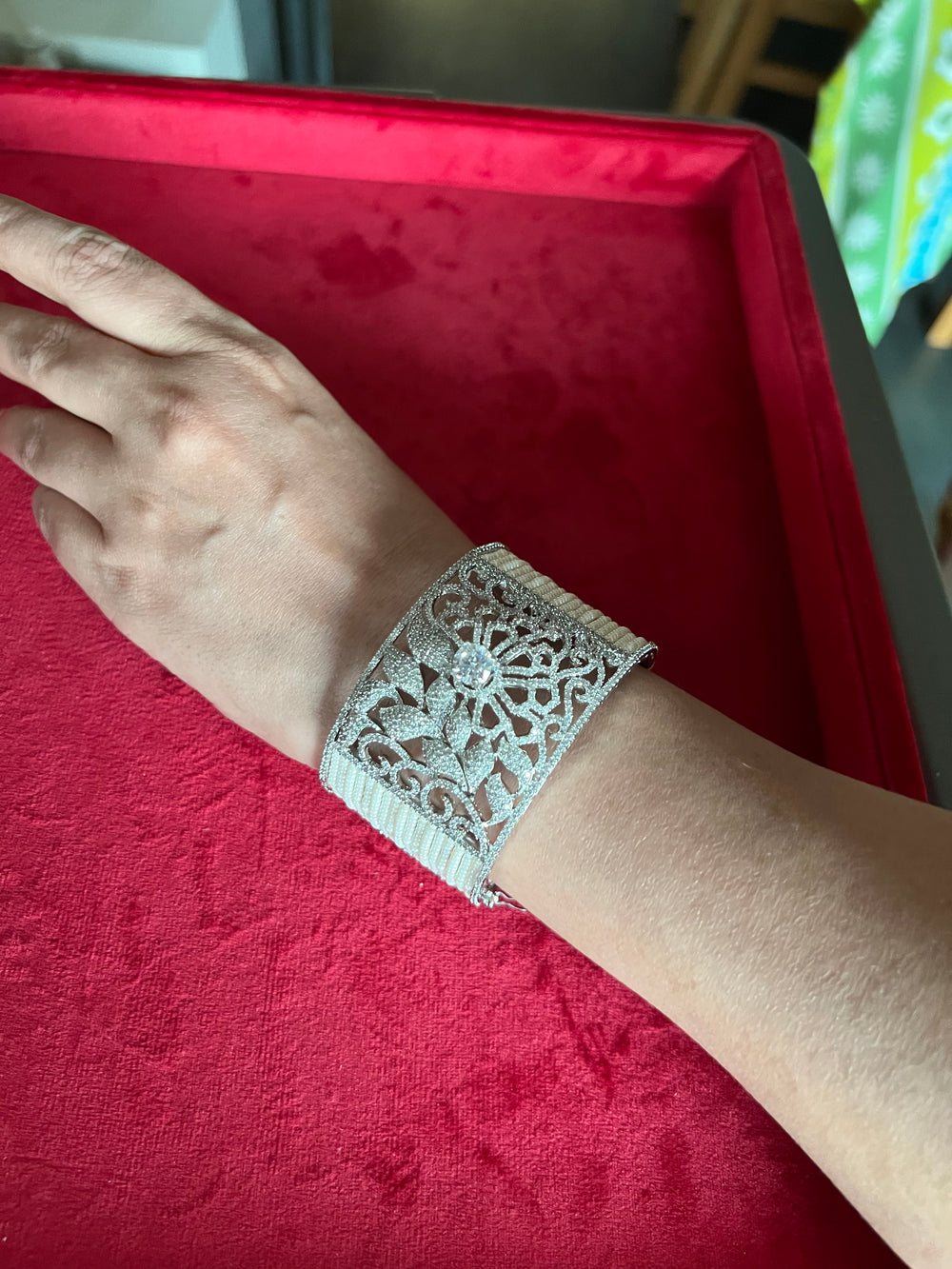 A new addition to our product line by our artisans. Perfect Jewelry for cocktails Material: Brass and copper mix, rhodium plated The bracelet is the same as shown in the picture and in the video. We have only one piece in this design and color and hence you get what you see in the picture. For wrist sizes 2.2 to 2.4 Easily openable