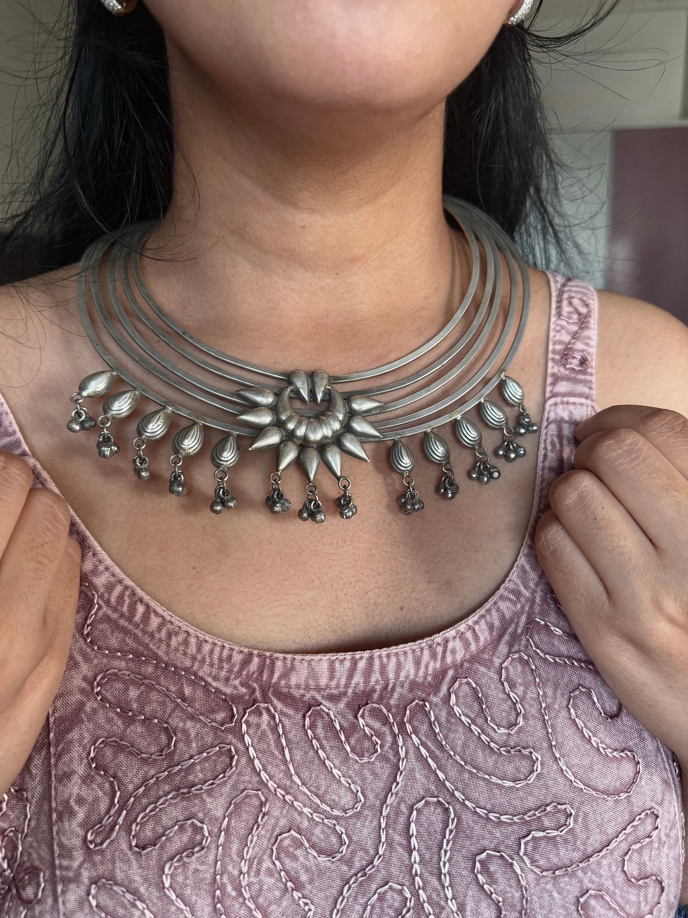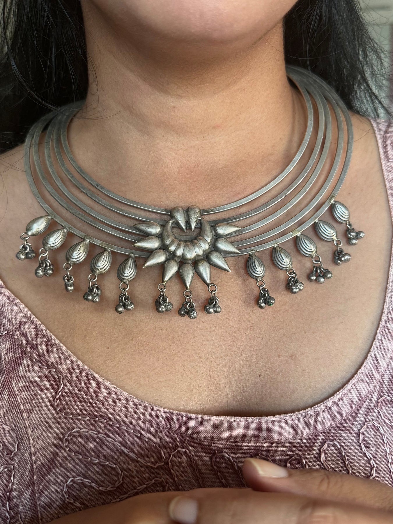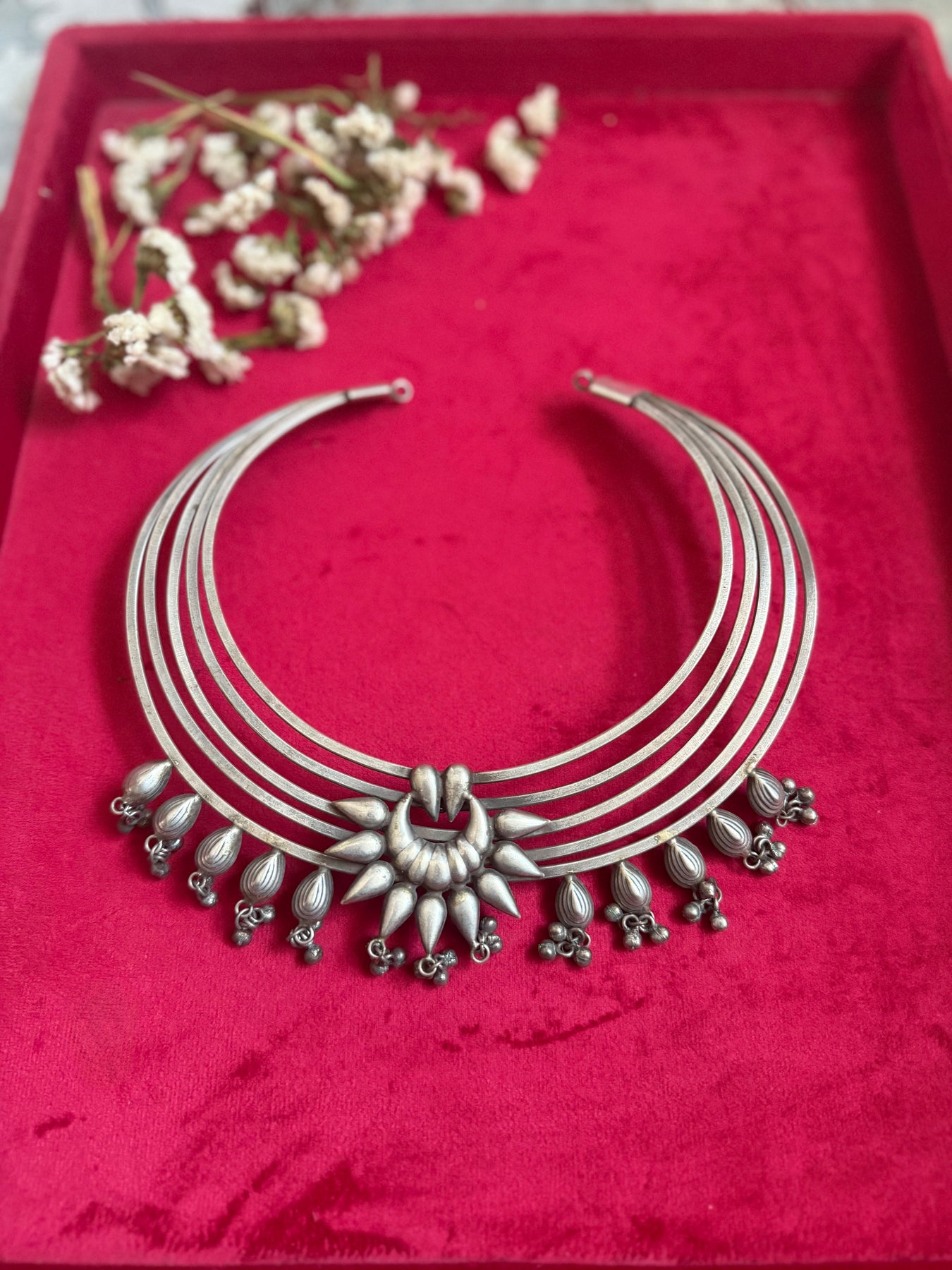 Handmade by skilled artisans, this striking tribal Hasli necklace is crafted in premium quality brass with a rich antique polish for a timeless ethnic look. Weighing 115 grams, this bold and elegant statement piece reflects traditional craftsmanship with a modern appeal. A unique handcrafted necklace that attracts endless compliments and enhances any outfit effortlessly.
