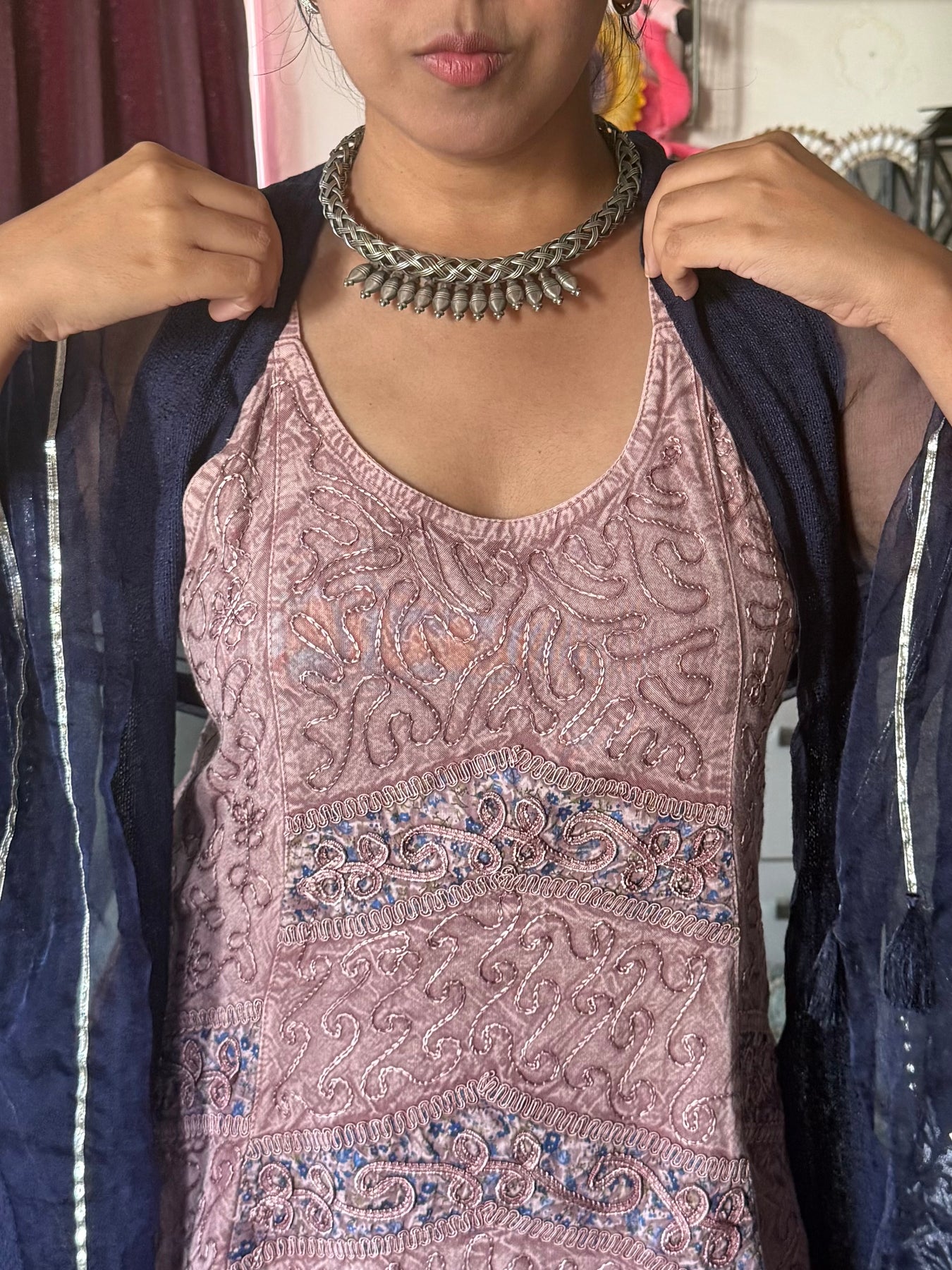 Handmade by skilled artisans, this striking tribal Hasli necklace is crafted in premium quality brass with a rich antique polish for a timeless ethnic look. Weighing 70 grams, this bold and elegant statement piece reflects traditional craftsmanship with a modern appeal. A unique handcrafted necklace that attracts endless compliments and enhances any outfit effortlessly.