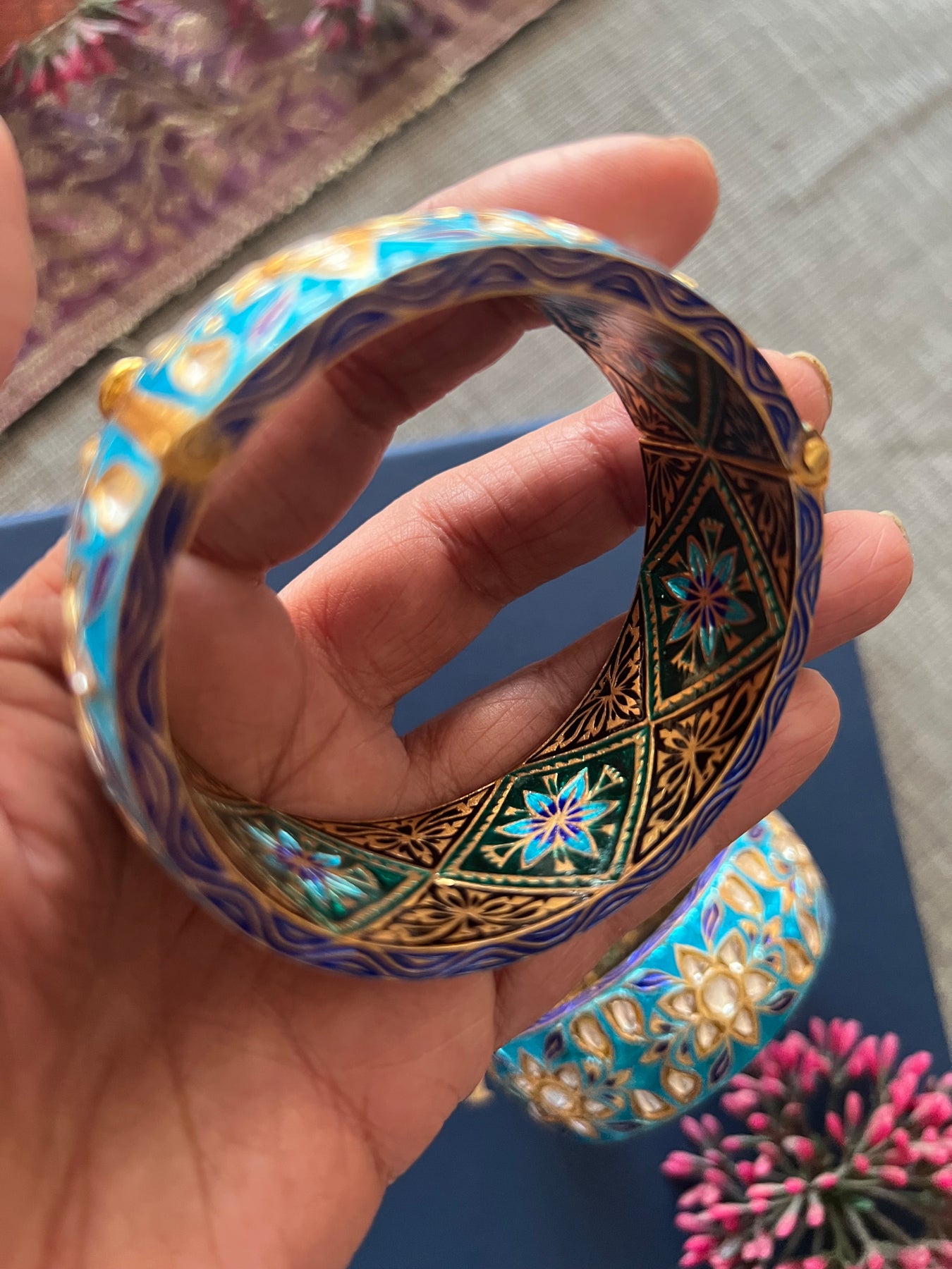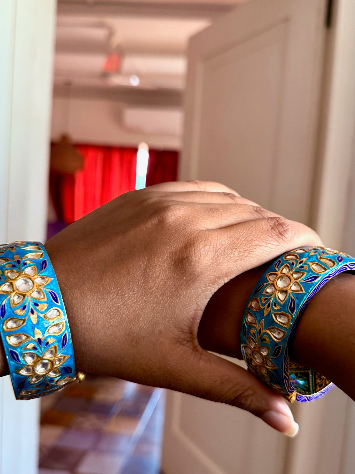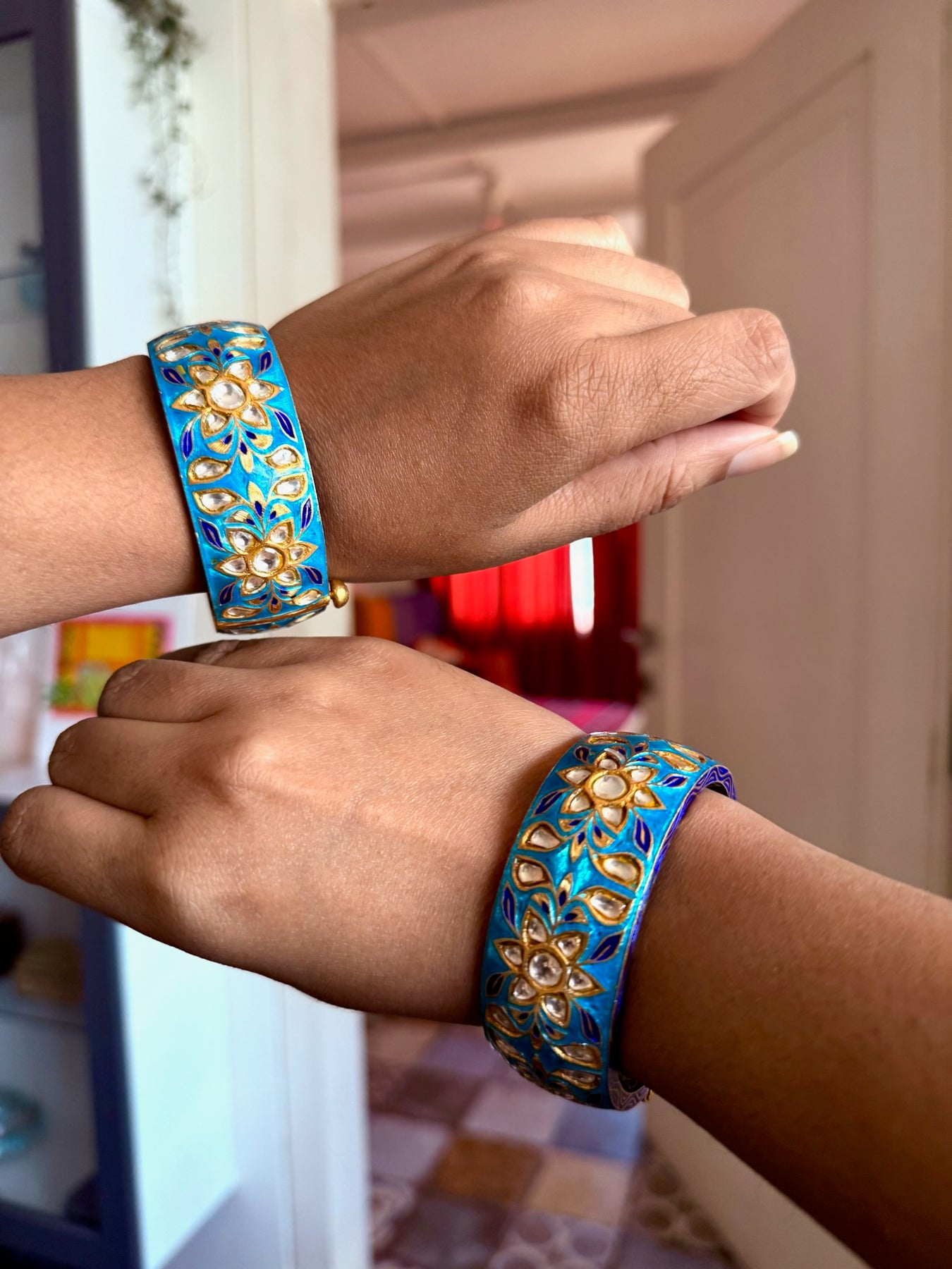 Premium Enamelled Kundan Kada Set of 2 by SHIVKA in 925 Hallmarked Silver. Openable with secure screw lock. Recommended size 2.4, inner diameter 2.25 inches. Total weight: 180 grams. A perfect designer piece for festive occasions and destination weddings that attracts endless compliments.