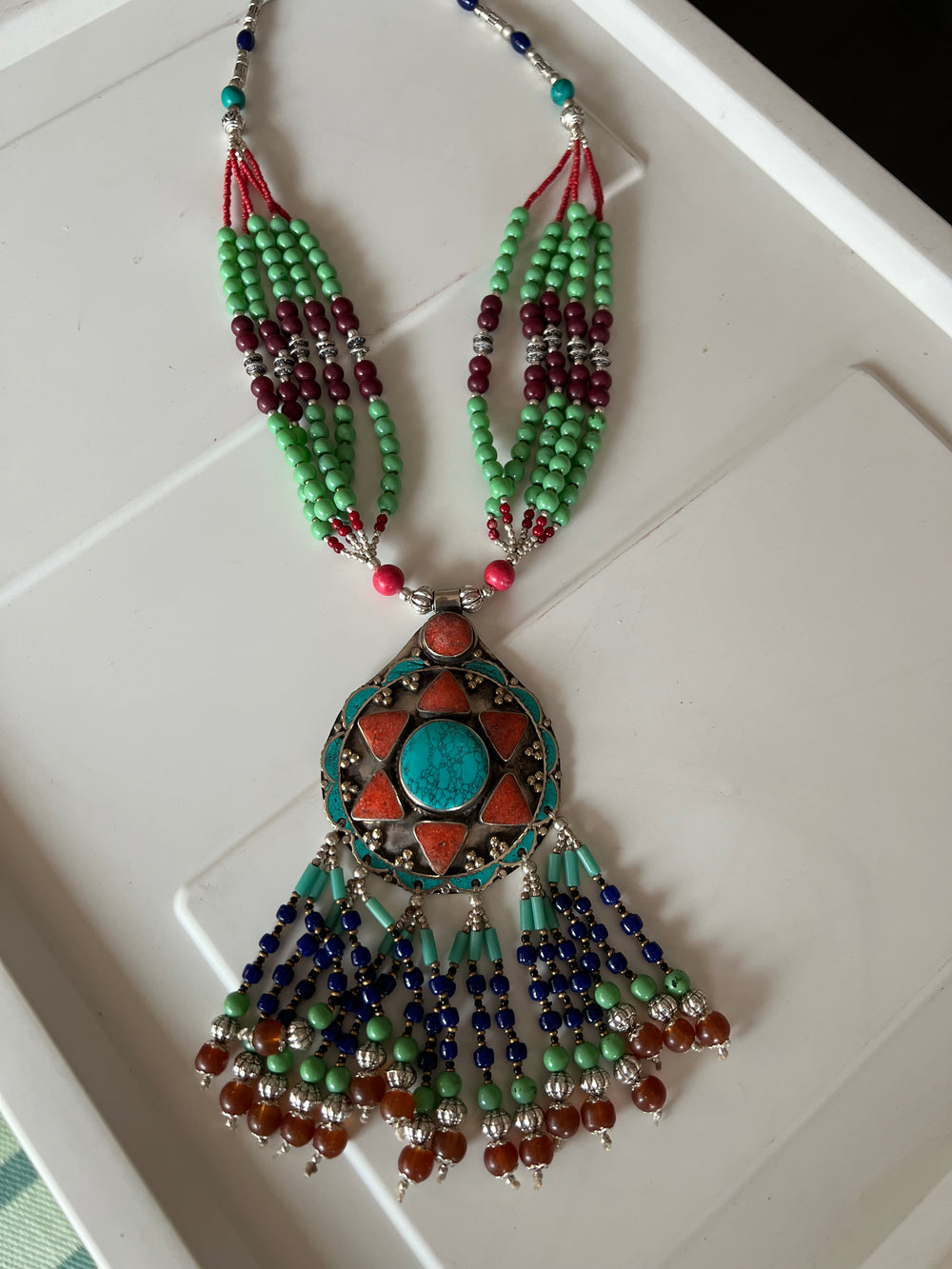Complement your personality with this trendy unique design. The gorgeous necklace is beautifully handcrafted by our skilled Indian craftsmen in stones and beads. Material: German Silver. Weight of the necklace is 210 grams. The length of the necklace when falls on the body is approximately 12 inches. Hook closure. Height of Pendant with Tassels is 6 inches. Width of Pendant is 3 inches.