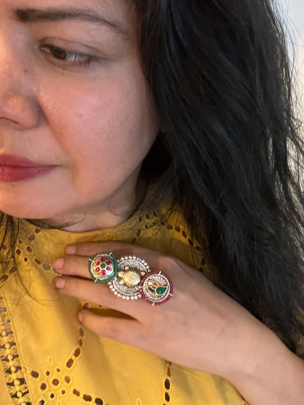 This gorgeous ring will add a perfect charm to your festive wear and will uplift your spirits. Material: 925 Silver/ Sterling Silver, Kundan embellishments, Fresh water pearls, dual tone polished. Size: Adjustable Length of ring: 6.5 cm. Weight of ring: 26 grams. Hallmarked.
