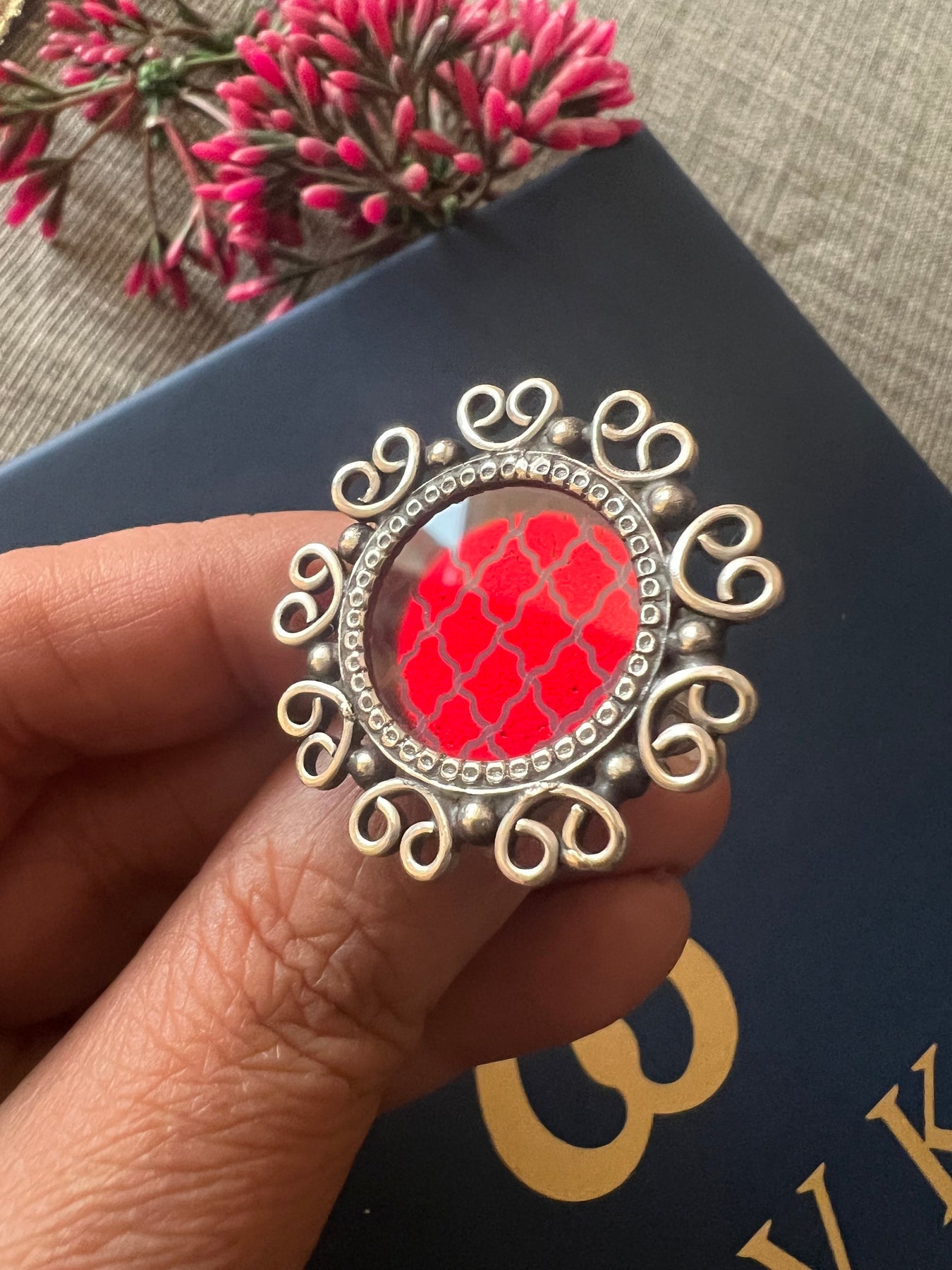 Premium 925 Silver ring with deep red glass and 3 cm top diameter. Adjustable size, weight 10 g. A perfect festive designer piece that attracts compliments.