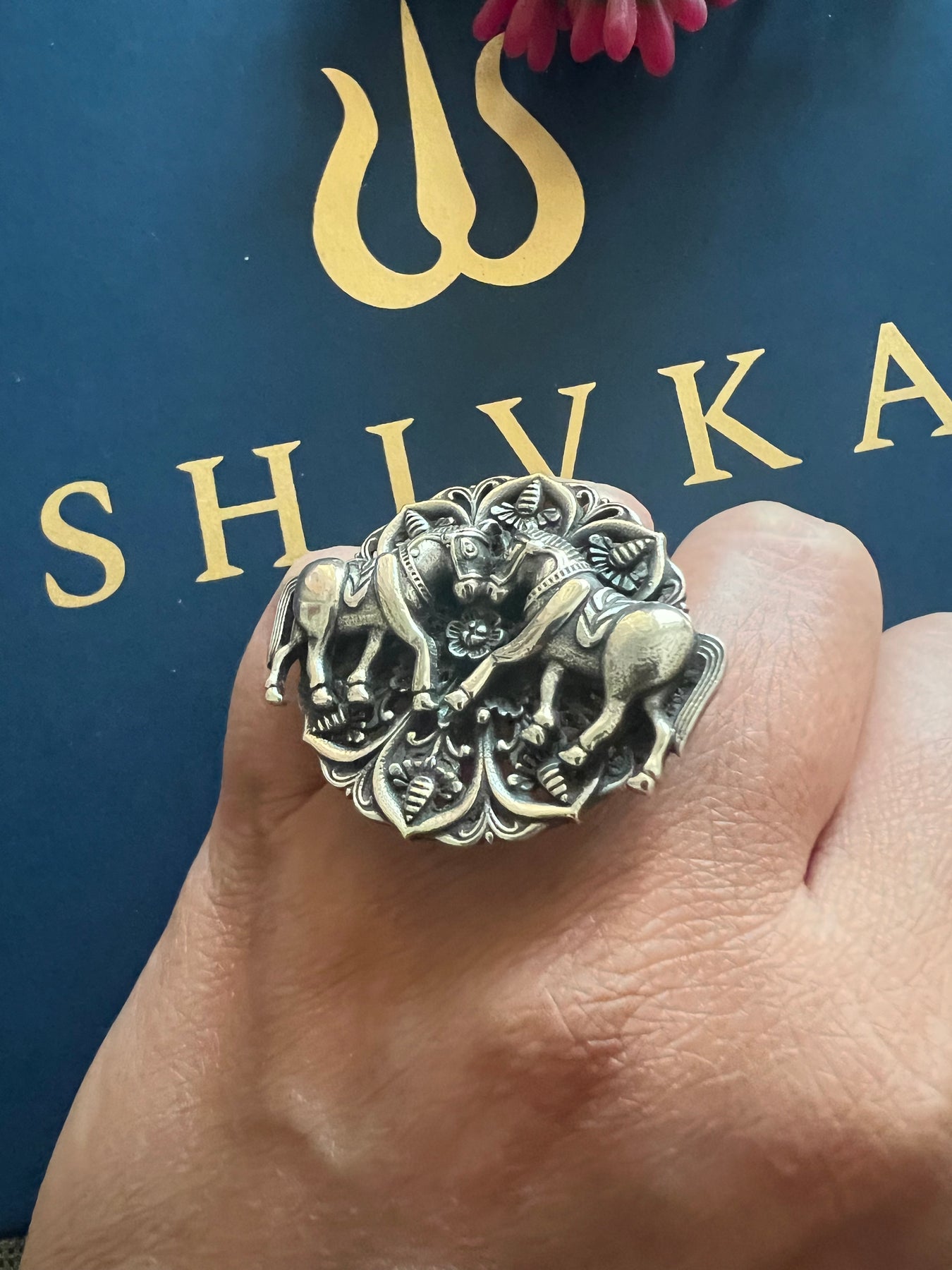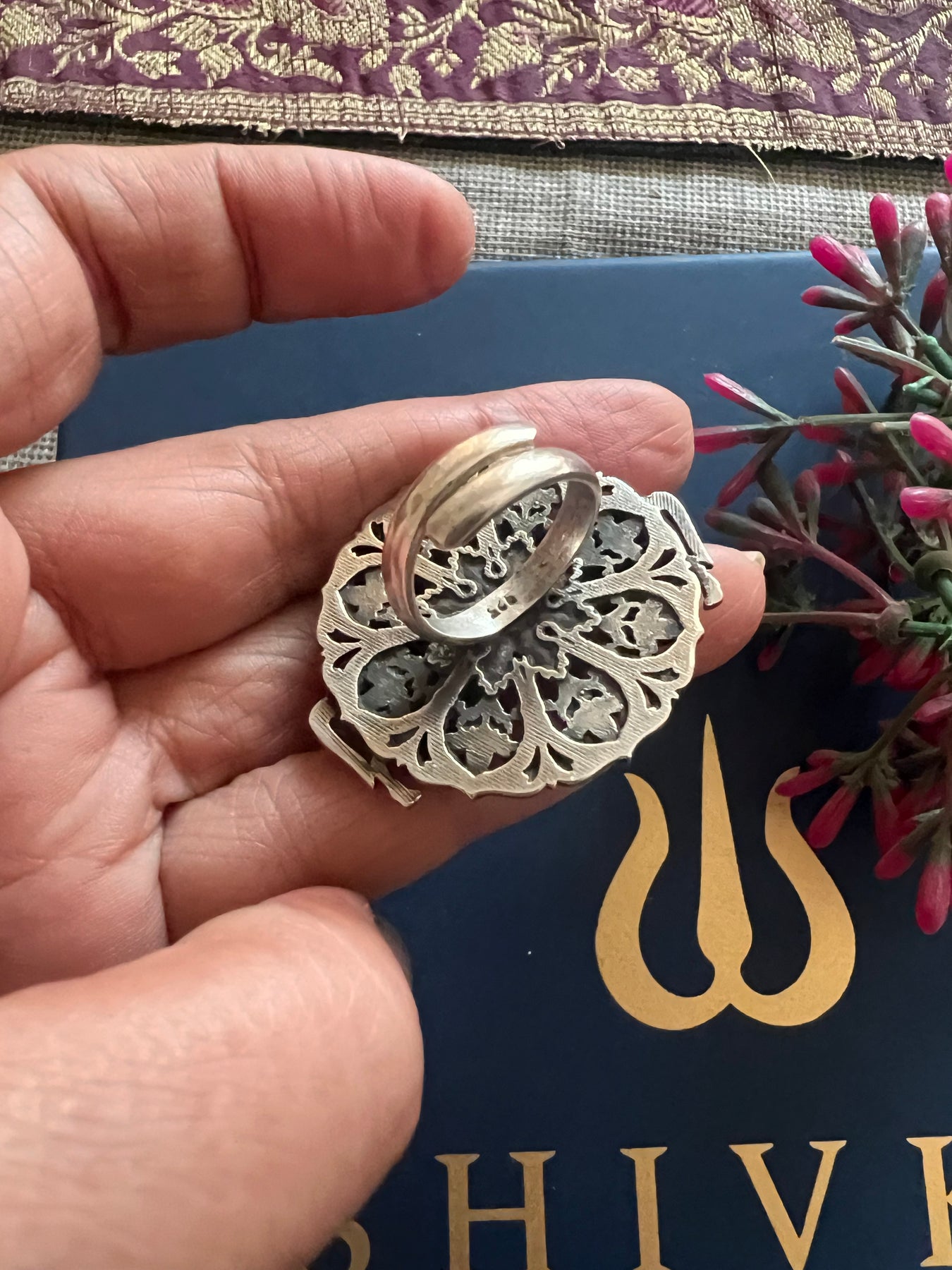 Handmade 925 Silver ring with bold 3.5 cm length and 4 cm width at top. Adjustable size, weight 20 g. A perfect festive designer piece that attracts compliments.