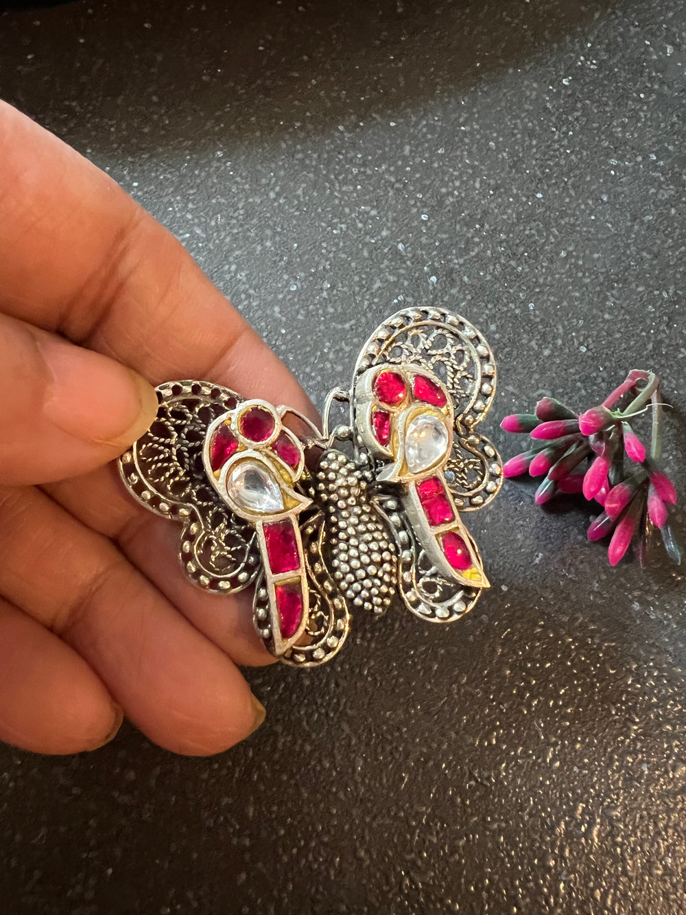 This gorgeous ring will add a perfect charm to your festive wear and will uplift your spirits. Material: Hallmarked 925 Silver, kundan brooch on top Size: Adjustable Weight of the ring is 20 g. Hallmarked