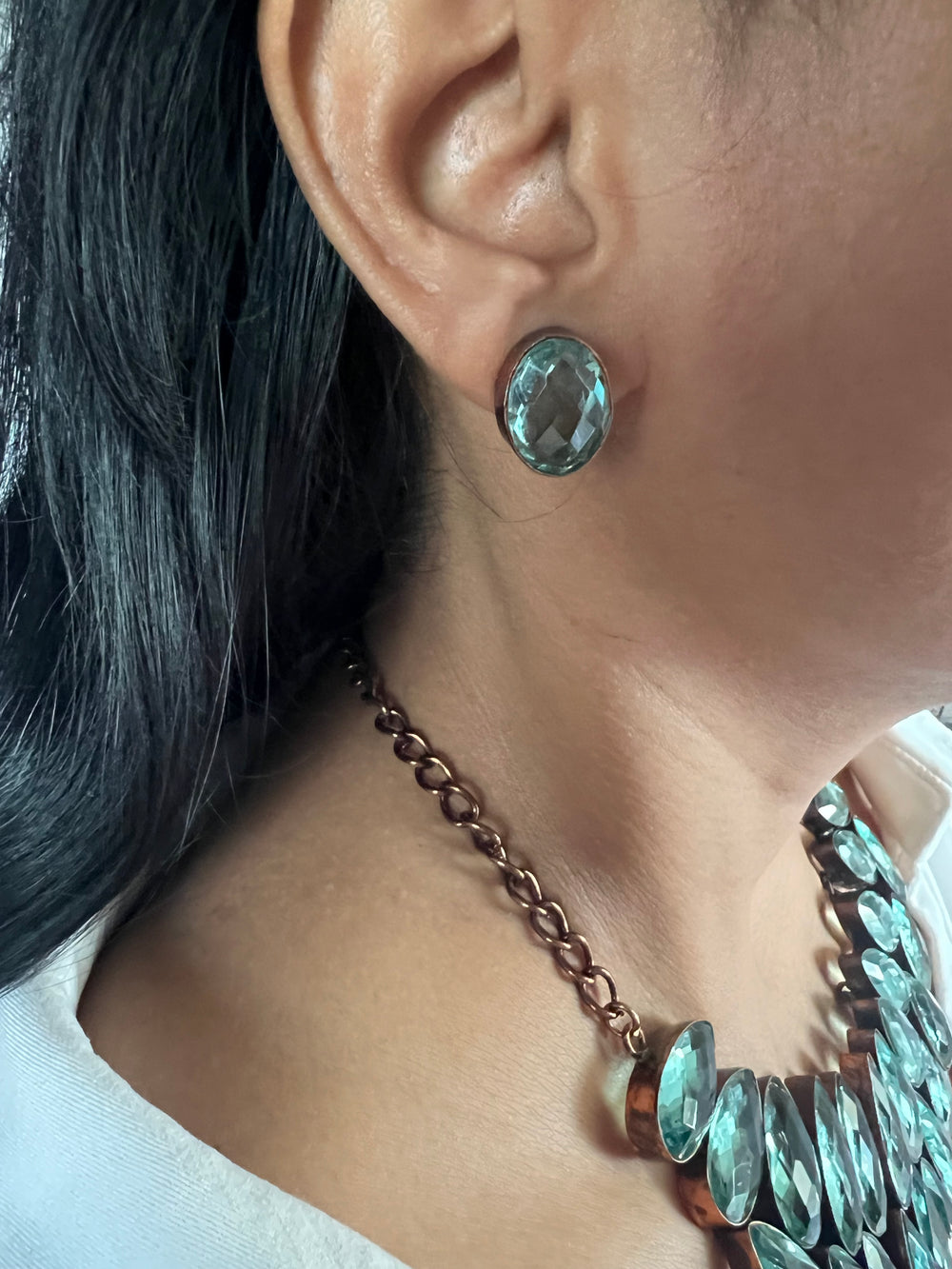 Simply Stylish and Elegant! A gorgeous one-of-a-kind designer piece for fashion lovers! Purely handmade with love by our skilled Indian craftsmen from Jaipur Handcrafted in high quality brass, Crystals and Copper plating Weight of the necklace is 125 grams Lobster Claw closure. Adjustable. Weight of Stud Earrings: 8 grams per pair. Crystal Color: Light Blue