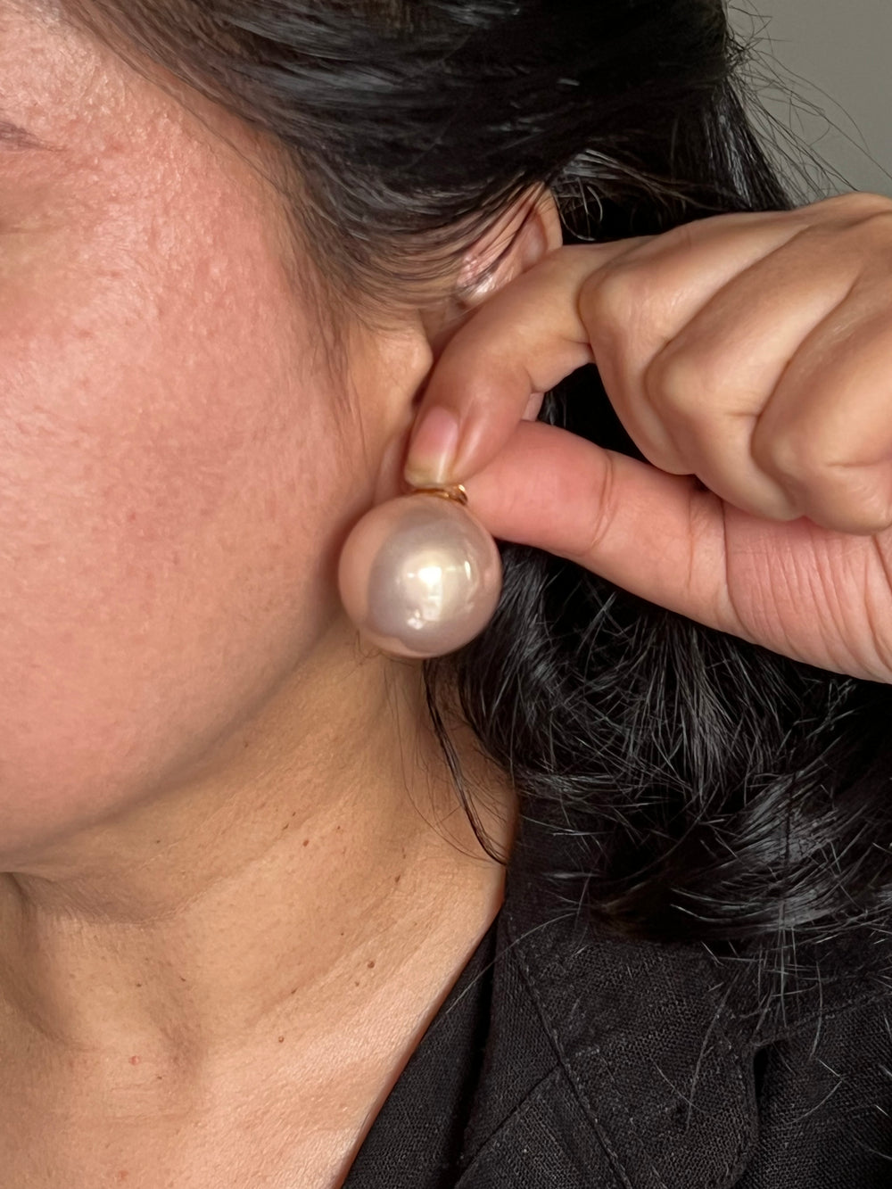 Premium quality, handcrafted from the best quality brass with a stunning gold polish. These statement earrings feature oversized pearls, weighing approximately 20 grams per pair, and are designed to stand out and draw compliments. Perfect for most outings and ceremonies, these earrings are a versatile addition to your collection, adding an elegant touch to any look. Diameter 25mm. Push Back Closure with Extra Support Clip at the Back. Color: Rose Gold