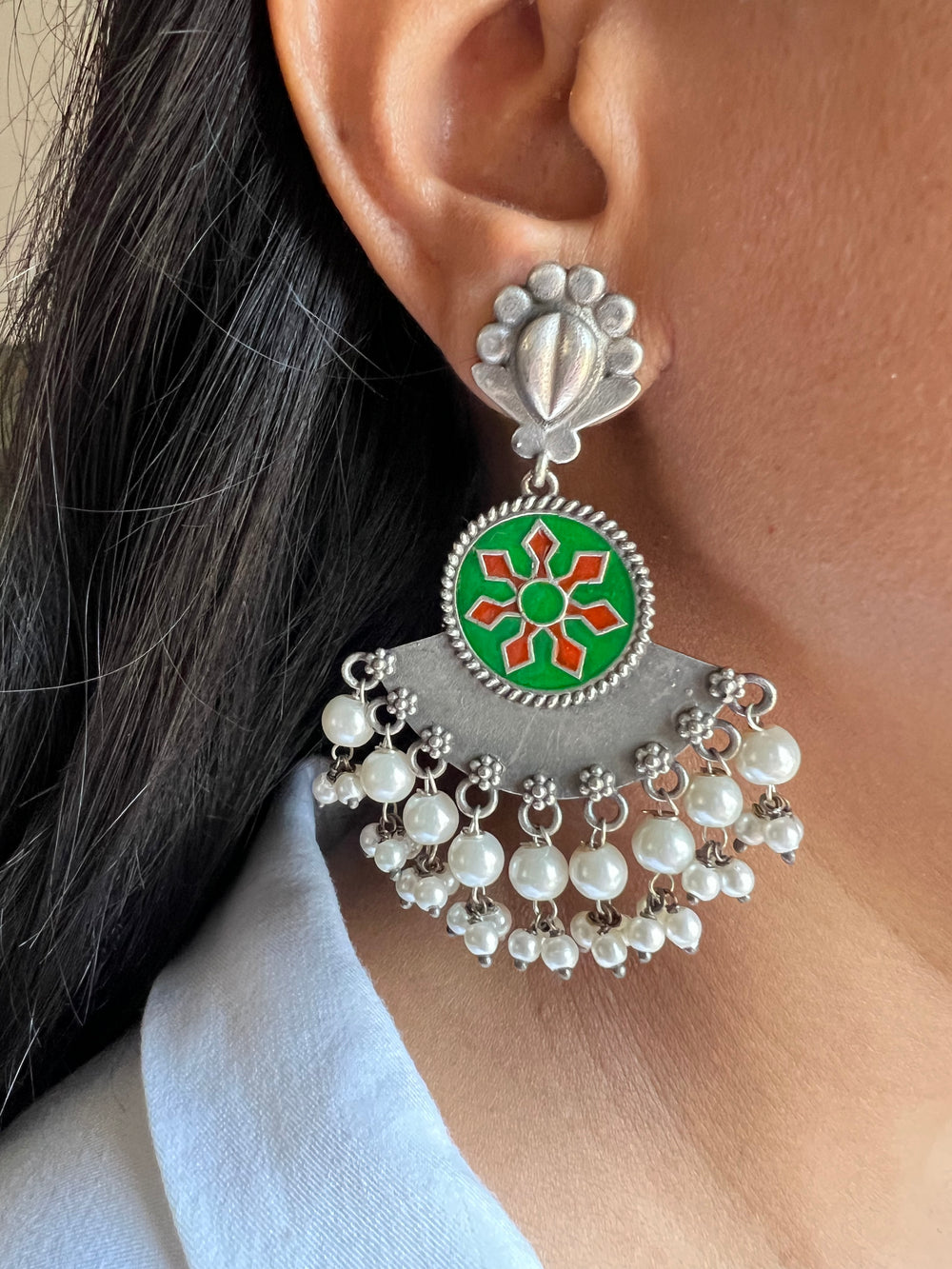 Handcrafted in Brass and stones with antique polish. Premium Quality Pick them up and make a stunning statement. The length of the earrings is 7 cm The width of the earrings is 5 cm The weight of the earrings is 34 grams per pair