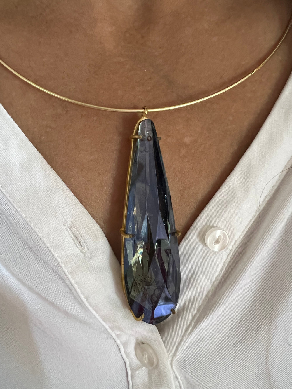 Handcrafted in brass with gold plating. Prong setting of Crystal. Weight of Necklace: 40 grams Height of pendant: 3 inches Pick it up and make a stunning statement!