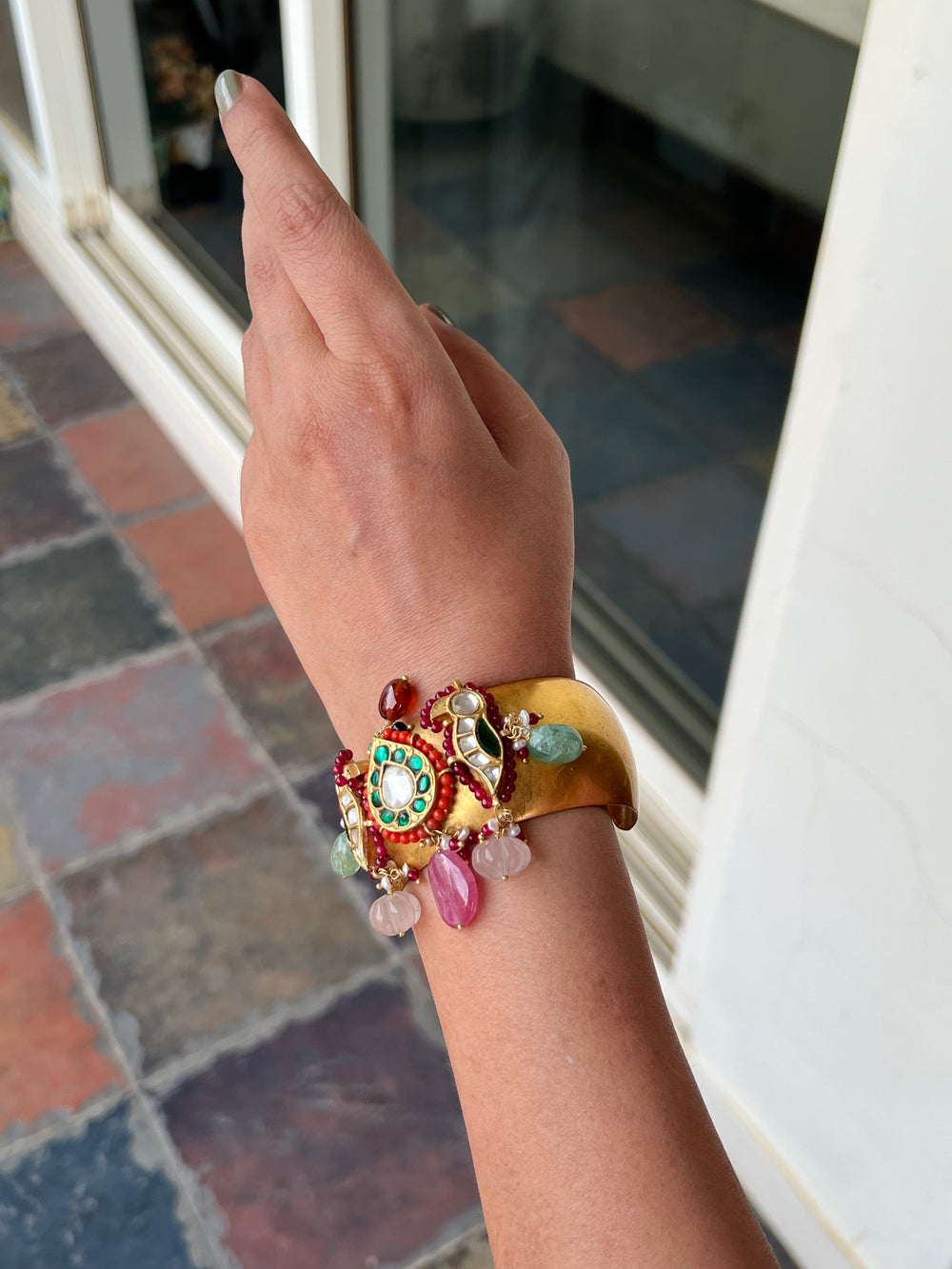 Material: Intricate, hand crafted, Pure Silver Cuff, studded with high quality Embellishments with Kundan work, made in 92.5 real silver.