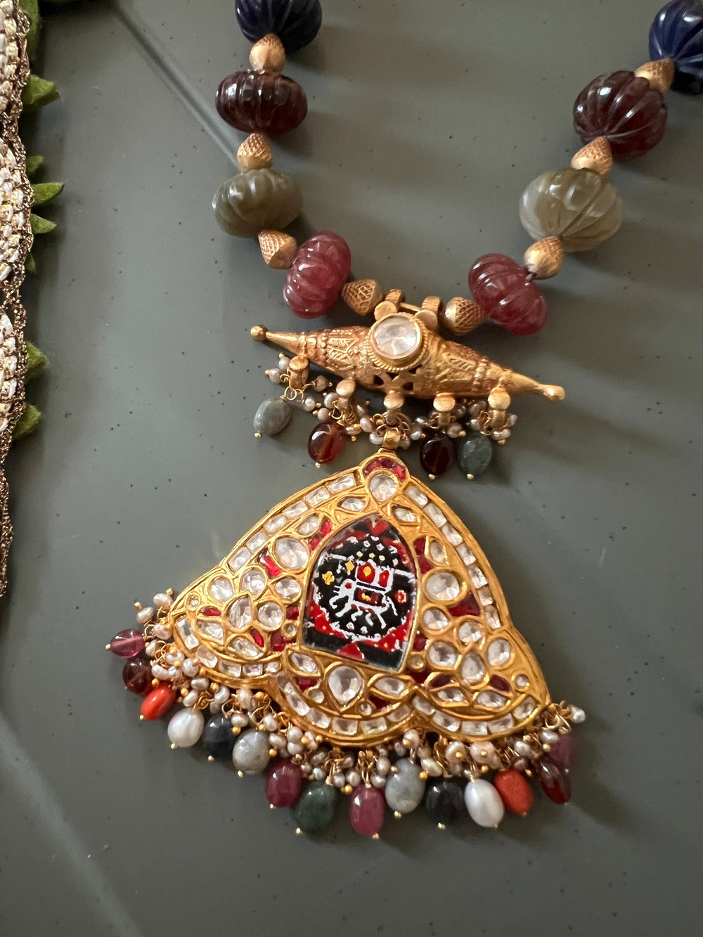 Shipping: Ready to dispatch via DHL Express, fully insured and free of cost, delivery in 3–5 business days. Make a royal statement with SHIVKA’s Handmade 925 Silver Fusion Necklace featuring a beautifully hand-painted elephant pendant. Crafted by skilled Indian artisans, this piece blends 925 silver, melon-cut multicolor gemstones, exclusive Kundan work, and gold embellishments with a luxurious antique finish. The necklace weighs 130 grams, comes with a premium adjustable dori, and is hallmarked for 925 silver purity. The pendant stands out with a height of 3.5 inches, making it the perfect standout accessory for weddings and festive occasions. Guaranteed to draw admiration and compliments.