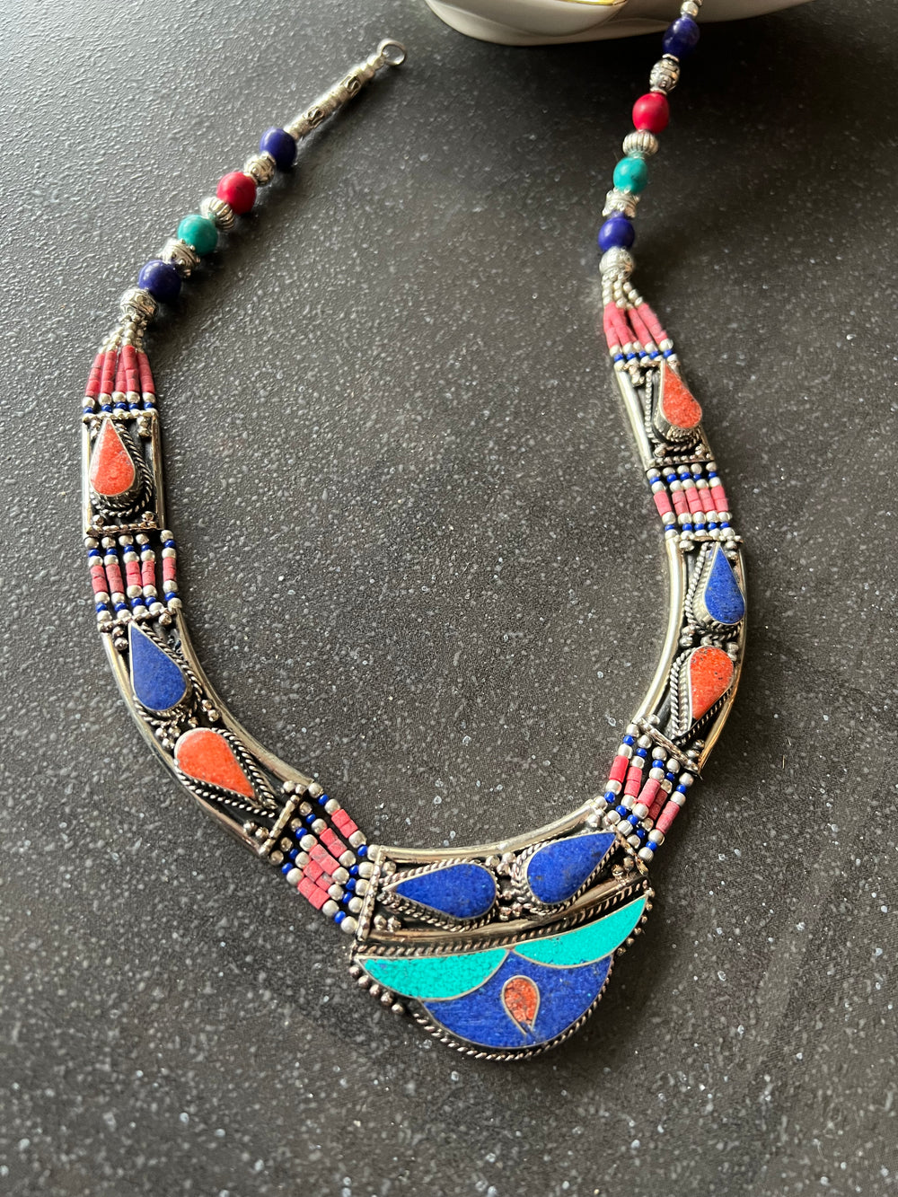 Discover the allure of the Himalayas with our captivating Statement Himalayan Necklace. Handcrafted in Nepal with premium German Silver and adorned with exquisite stones, this masterpiece showcases the essence of Himalayan artistry. Each piece is thoughtfully curated to radiate elegance and cultural charm. Embrace the spirit of the Himalayas and elevate your style with this unique and captivating necklace. Revel in the premium quality craftsmanship that exudes sophistication and beauty. Add a touch of artistic elegance to your collection with this Himalayan-inspired treasure, destined to be cherished for its distinct charm and craftsmanship. The length of the necklace when falls on the body is approximately 9 inches Necklace has Hook closure. The weight of the necklace is 125 grams