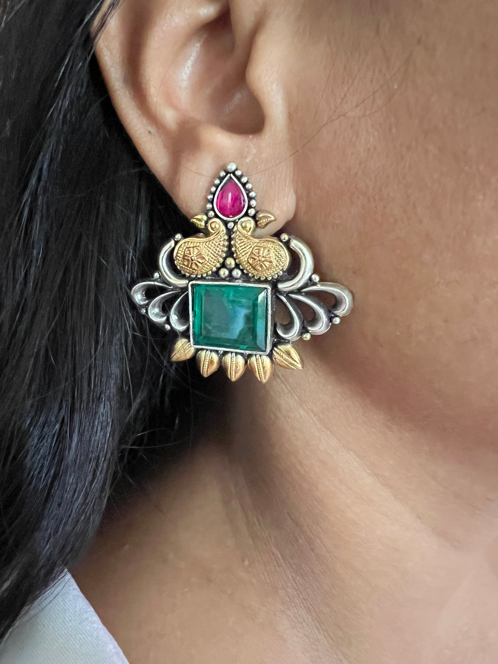 Crafted with exquisite attention to detail, the bird design adds a unique and artistic touch, while the green doublet stone creates a captivating focal point. These earrings are handcrafted by skilled artisans, ensuring quality and individuality in every pair.
